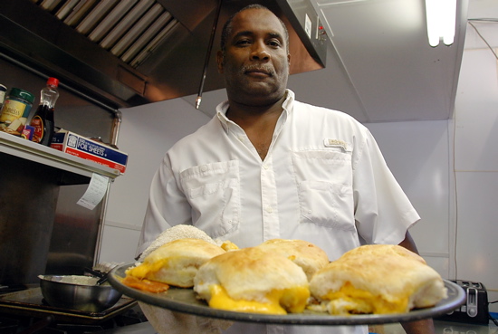 Stacey E Gibbs commutes from Merritt to Oriental. He stops by Frank’s daily for breakfast opting for sausage and pancakes with “enough syrup you can almost drink it”.For Frank, this business of mixing biscuits and fuel is nothing new. He was born into it. Born in Passaic, New Jersey, he grew up in Greenville, North Carolina where his family owned a convenience store. He now lives with his wife, who just graduated from nursing school, and two children on Alligator Loop Road.
