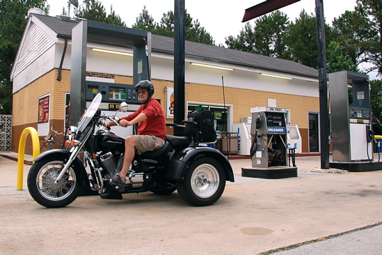 Gassing up: Cal Bridgers fills up his Honda Shadow trike at the newly installed pumps.Frank also added a grill offering takeout breakfast and lunch. If the pay at the pump option brought in new customers, it’s the grill that brought in the crowds. Mostly, they come for the biscuits.
