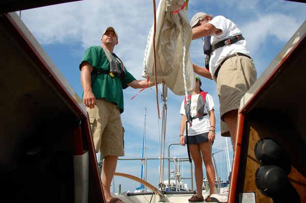 Oriental’s School of Sailing students hoist the main sail aboard one of the school’s vessels, a C&C 24. Participants during this particular session hailed from New Bern to Boston.