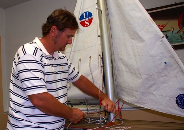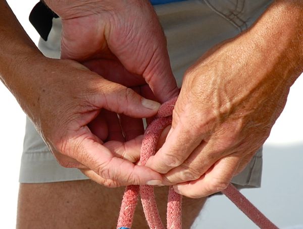 Helping hands. Classroom sessions teach students that the jib sheet is connected to the clew of the sail with a bowline knot. On the water, though, that’s easier said than tied. Here, an extra set of hands helps complete a bowline knot.