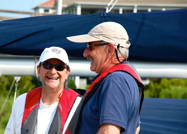 … Drew (L), who ended up sailing on another boat, enjoys a laugh with another sailor.After 14 years of teaching tacking, jibing and sail handling, Chris says it’s time to focus on a new venture. When he purchased The Silos restaurant, he had initially hoped to run both businesses. Chris recently remarried – both he and his new bride Kim agree Chris should focus on his career as restaurateur. The sailing school is for sale.
