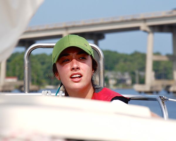 Emma Hancock of Winston-Salem checks her course as she maneuvers in front of the Oriental bridge. Emma is studying journalism at Chapel Hill University. She attended sailing school with her dad Drew who heard about the sailing program through a friend. Back on the dock her father…