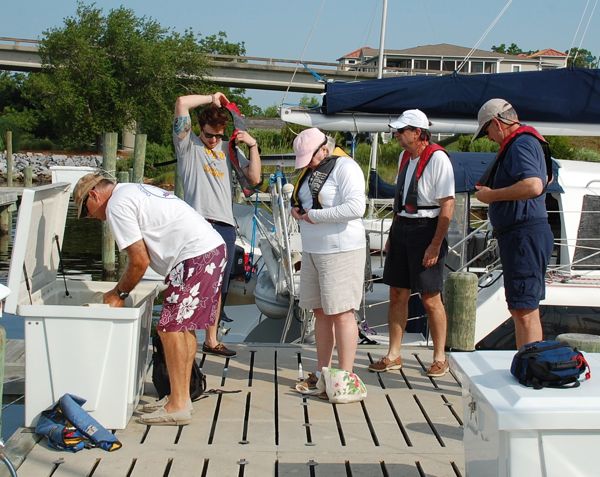 When it comes to sailing preps, some things never change. Lines need checking. Sails need prepping. Here, a recent group of school attendees don life jackets before boarding their vessels. The school’s on-water sessions are based out of Oriental Harbor Marina.While running the school, John met and married his wife Juliana. She became heavily involved in the school’s training program. Chris says, “it was really cool because it was a husband and wife team. So the girls could relate to the girls and the guys could relate to the guys.”