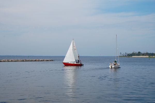 Two sailing school vessels – one motoring and one under sail – at the mouth of the Oriental anchorage. The breeze is more zephyr than brisk, a perfect time to practice light air techniques.In 1999, while John still owned the business, Chris visited Oriental for a weekend getaway. Accompanying him was his then bride Emily. They stayed at the Cartwright House Bed and Breakfast. They had no intention of buying a sailing school.
