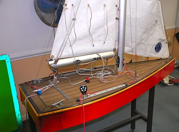 The school’s model sailboat. Jib, mainsail, upper shrouds, lower shrouds, spreaders, mast, boom and main halyard. They’re all there. Chris says he built the model, “after hurricane Isabel killed the old one.”