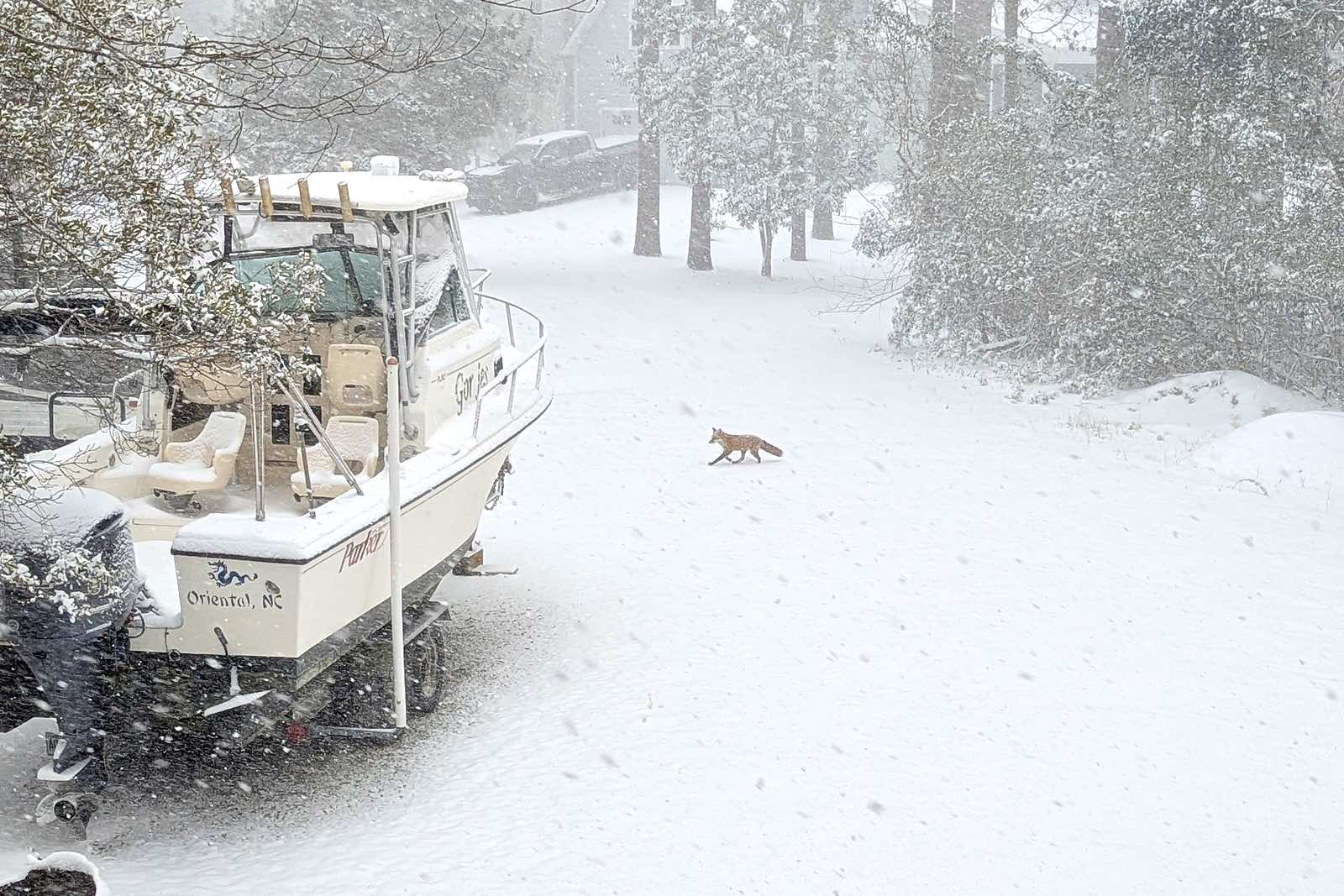A fox crosses through the snow at a home on Smith Creek. (Gordon Pickett photo)A light snow started Friday night, with little accumulation Saturday morning. By Saturday afternoon, businesses were closing early and the snow was piling up.