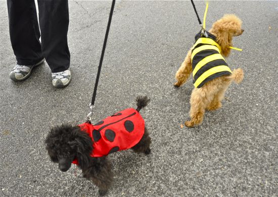 Deb Khouri’s dogs, dressed as a ladybug and a bee. The attractant nectar in the air at the parade was that of other dogs…