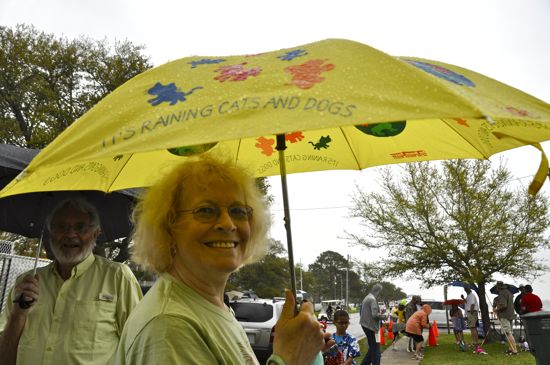 No cats in sight but it was raining on the dogs and people. Sue Gill takes shelter under her umbrella in the rain-shortened 2012 Pet Parade.Although the rains abbreviated things — the parade and awards ceremony were over with in half an hour — $1500 was still raised for the Pamlico Animal Welfare Society and PAWS’ efforts to spay and neuter pets and find homes for abandoned pets.