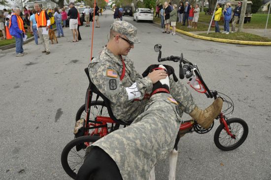 Grand Marshals for the 2012 parade was the team of Jeremy Munsert of Clayton and his dog, Page, here rounding the first corner. At right is Jackie Schmidt who trained Page and other Great Danes thru the PPAWS “Pets and People Assisting Wounded Warriors” program. Jackie’s also active with (single P) PAWS, the Pamlico Animal Welfare Society, which organizes the parade.This year the parade showcased the efforts of the similarly named PPAWS or the “People and Pets Assisting Wounded Warriors.” The Grand Marshals of the parade were Jeremy Munsert of the US Army who was injured after his 15-month tour in Iraq, and his dog Page. They are part of the Wounded Warrior program. Page, a Great Dane, who was trained locally by Jackie Schmidt, has helped Jeremy recover from injuries.