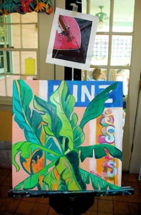 Sue’s working table. Her paintings tap often in to what she calls, Bahamian colors. Teal, coral and yellow predominate. Some of those sun saturated colors from the islands even show up even in paintings of a rocky Maine shore.