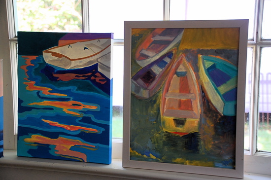 Sue’s back porch window develops a water view with some of her paintings.A native of Pennsylvania, Sue’s been living in Oriental for about 25 years and has drawn on the water here for ideas and inspirations for many of her paintings. Passing the harbor on the way back from a medical appointment one day this summer, she commented that so much of her heart and soul are linked to that part of town. She doesn’t get down there as much as she’d like right now, but has a backlog of photos and a sketch book of travels to Maine and New Zealand to tap in to. And she’s also looking to take on some new subject matter.