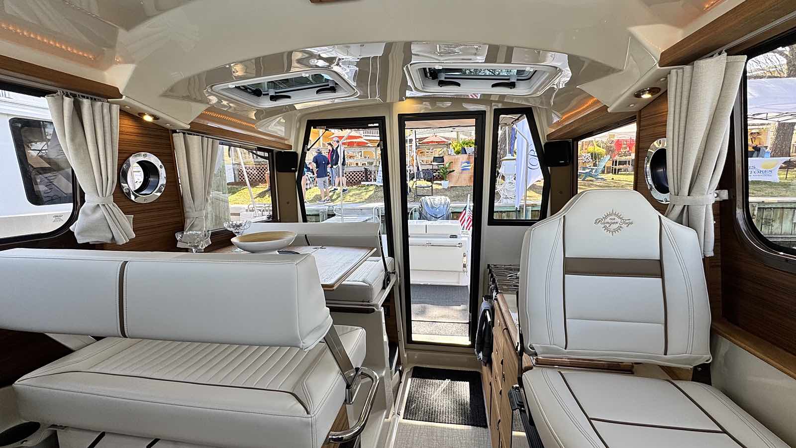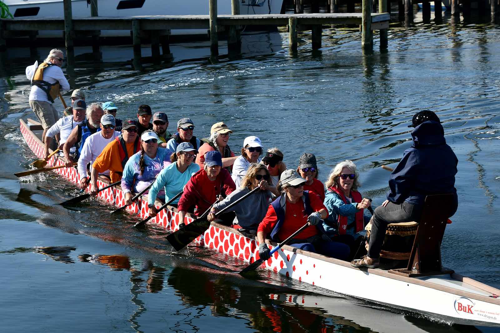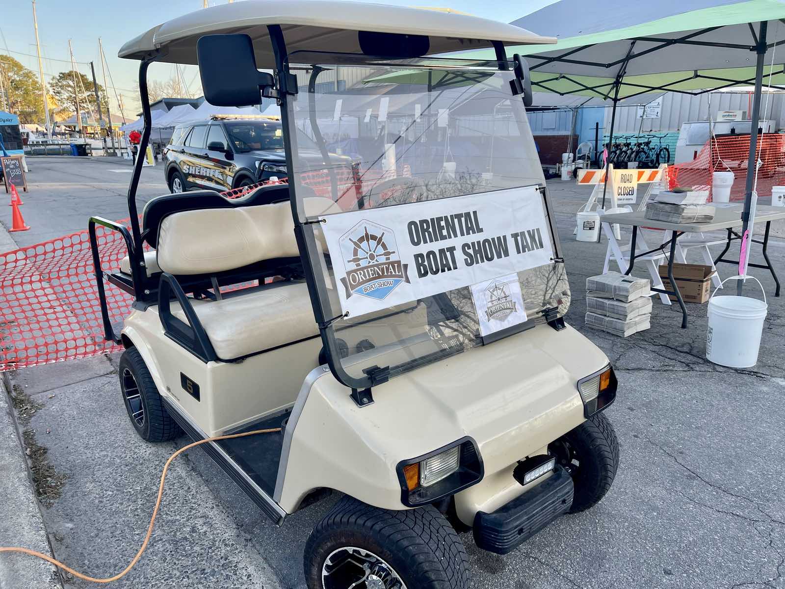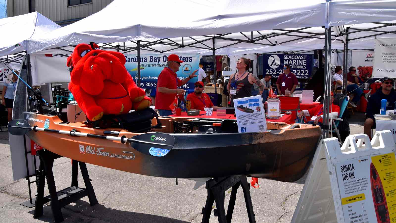 Billy Creech and Manager Ann of West Marine.Joy, a wooden boat built by Hank Hinckley, sold during the show.Selling tickets for the 50/50 raffle.Interior of a Ranger Tug 27 for sale, through Pocket Yacht of New Bern.Collins, Inc of Smithfield had power vessels at the docks.Rotary Club President Carol DeMoranville.Local vendors Evolution Sails, Beta Marine, and SeaCoast Marine.Under the tent, Curtis Stokes tells the audience what to look for when buying a boat.One of Bow to Stern’s rental vessels: a 40’ Leopard catamaran.A 40’ Leopard catamaran, ready to rent from Bow to Stern Boating.The Dragon Boat Club visits the Boat Show during practice.Arts & crafts vendors were stationed on the lawn at Oriental Marina & Inn. At the top, Charlie Frye poses with is painting of Blackbeard the pirate.Need an anchor? There were experienced ones for sale.Ranger Tugs docked near Oriental Marina & Inn.Interior of a Jeanneau, sold through Norton Yachts.The front row seat on a power boat.Not boat bits, but still useful on a boat trip: soap, t-shirts, and cigars.The Boat Show taxi. Golf Carts were the main mode of motorized transport.