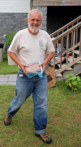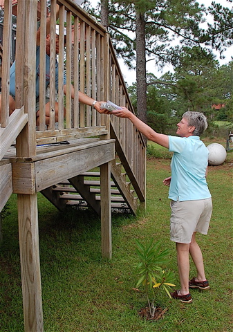 Melydia Edge, who came in last last year and won a giant zucchini for her efforts. For her 4th place finish this year, the captain of “Slainte”, a Pacific Seacraft 31, won a loaf of zucchini bread. It was presented thru the banister of the stairs. That’s Nick’s hand at left.