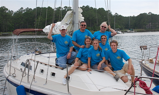 The turquoise-clad crew of Second Wind, revealed. Jim Miller, Jacques and Susan Miller in back, while in front are Joyce Bellassai, Carolyn Bellassai, Gina Mills and Andy Facemire.Race Results1. Nevermoore – Brian Brown – Moore 24 3:13:43