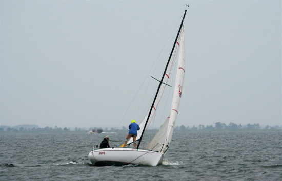 For a while Saturday, it was fine racing weather for a cruising boat such as the Pacific Seacraft 31 “Slainte”. The squall that settled over the race course prompted a half hour delay for the start, during which the squall passed. Winds went from 22 knots to about 10. Still,“Slainte” did well with a fourth place finish. (Brian Palmer photo)[page]