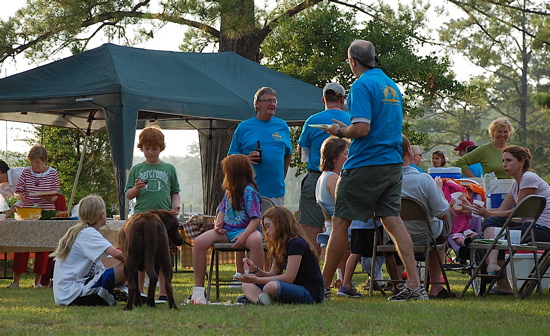 After the race, about 100 people gathered at Ensign Harbor Marina, aka Nick and Jeannette Santoro’s place, where the Yacht and Tractor Club potluck has taken place for 19 years. Pig was served, and a potluck table laid out.