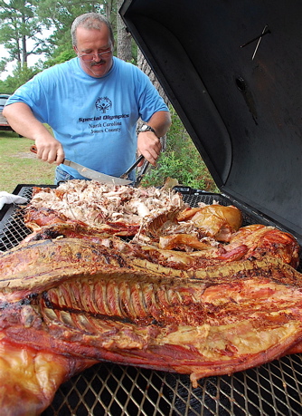 Jeannette and Nick Santoro, who’ve been hosting the WYTC event for 19 years, at the waterside of Ensign Harbor Marina.Berkeley Hill of Reelsboro has been cooking the pig for the WYTC race for several years. When he’s not doing this, he’s an EMT with Pamlico Rescue.