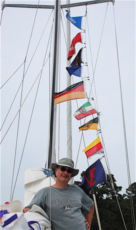 Stefan Ufer says he has still more burgees. Several on display Saturday were from Germany, including one from his hometown of Ulm. Stefan’s boat, “Layla” was last across the finish line.