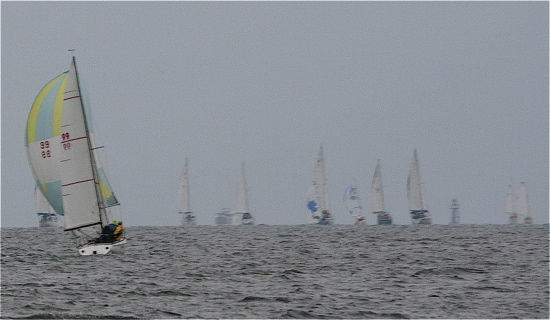 Some of the field in the WYTC Regatta. That spinnaker helped “Nevermoore” catch up and then overtake the rest of the fleet, and win the race. (Brian Palmer photo)