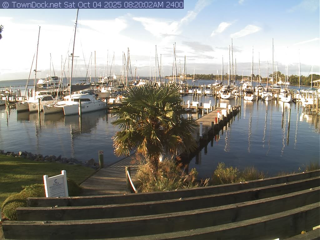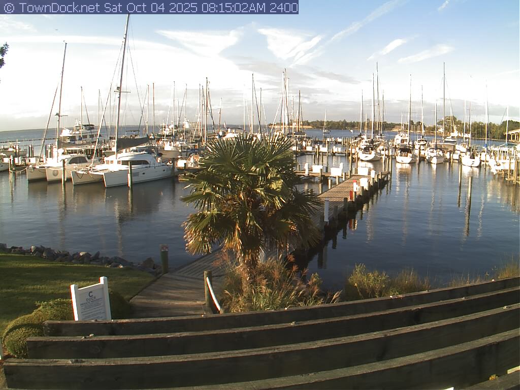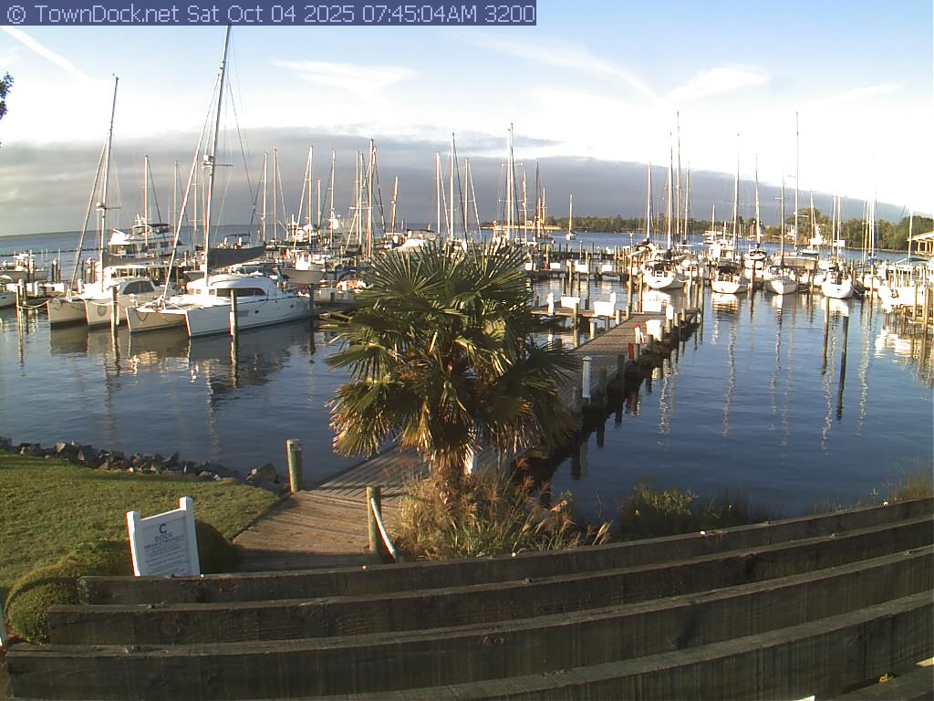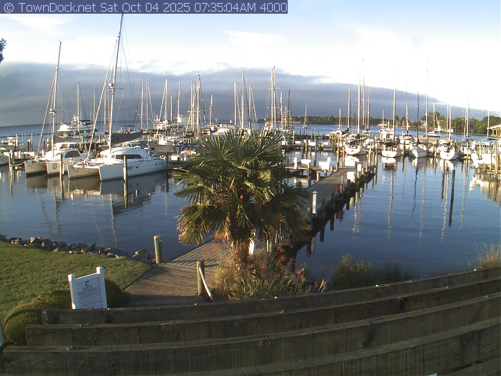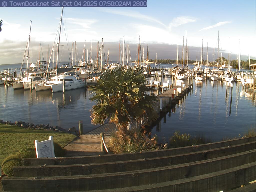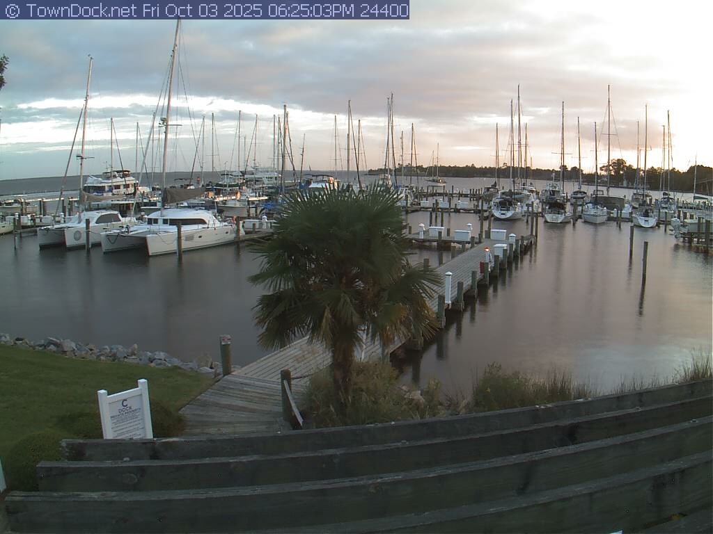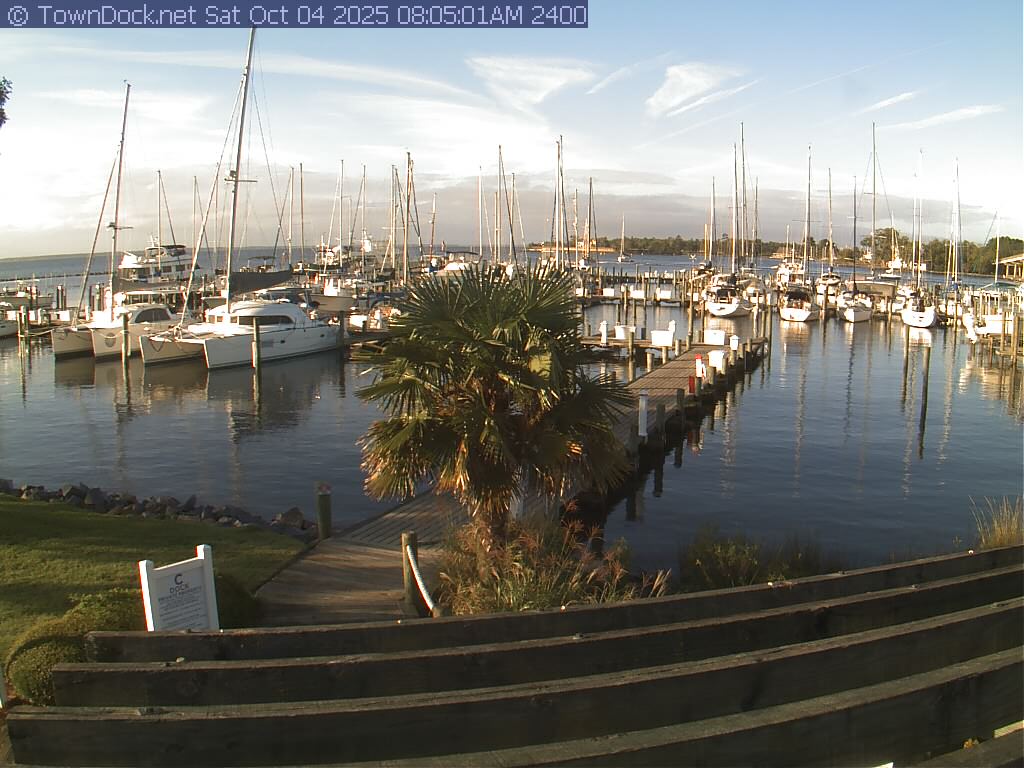 shows Oriental Harbor Village Marina, with the Oriental anchorage & Neuse River in the background. OHVM Cam takes a new picture every five minutes from dawn til just before dusk. Click on the image to see a larger version. Once you see that larger version, you can click (see arrow at right) to go back in time and see recent photos. Harbor Cam currently takes photos from 6:40am to 6:30pm.