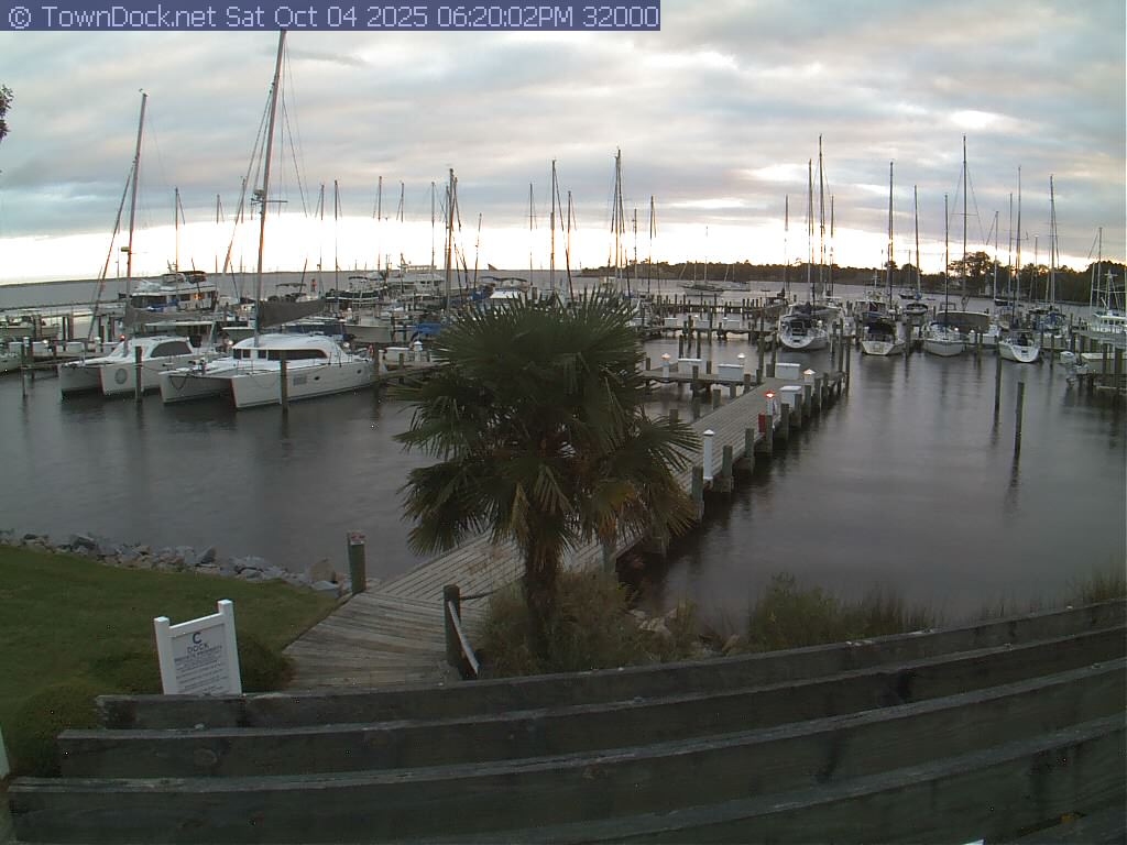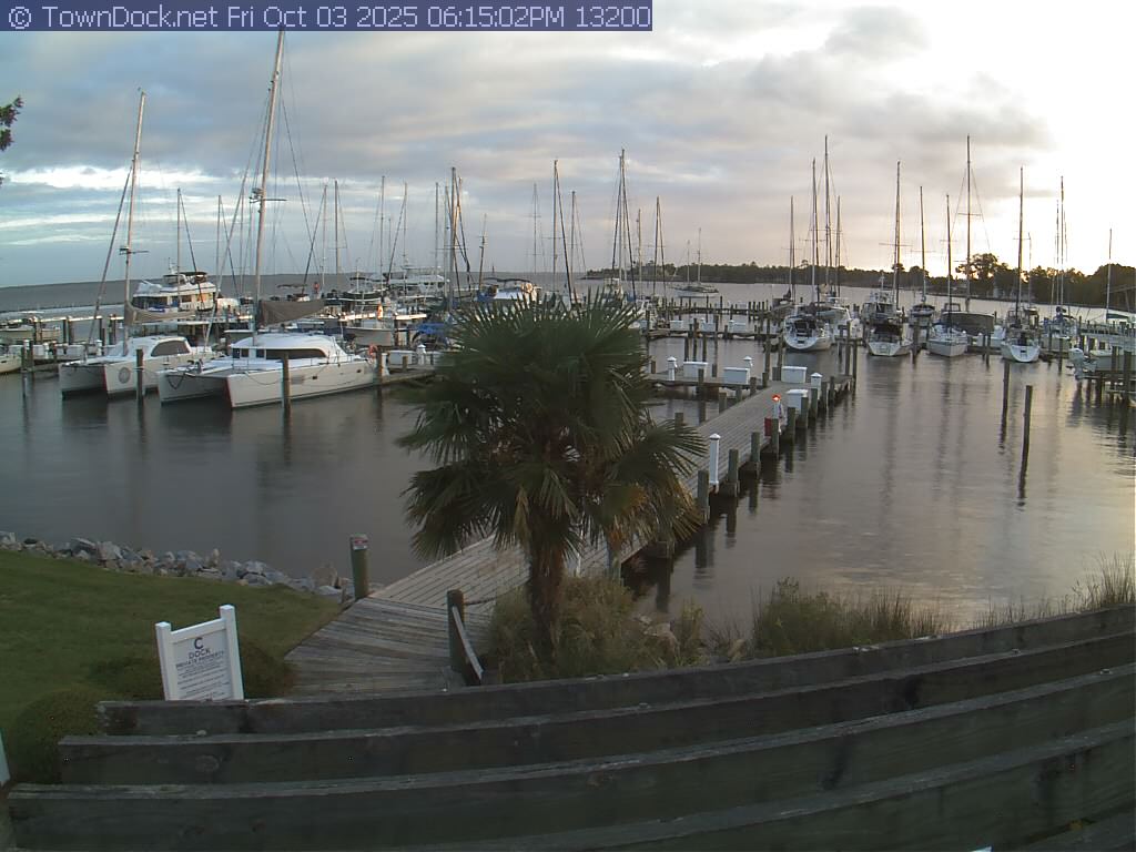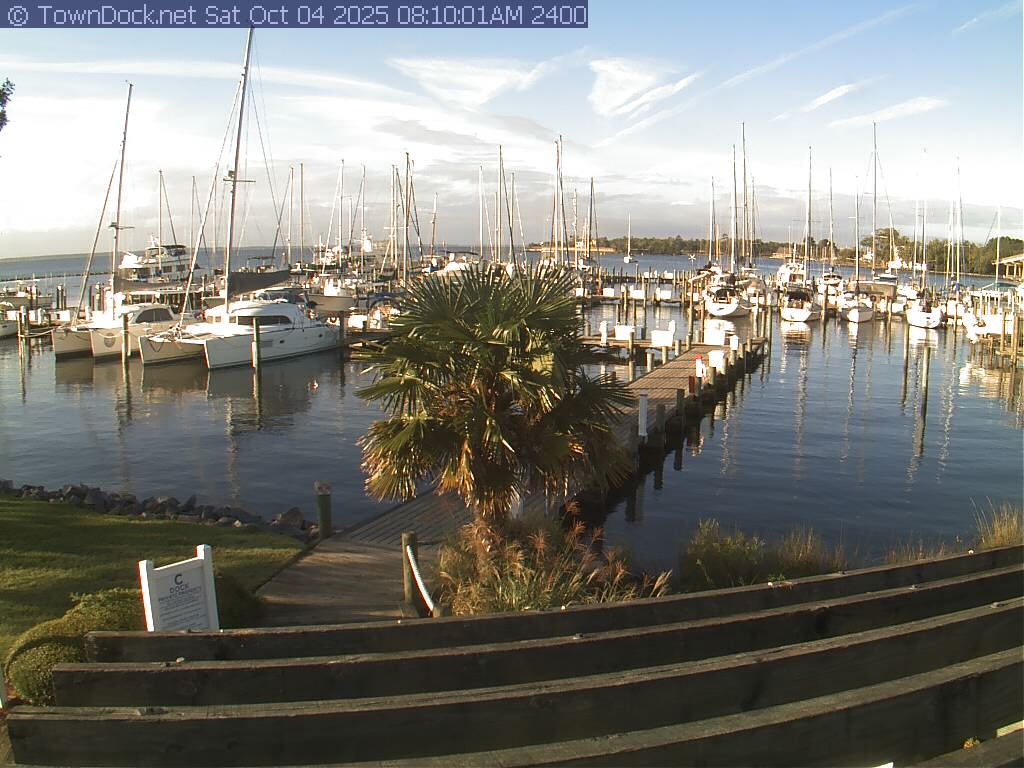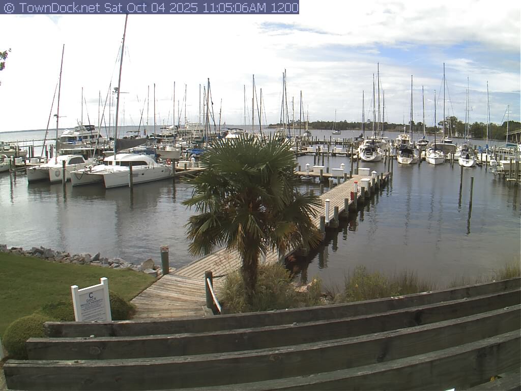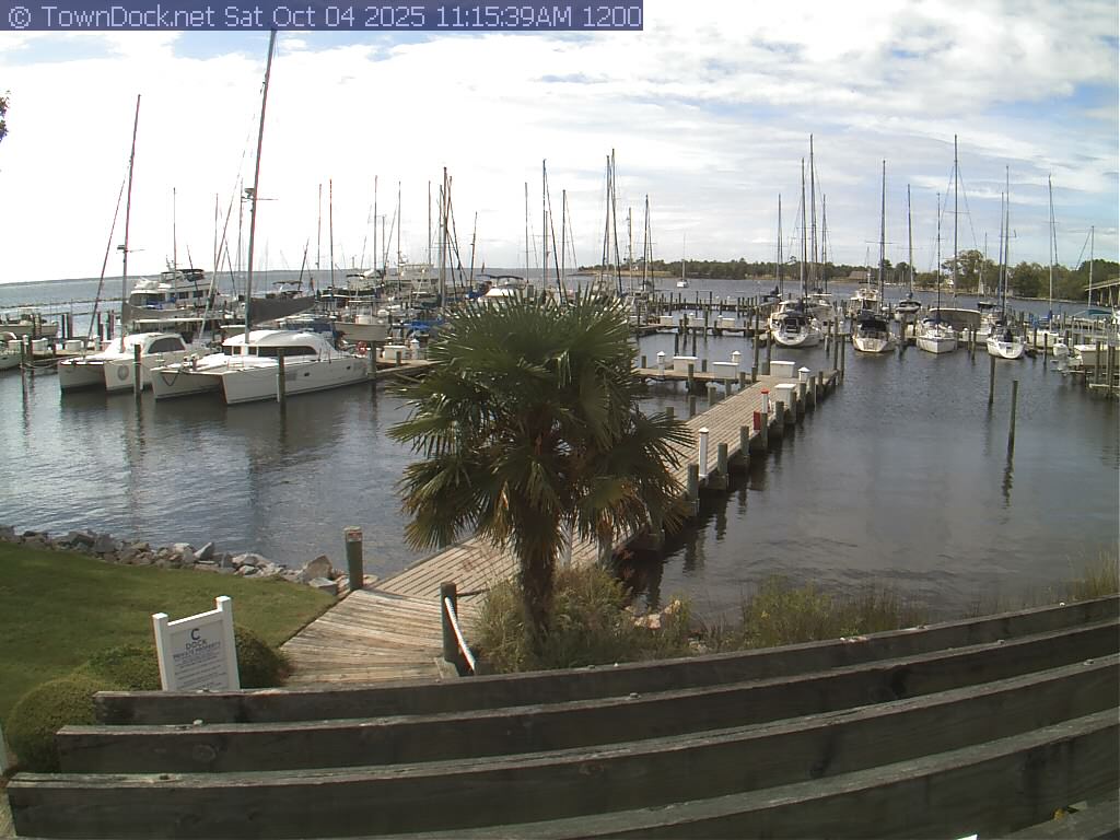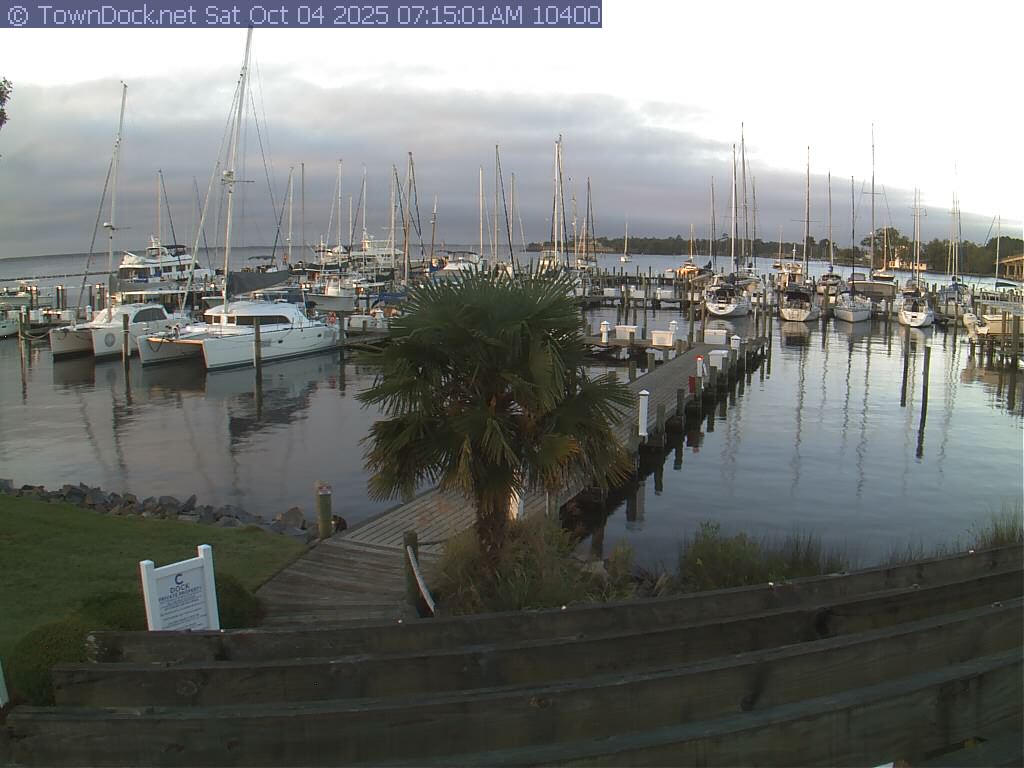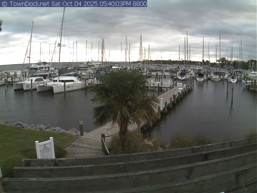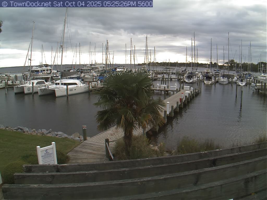 shows Oriental Harbor Village Marina, with the Oriental anchorage & Neuse River in the background. OHVM Cam takes a new picture every five minutes from dawn til just before dusk. Click on the image to see a larger version. Once you see that larger version, you can click (see arrow at right) to go back in time and see recent photos. Harbor Cam currently takes photos from 6:40am to 6:30pm.