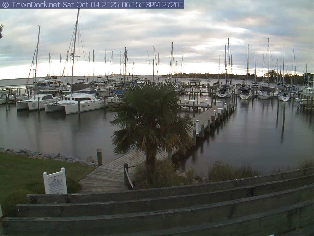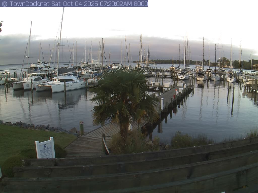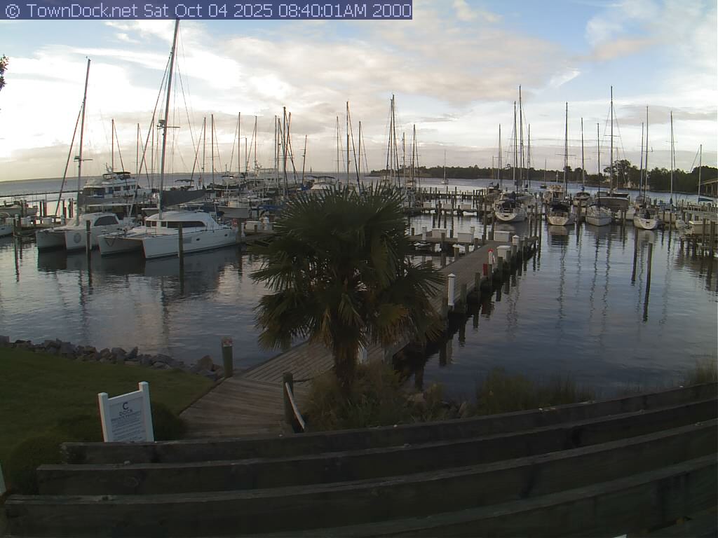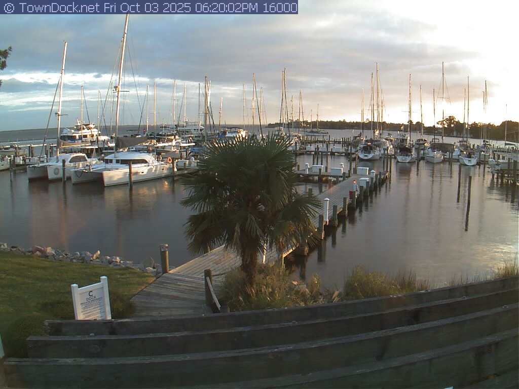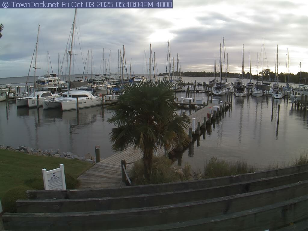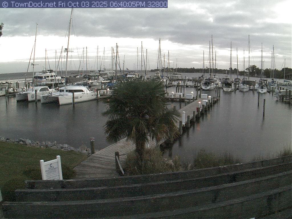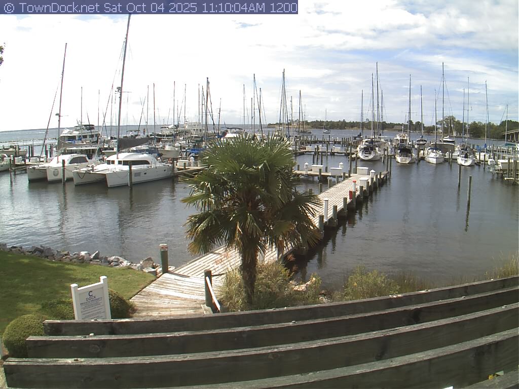 shows Oriental Harbor Village Marina, with the Oriental anchorage & Neuse River in the background. OHVM Cam takes a new picture every five minutes from dawn til just before dusk. Click on the image to see a larger version. Once you see that larger version, you can click (see arrow at right) to go back in time and see recent photos. Harbor Cam currently takes photos from 6:40am to 6:30pm.