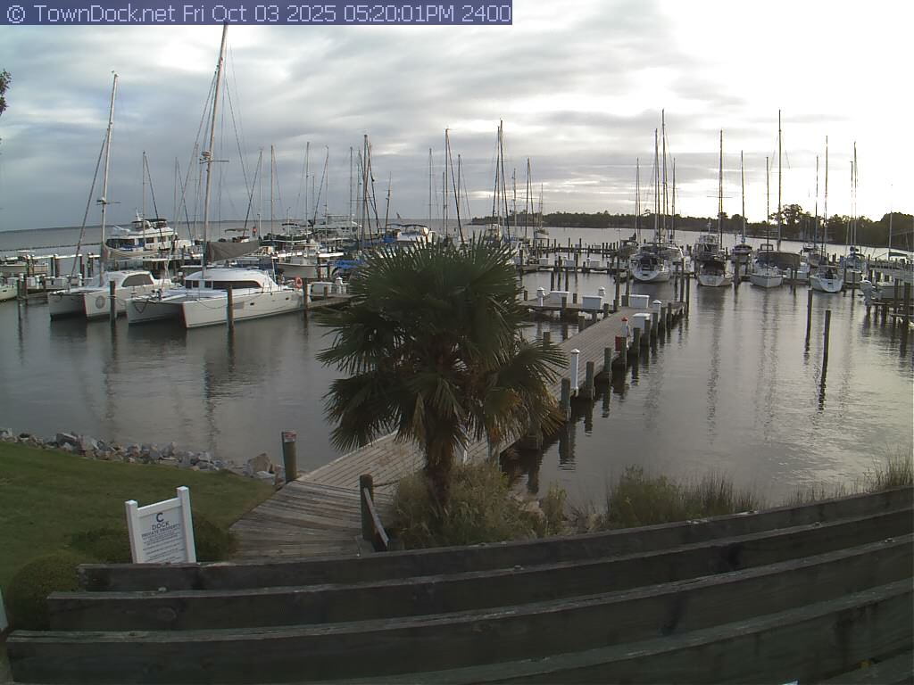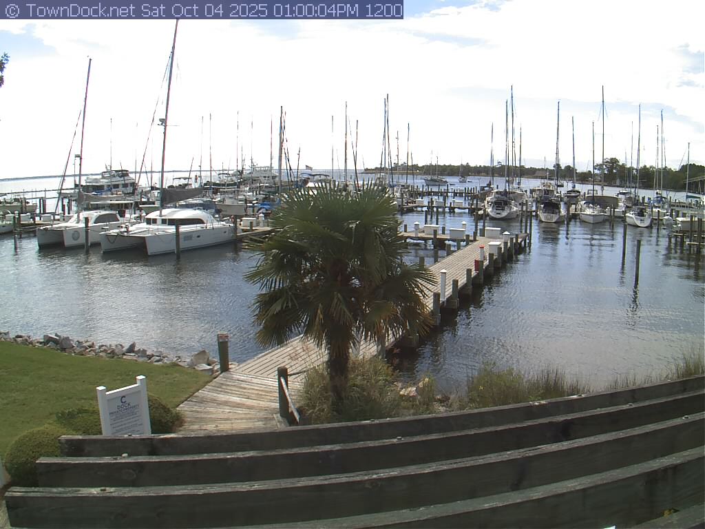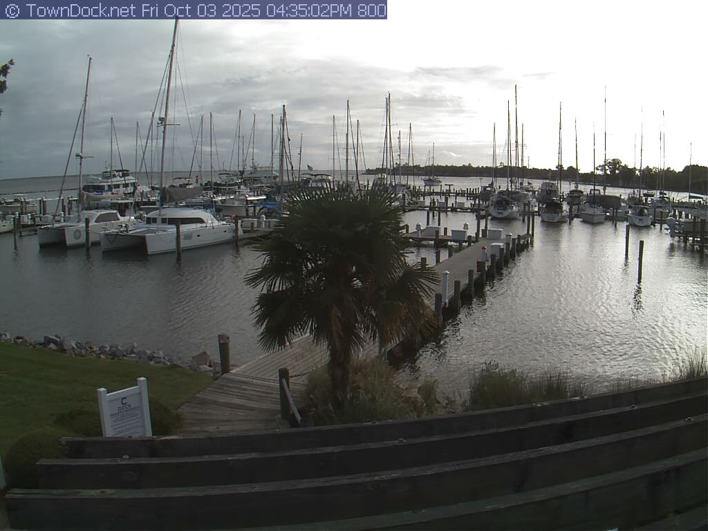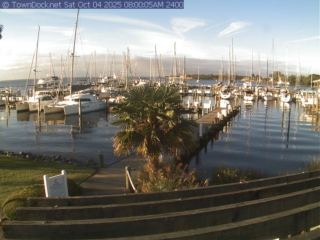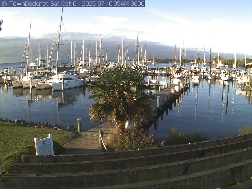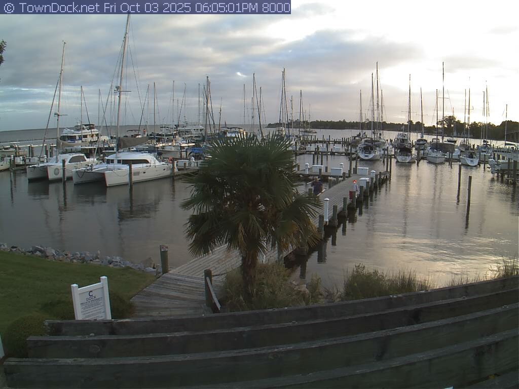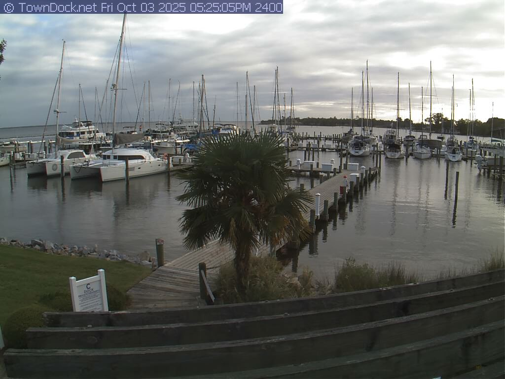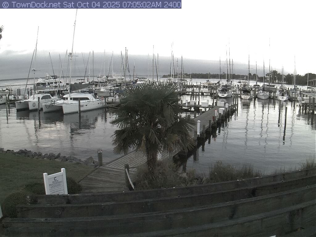 shows Oriental Harbor Village Marina, with the Oriental anchorage & Neuse River in the background. OHVM Cam takes a new picture every five minutes from dawn til just before dusk. Click on the image to see a larger version. Once you see that larger version, you can click (see arrow at right) to go back in time and see recent photos. Harbor Cam currently takes photos from 6:40am to 6:30pm.