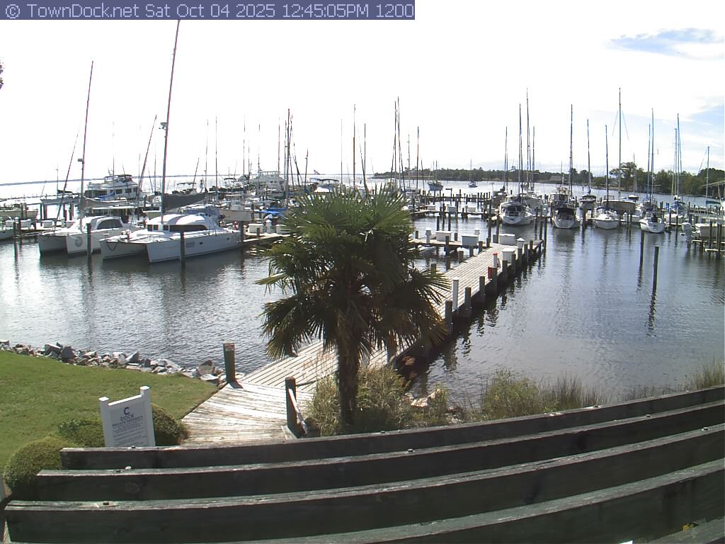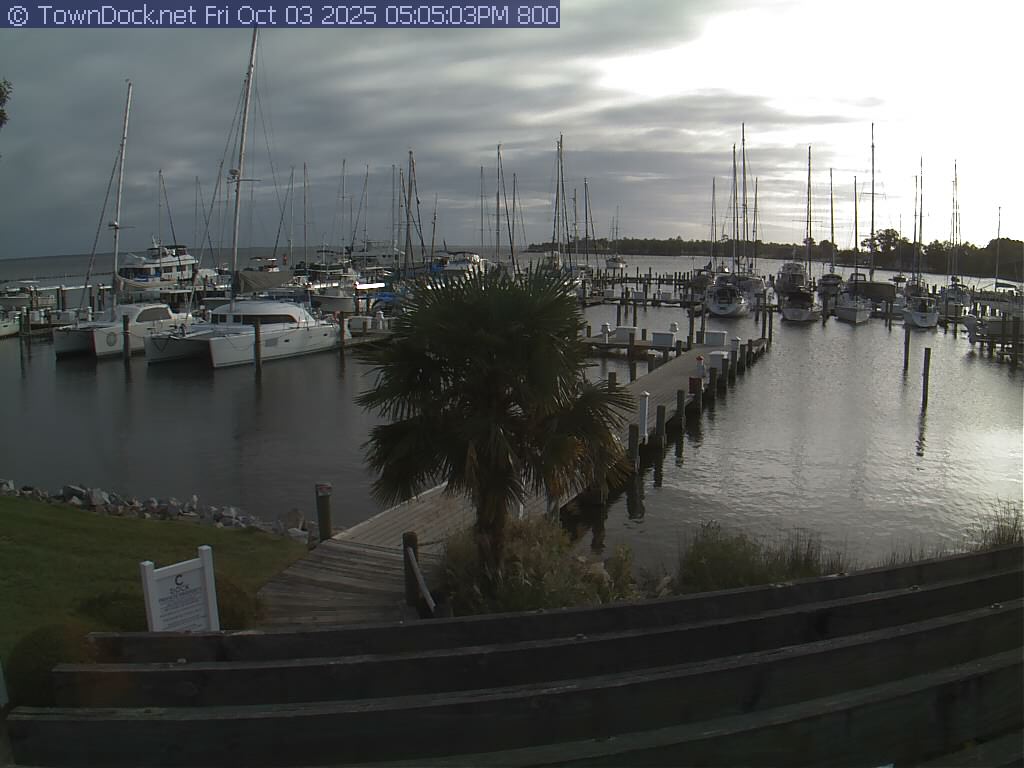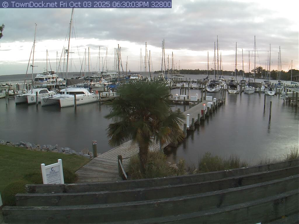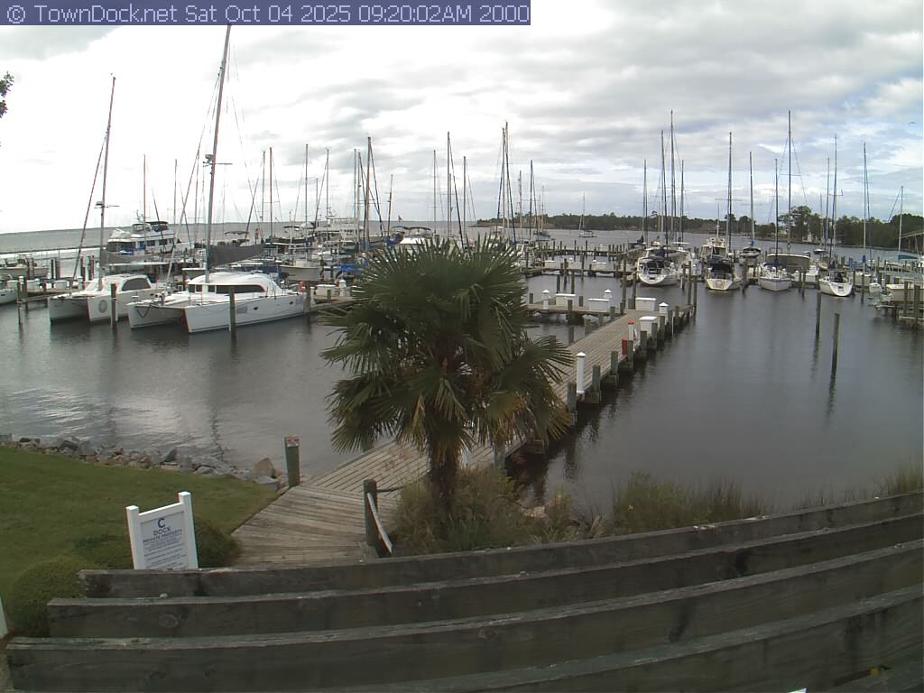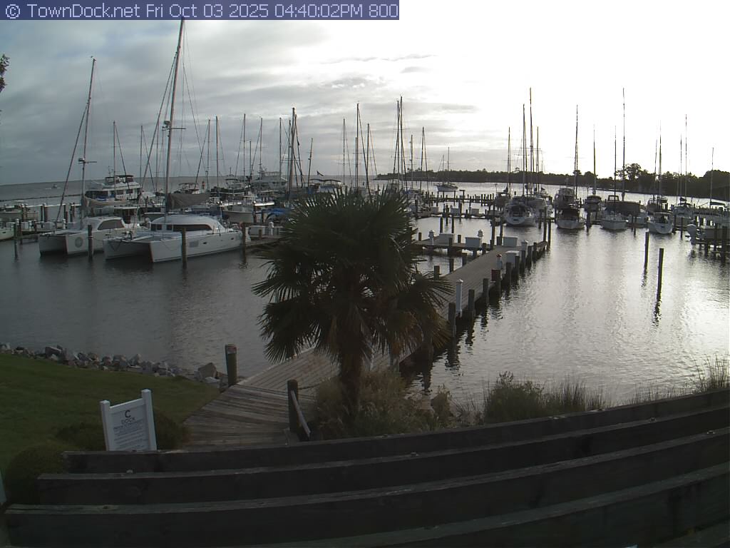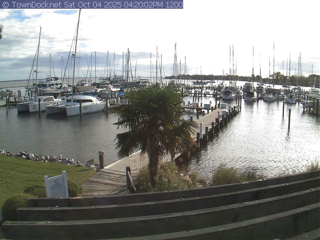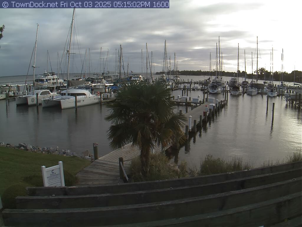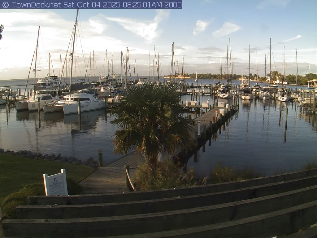 shows Oriental Harbor Village Marina, with the Oriental anchorage & Neuse River in the background. OHVM Cam takes a new picture every five minutes from dawn til just before dusk. Click on the image to see a larger version. Once you see that larger version, you can click (see arrow at right) to go back in time and see recent photos. Harbor Cam currently takes photos from 6:40am to 6:30pm.