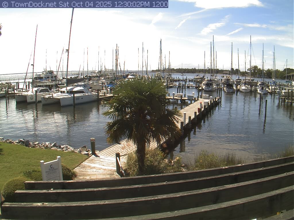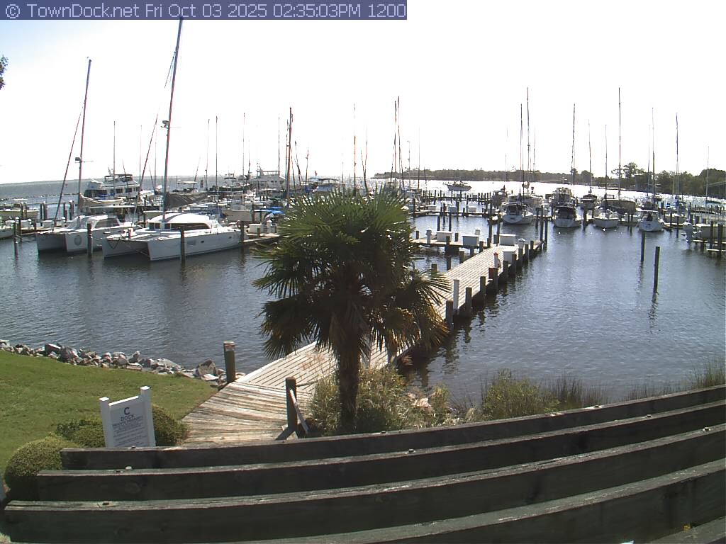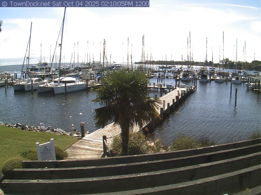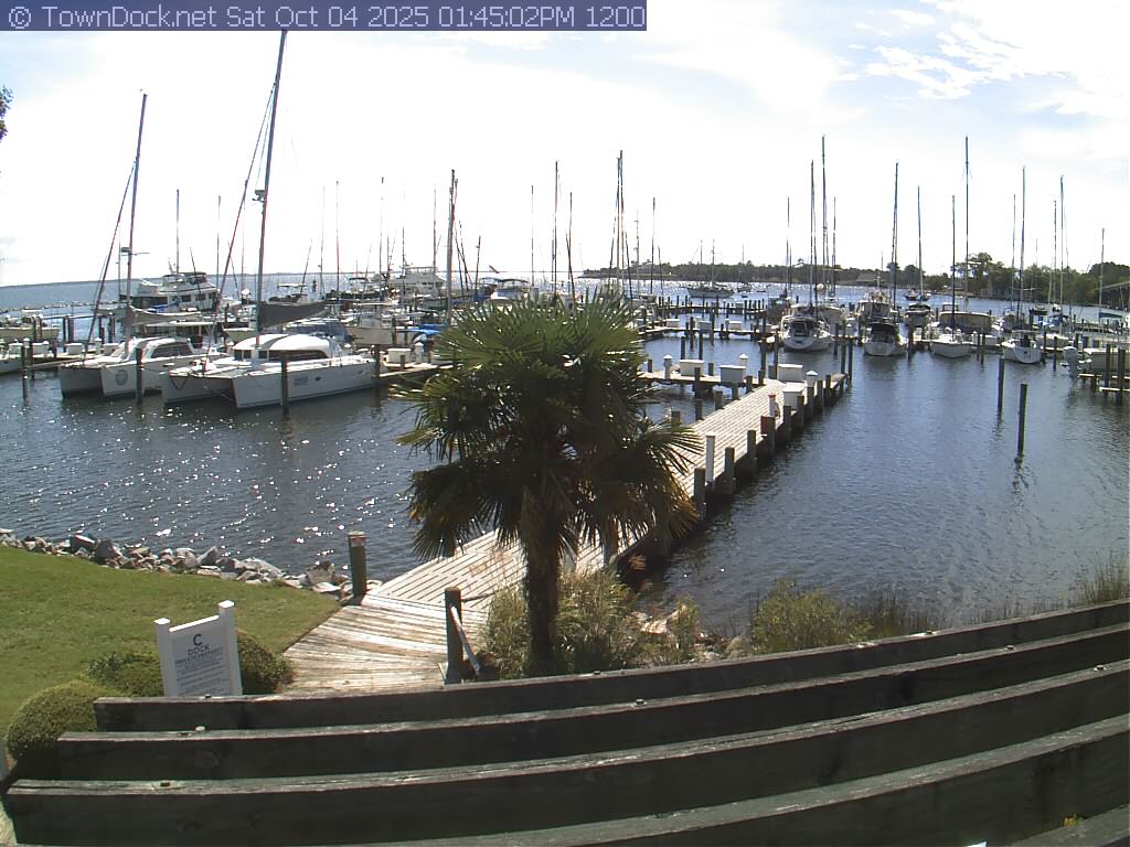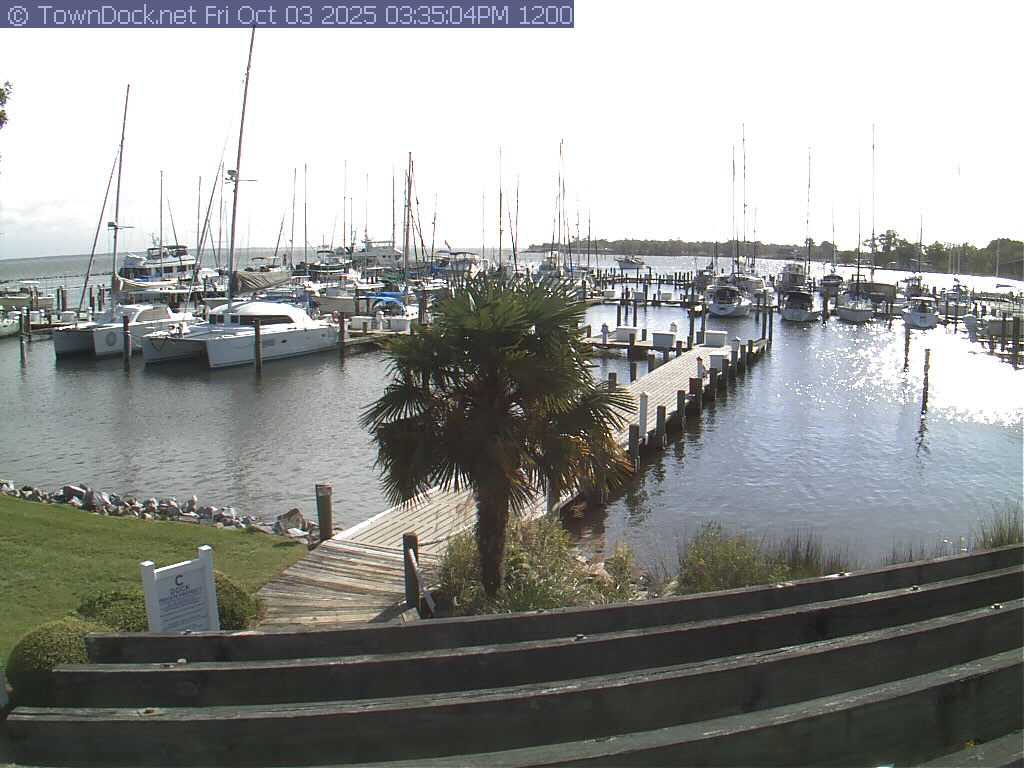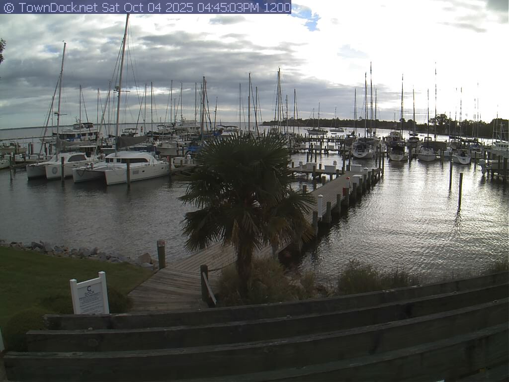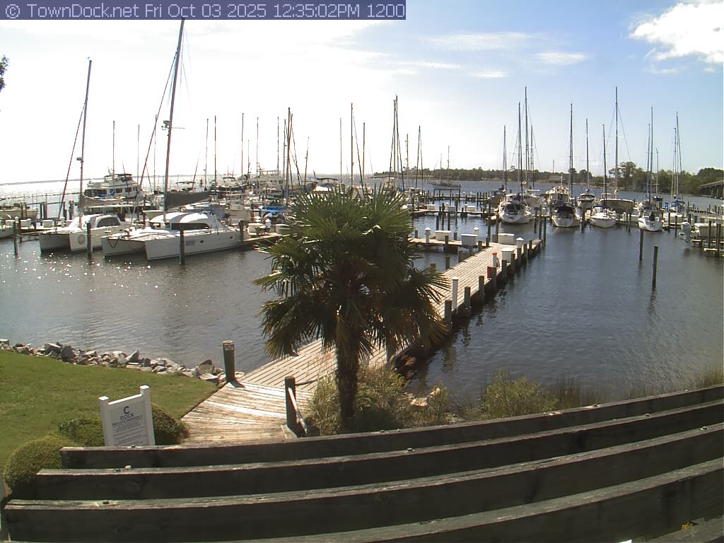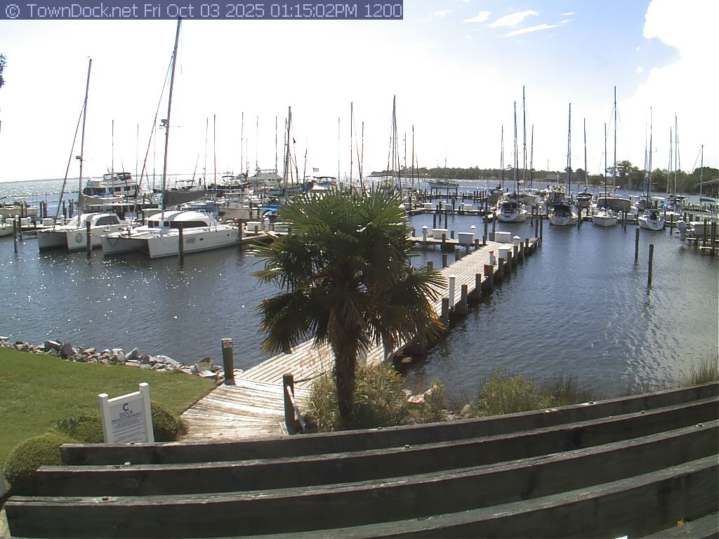 shows Oriental Harbor Village Marina, with the Oriental anchorage & Neuse River in the background. OHVM Cam takes a new picture every five minutes from dawn til just before dusk. Click on the image to see a larger version. Once you see that larger version, you can click (see arrow at right) to go back in time and see recent photos. Harbor Cam currently takes photos from 6:40am to 6:30pm.