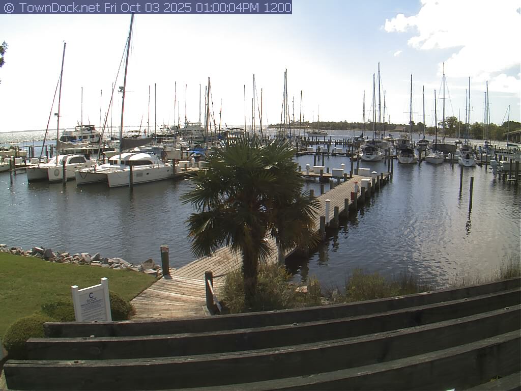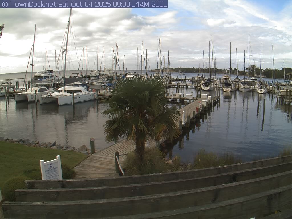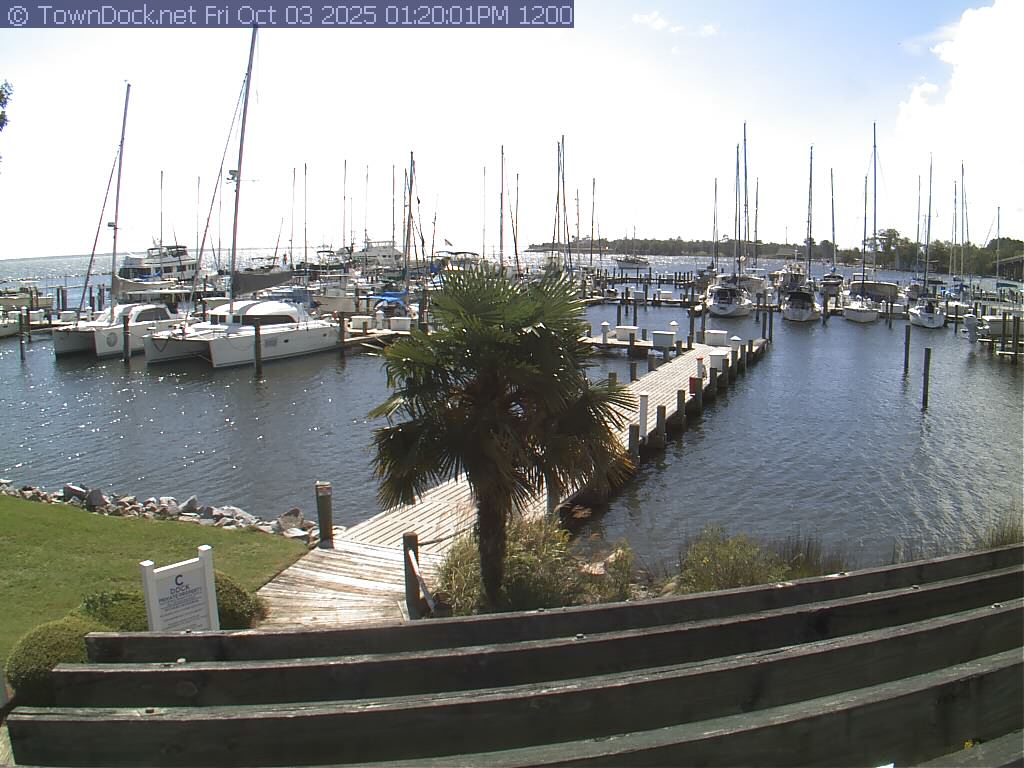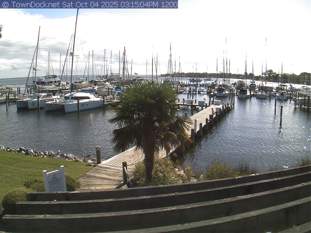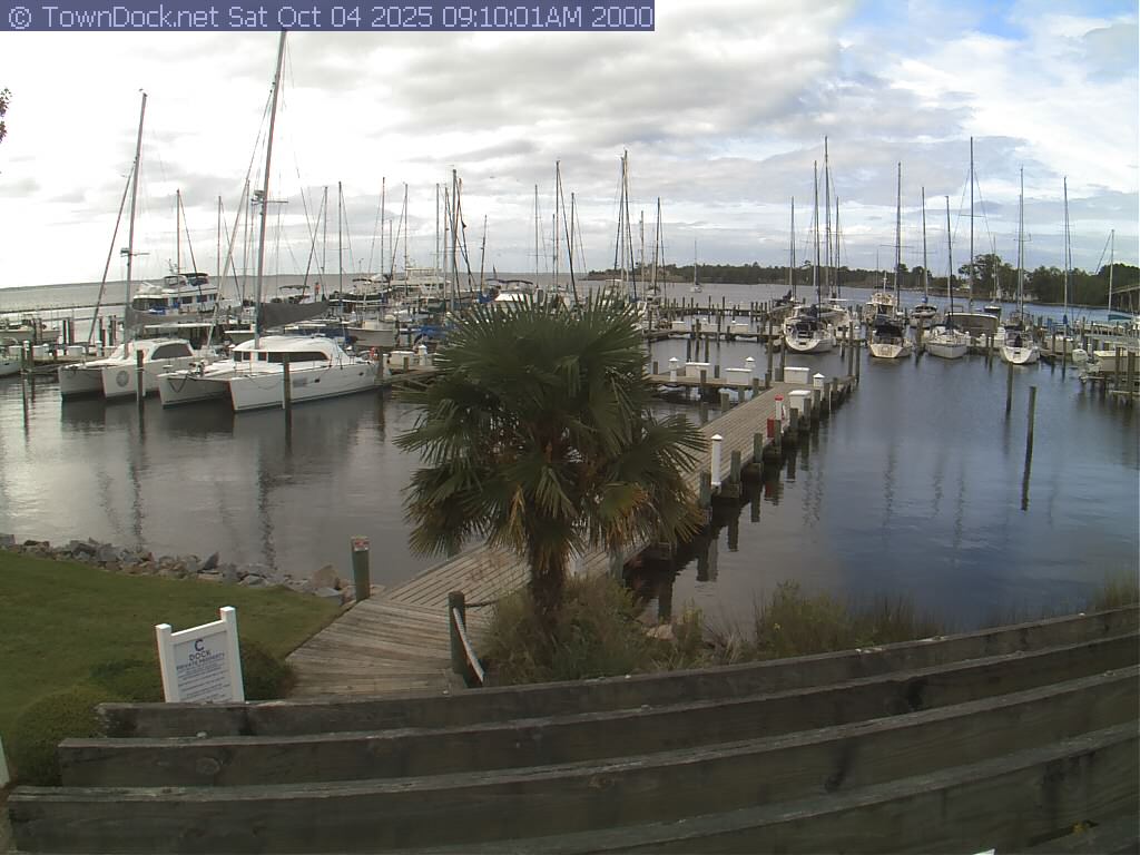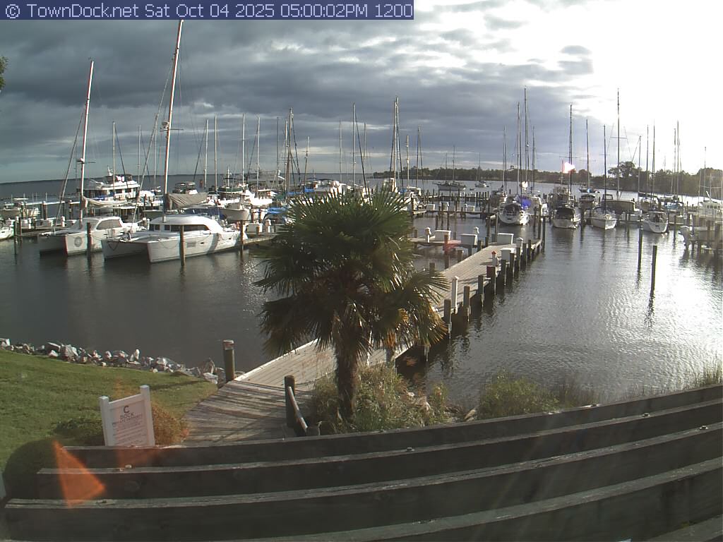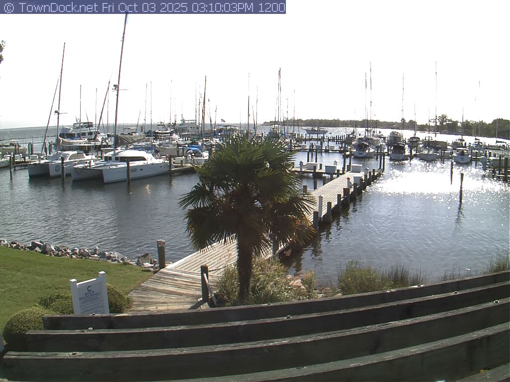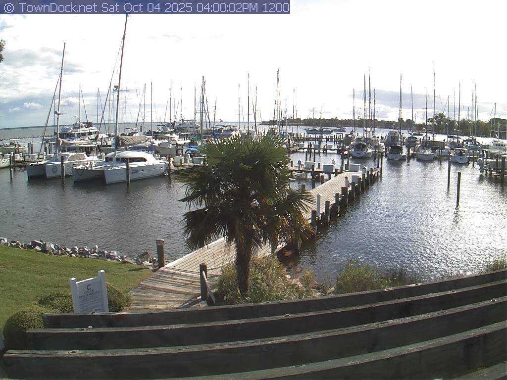 shows Oriental Harbor Village Marina, with the Oriental anchorage & Neuse River in the background. OHVM Cam takes a new picture every five minutes from dawn til just before dusk. Click on the image to see a larger version. Once you see that larger version, you can click (see arrow at right) to go back in time and see recent photos. Harbor Cam currently takes photos from 6:40am to 6:30pm.