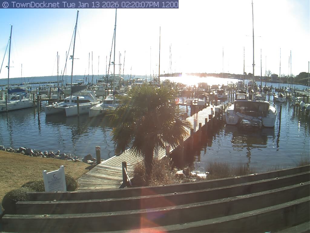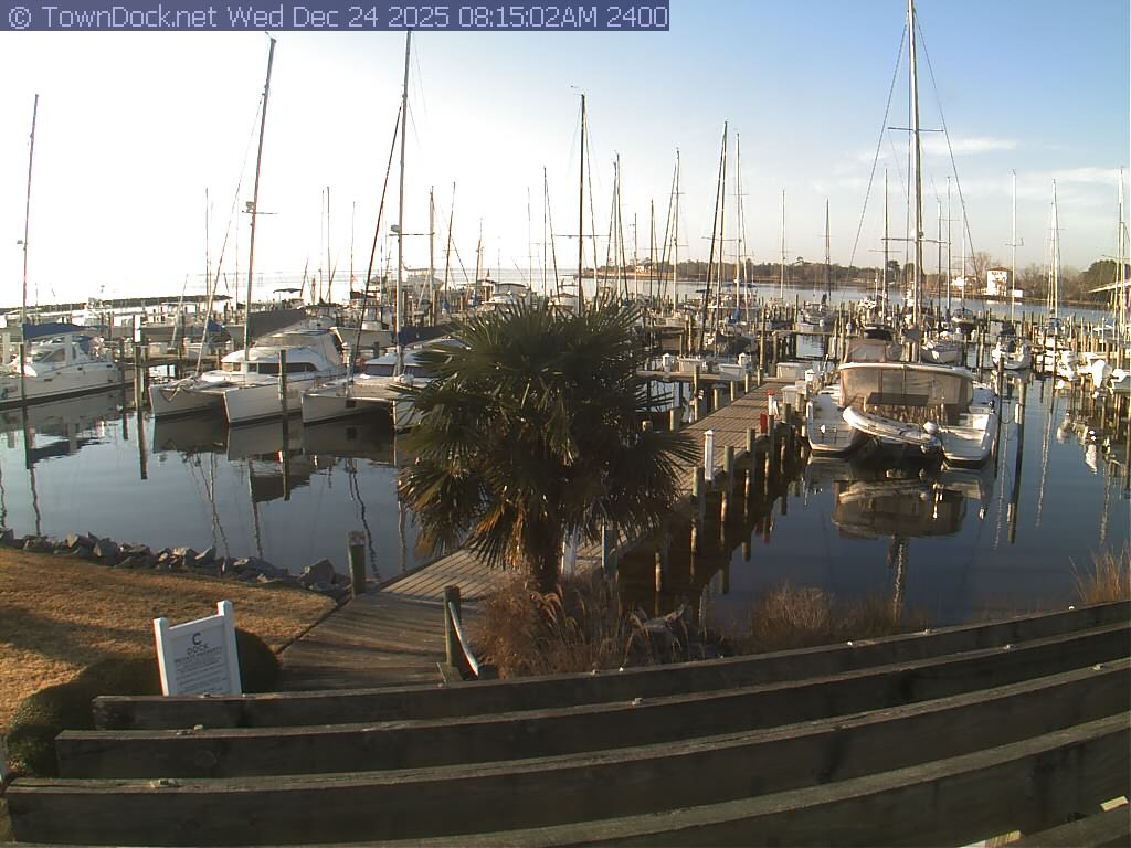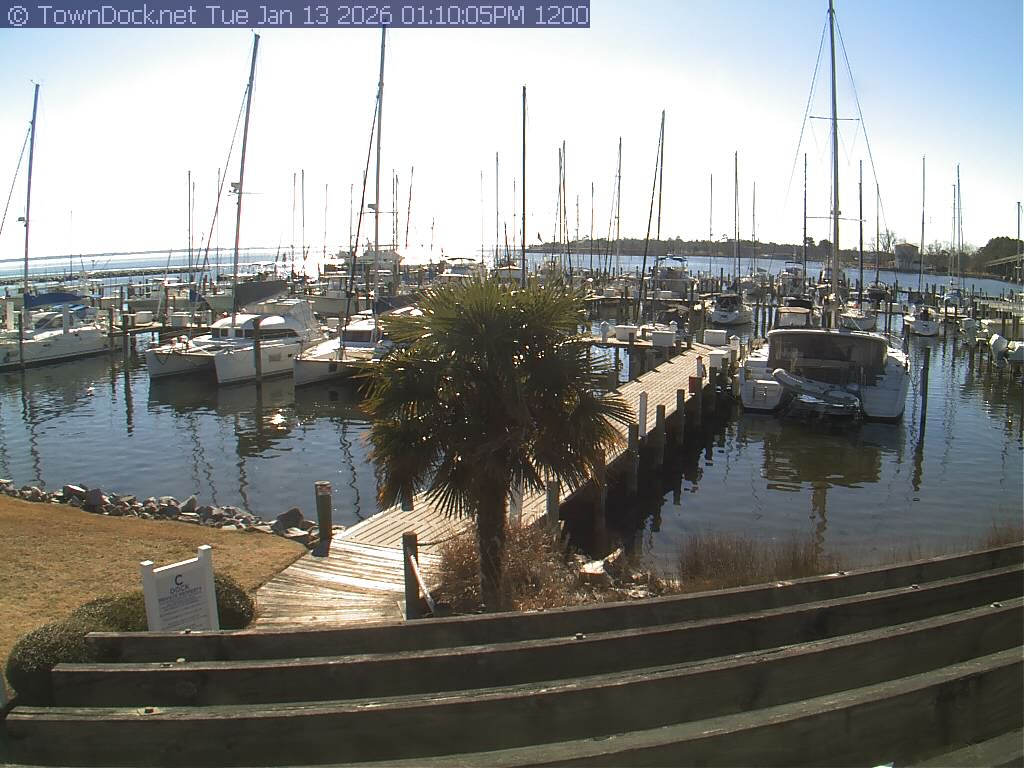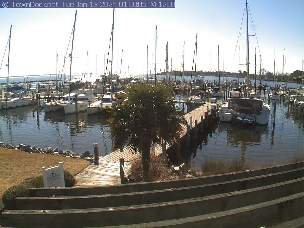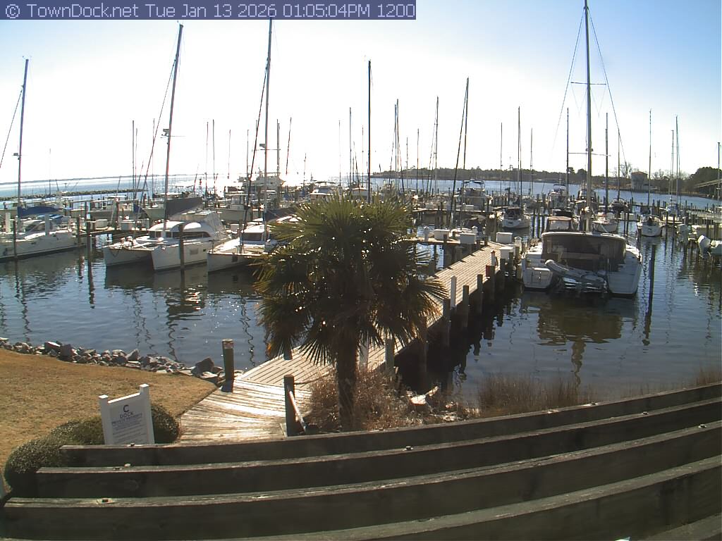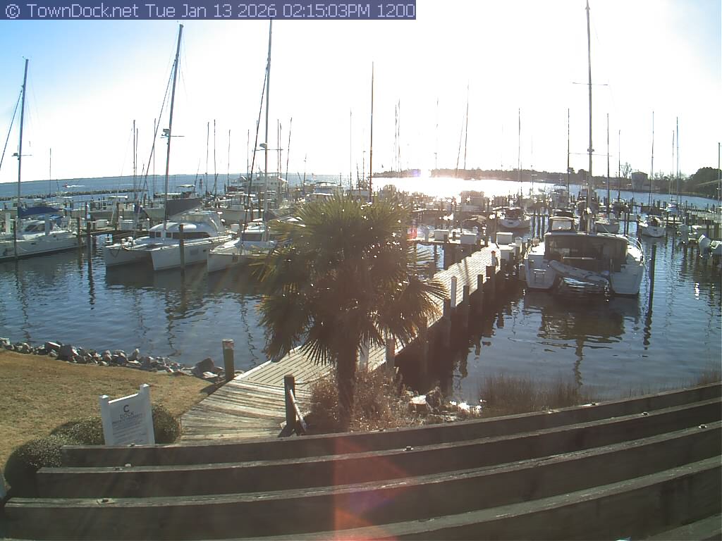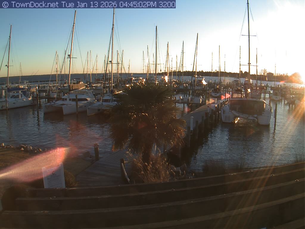 shows Oriental Harbor Village Marina, with the Oriental anchorage & Neuse River in the background. OHVM Cam takes a new picture every five minutes from dawn til just before dusk. Click on the image to see a larger version. Once you see that larger version, you can click (see arrow at right) to go back in time and see recent photos. Harbor Cam currently takes photos from 6:00am to 5:00pm.