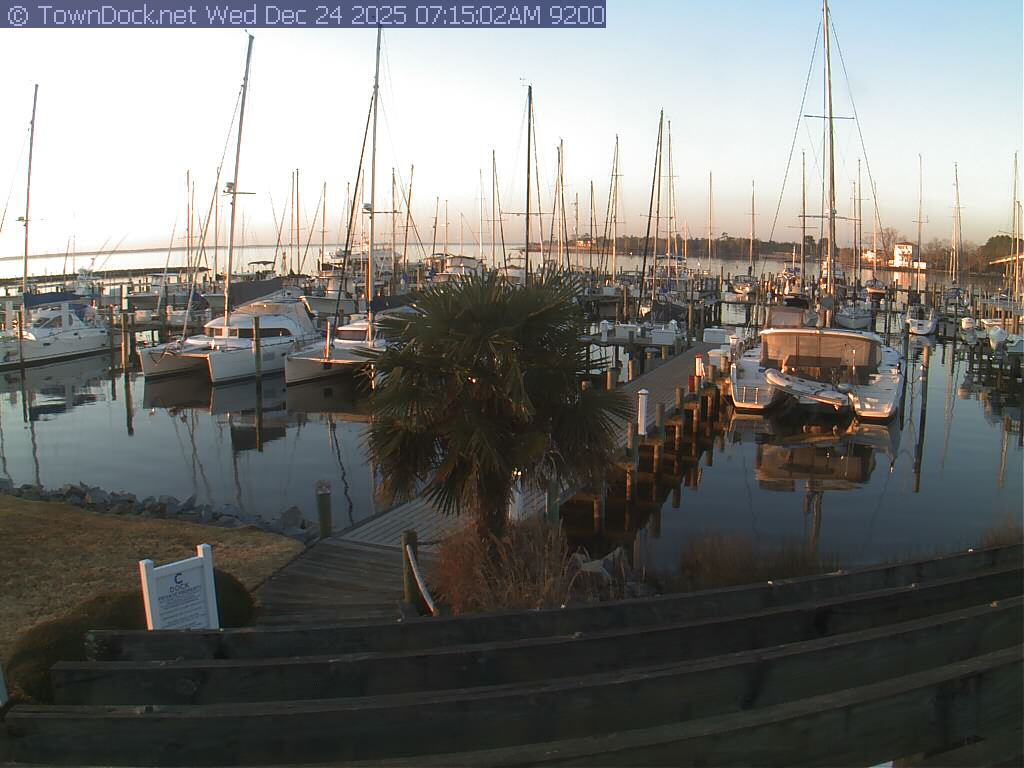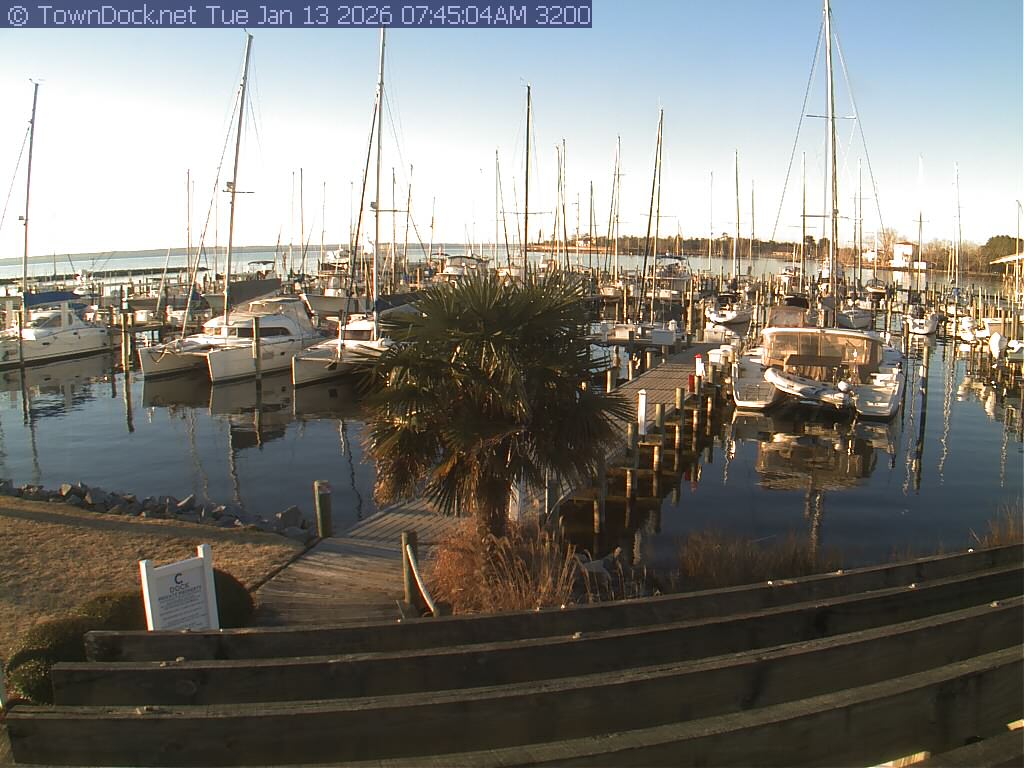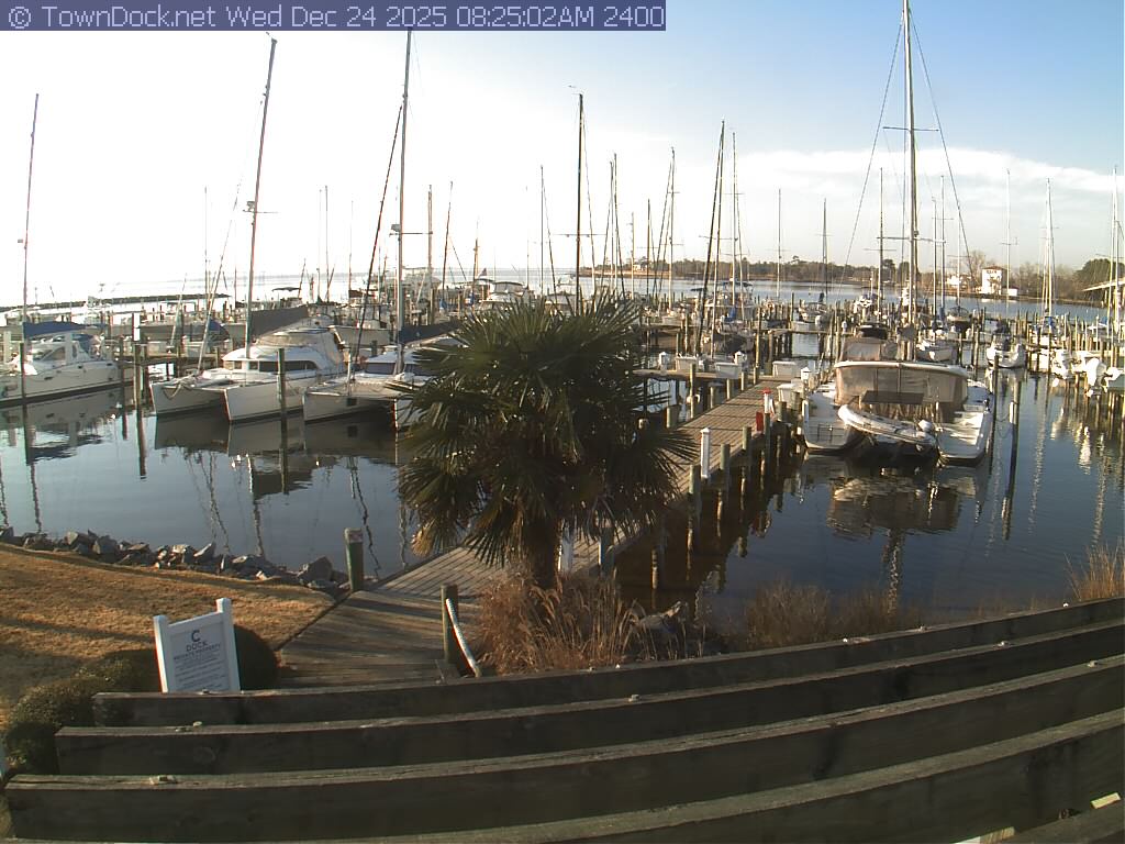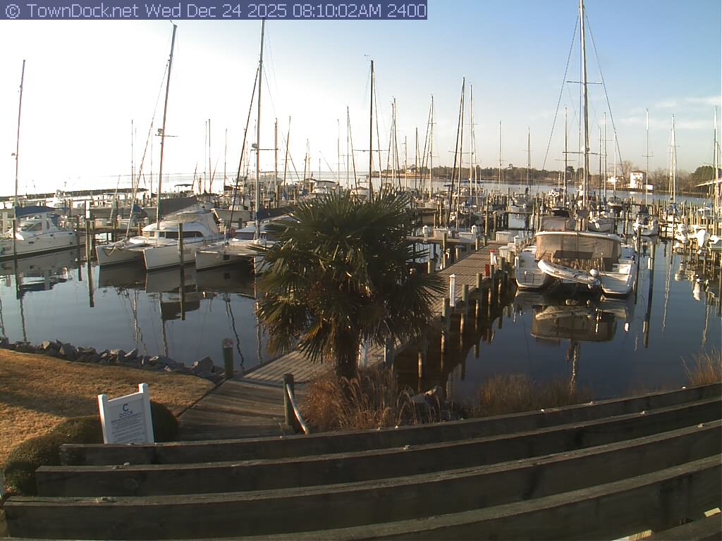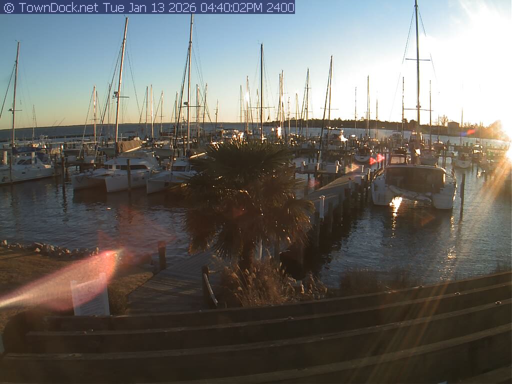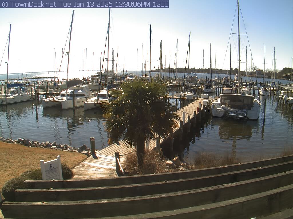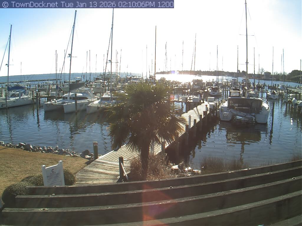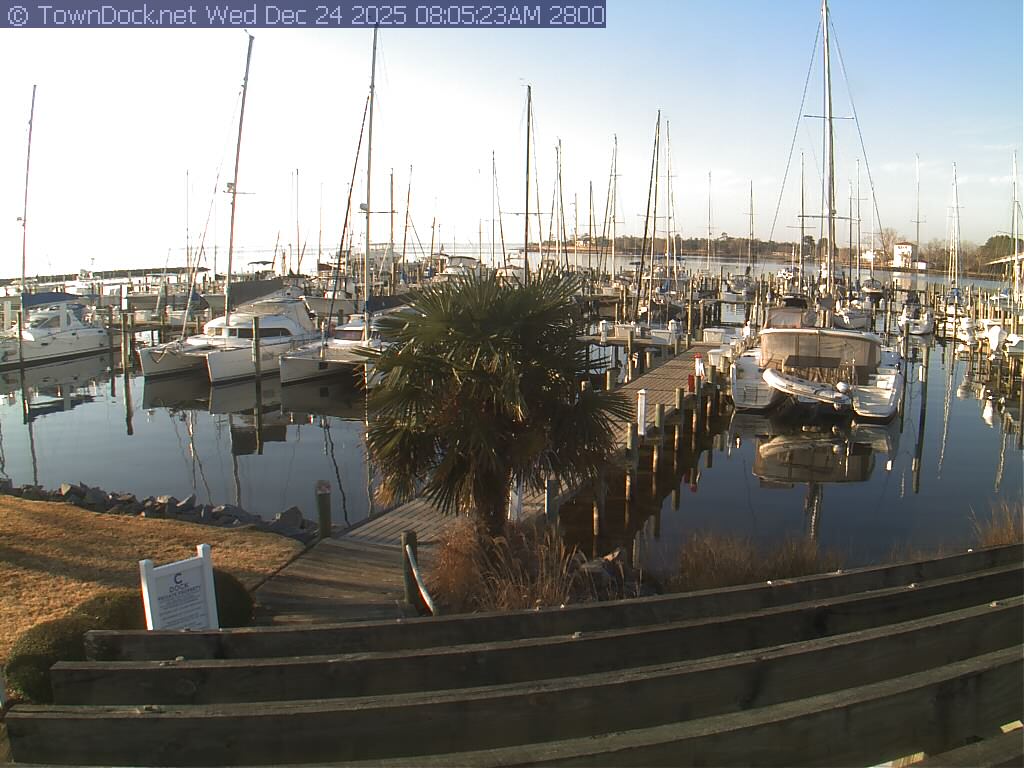 shows Oriental Harbor Village Marina, with the Oriental anchorage & Neuse River in the background. OHVM Cam takes a new picture every five minutes from dawn til just before dusk. Click on the image to see a larger version. Once you see that larger version, you can click (see arrow at right) to go back in time and see recent photos. Harbor Cam currently takes photos from 6:00am to 5:00pm.