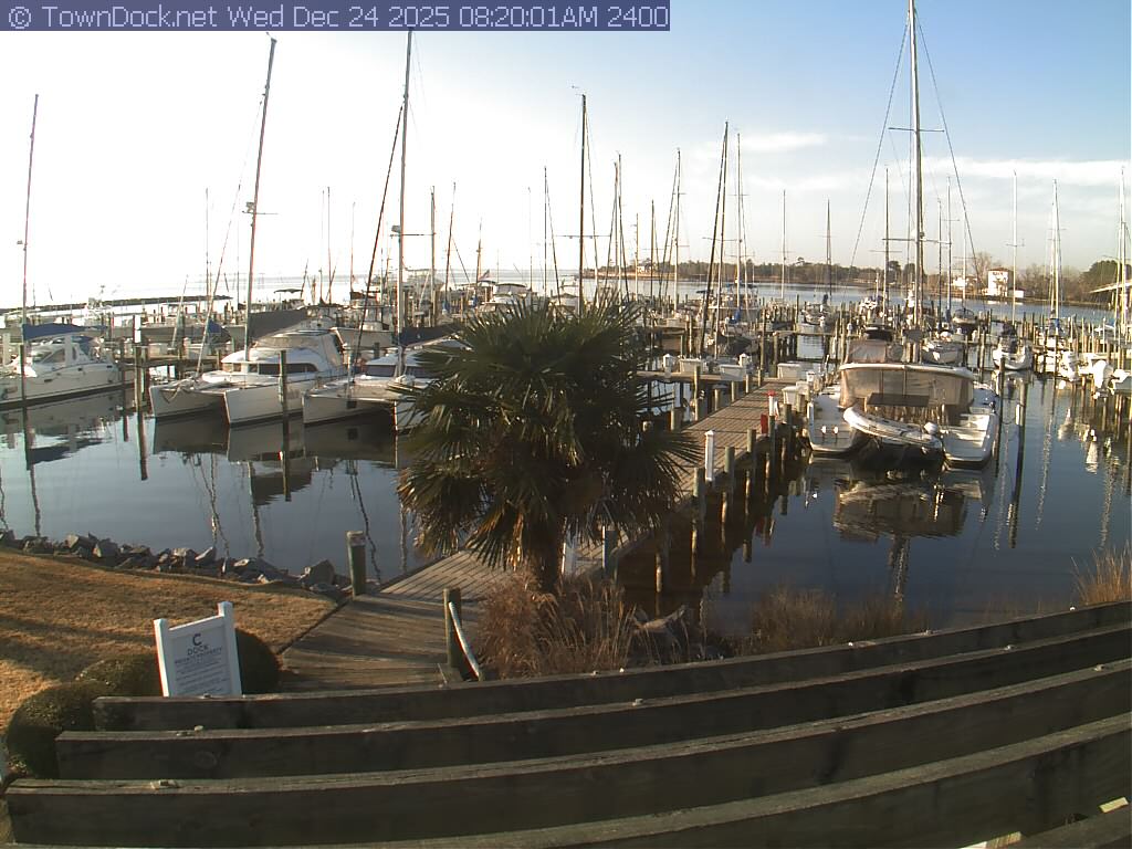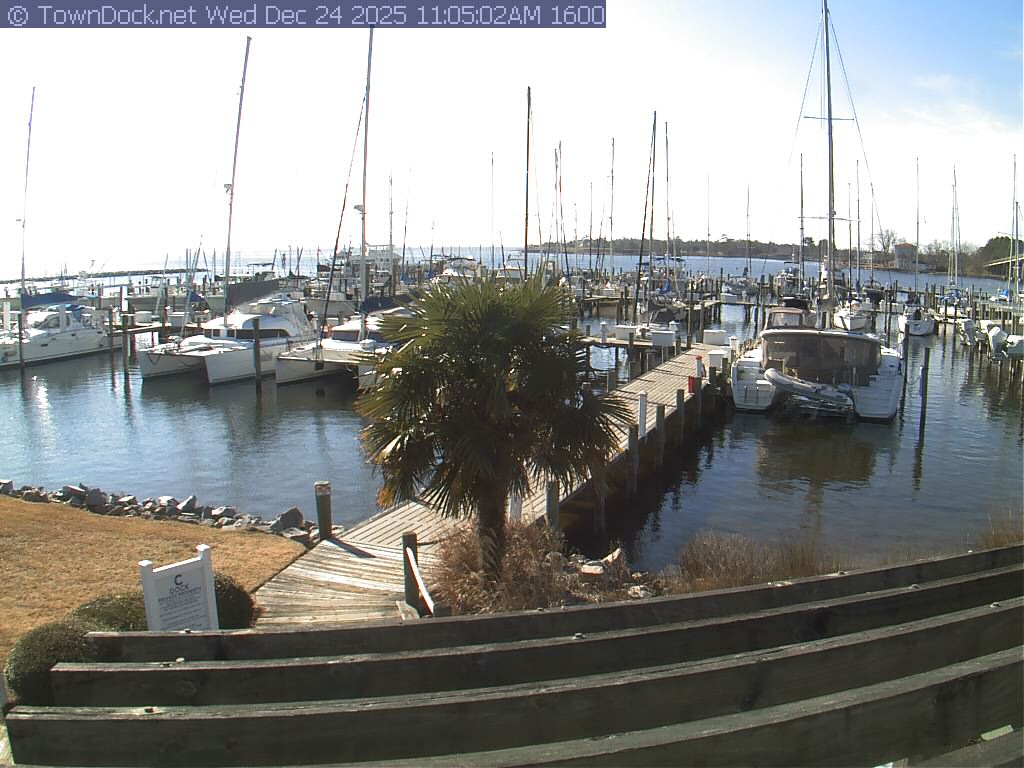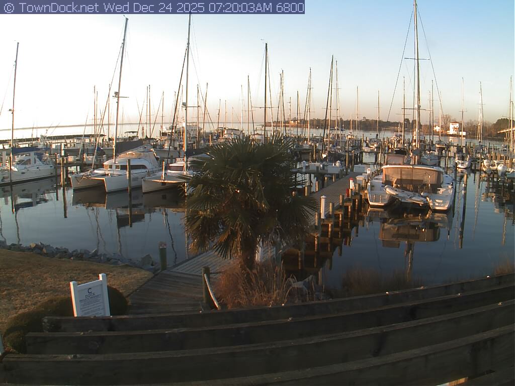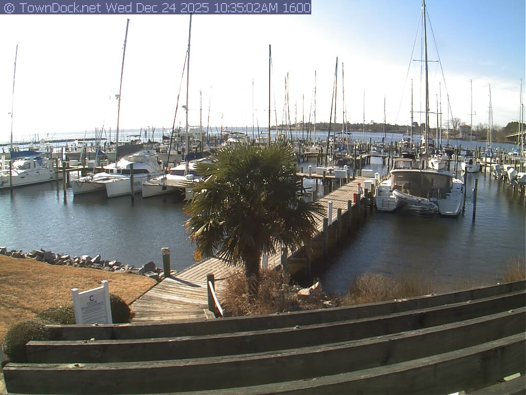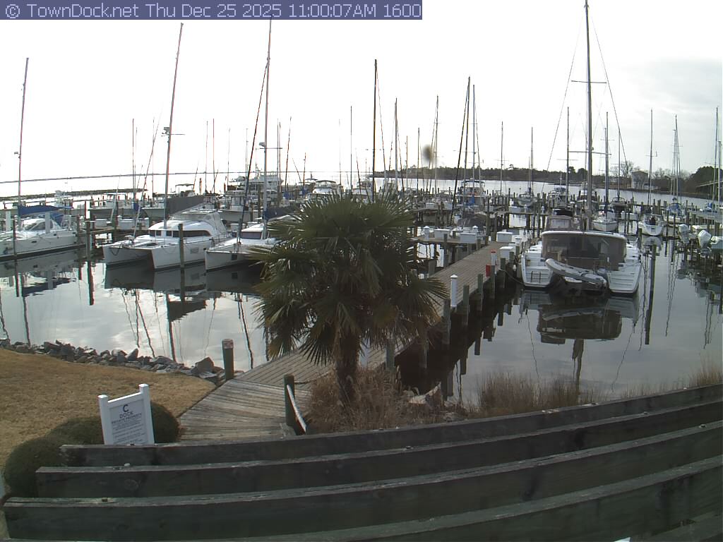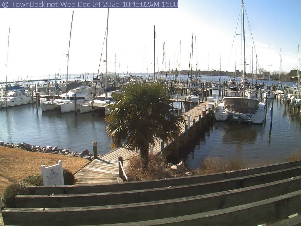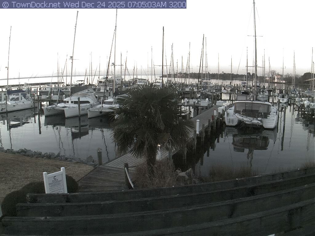 shows Oriental Harbor Village Marina, with the Oriental anchorage & Neuse River in the background. OHVM Cam takes a new picture every five minutes from dawn til just before dusk. Click on the image to see a larger version. Once you see that larger version, you can click (see arrow at right) to go back in time and see recent photos. Harbor Cam currently takes photos from 6:00am to 5:00pm.