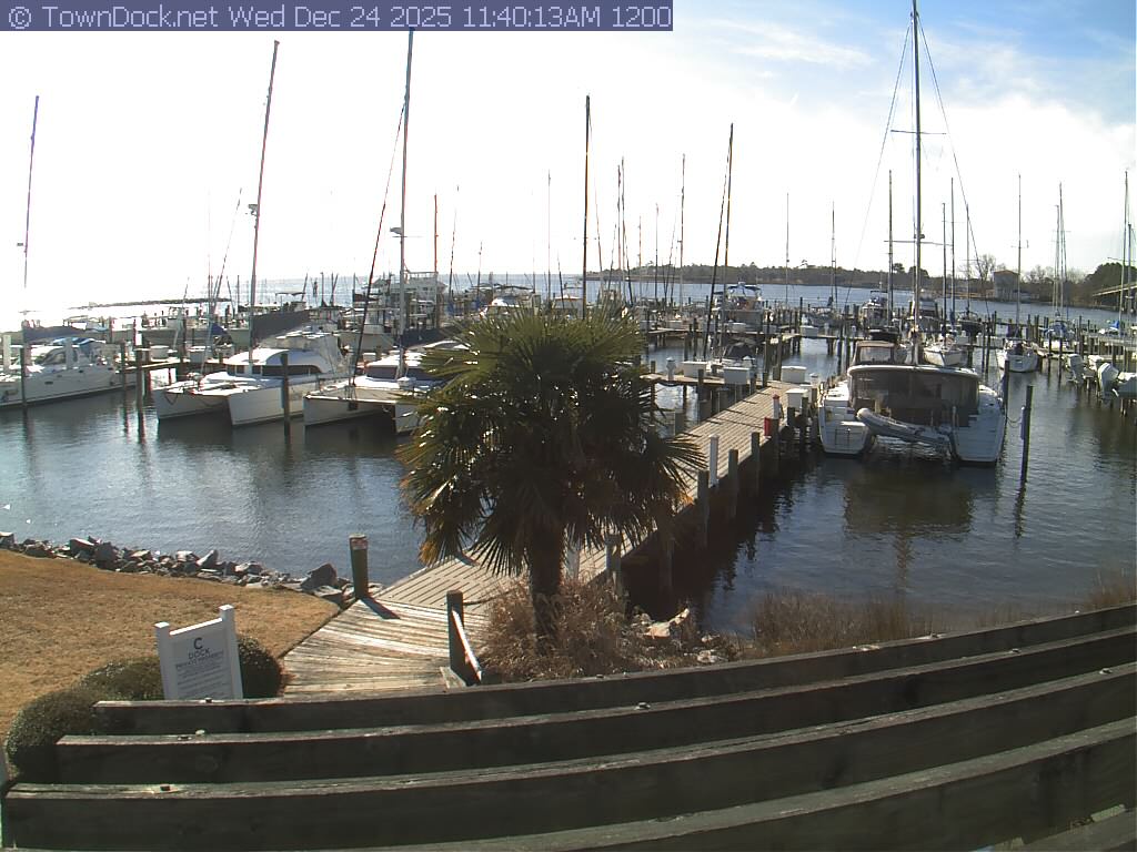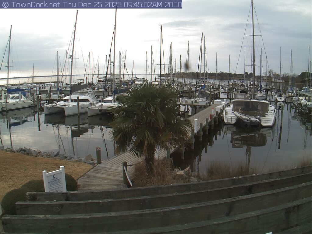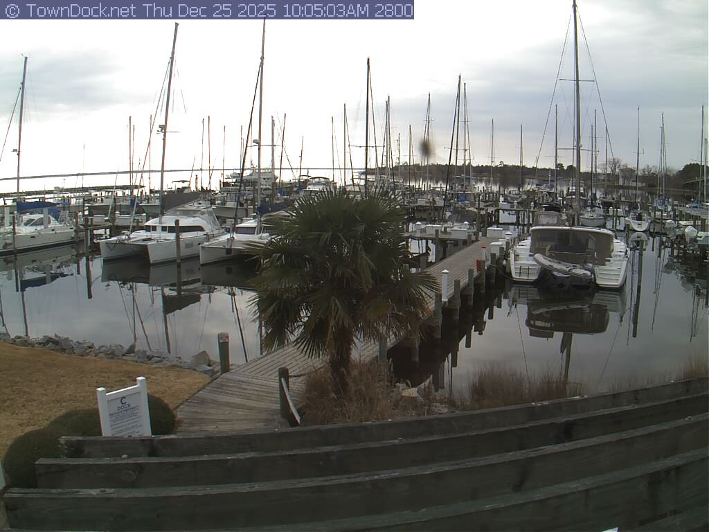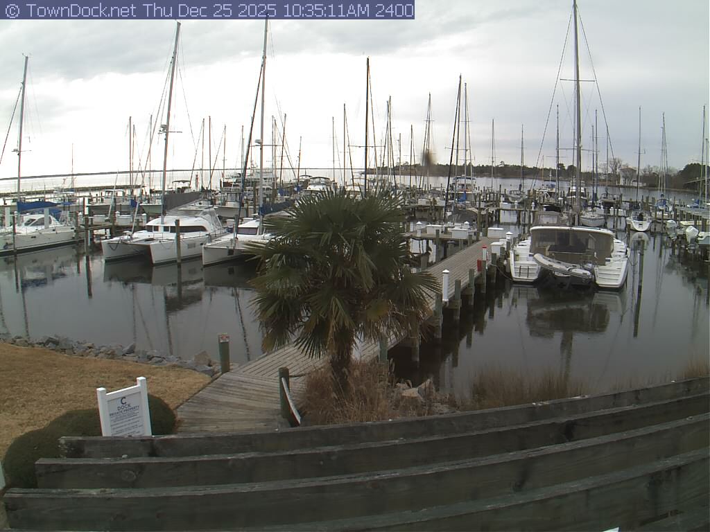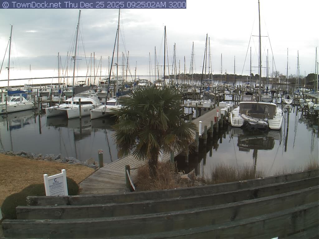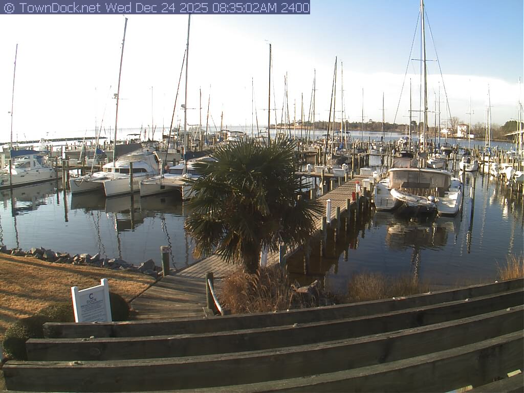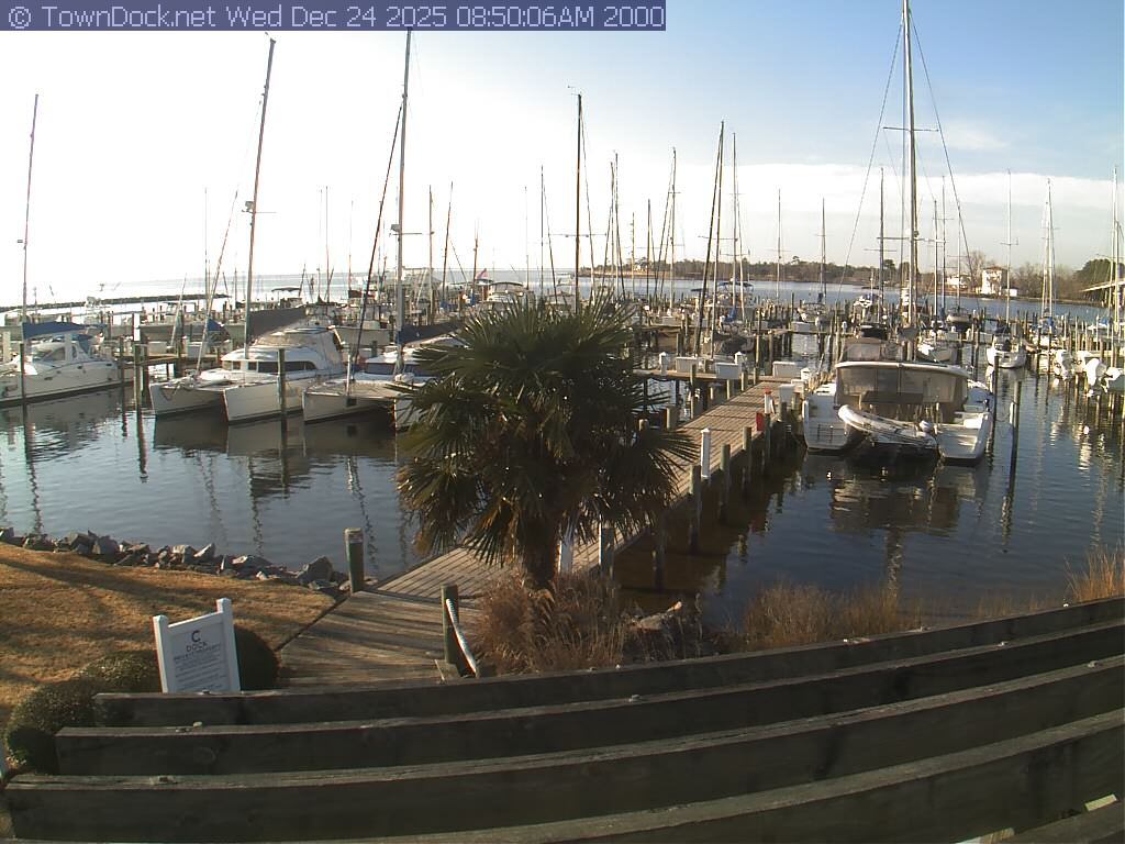 shows Oriental Harbor Village Marina, with the Oriental anchorage & Neuse River in the background. OHVM Cam takes a new picture every five minutes from dawn til just before dusk. Click on the image to see a larger version. Once you see that larger version, you can click (see arrow at right) to go back in time and see recent photos. Harbor Cam currently takes photos from 6:00am to 5:00pm.