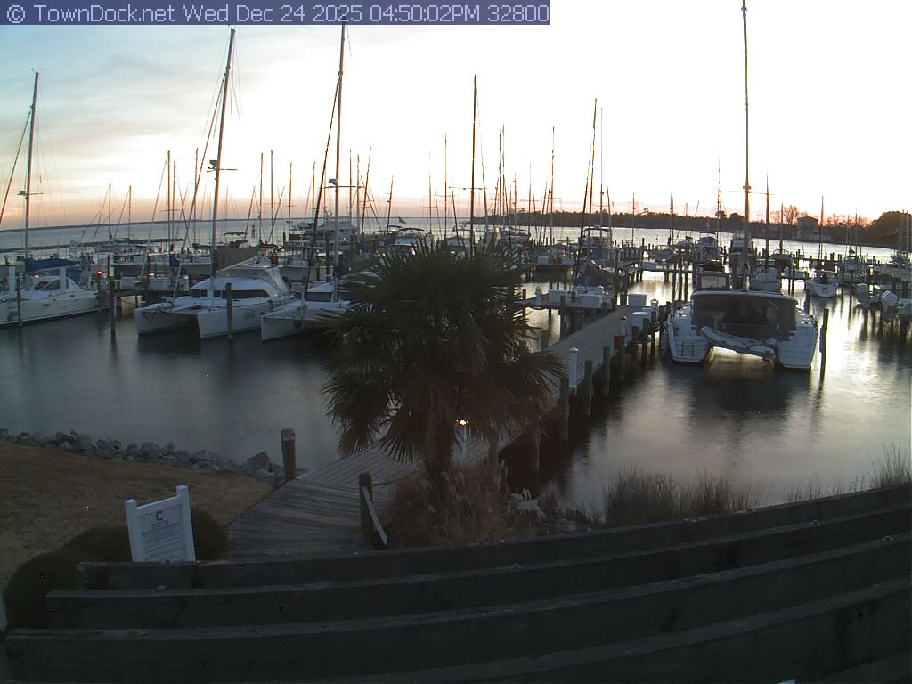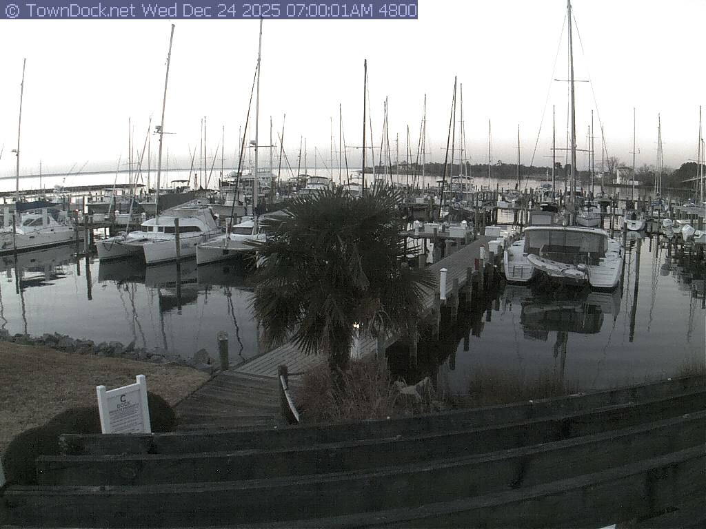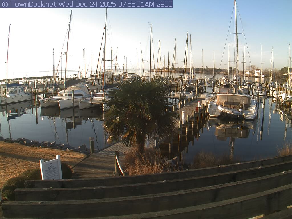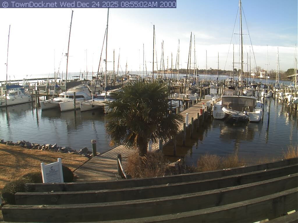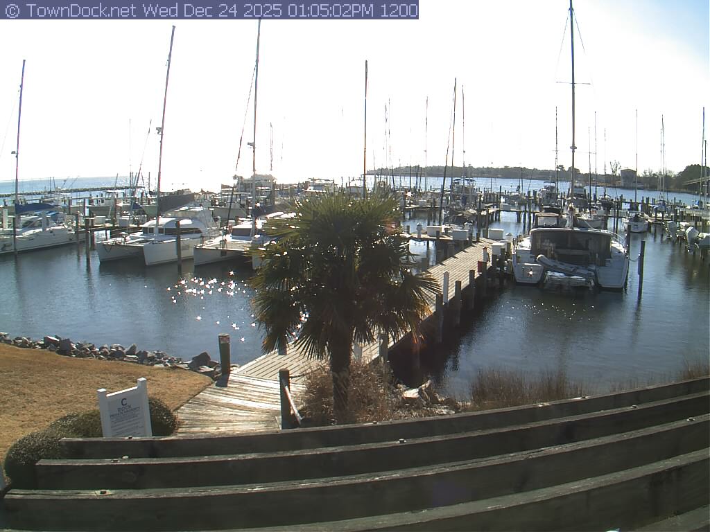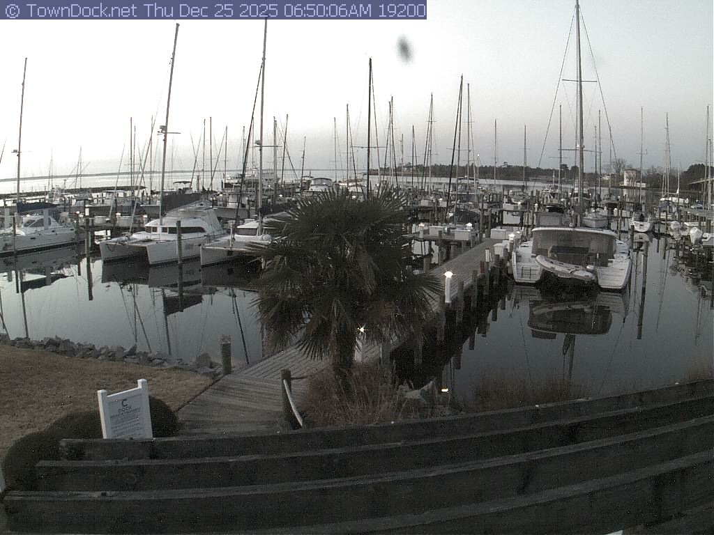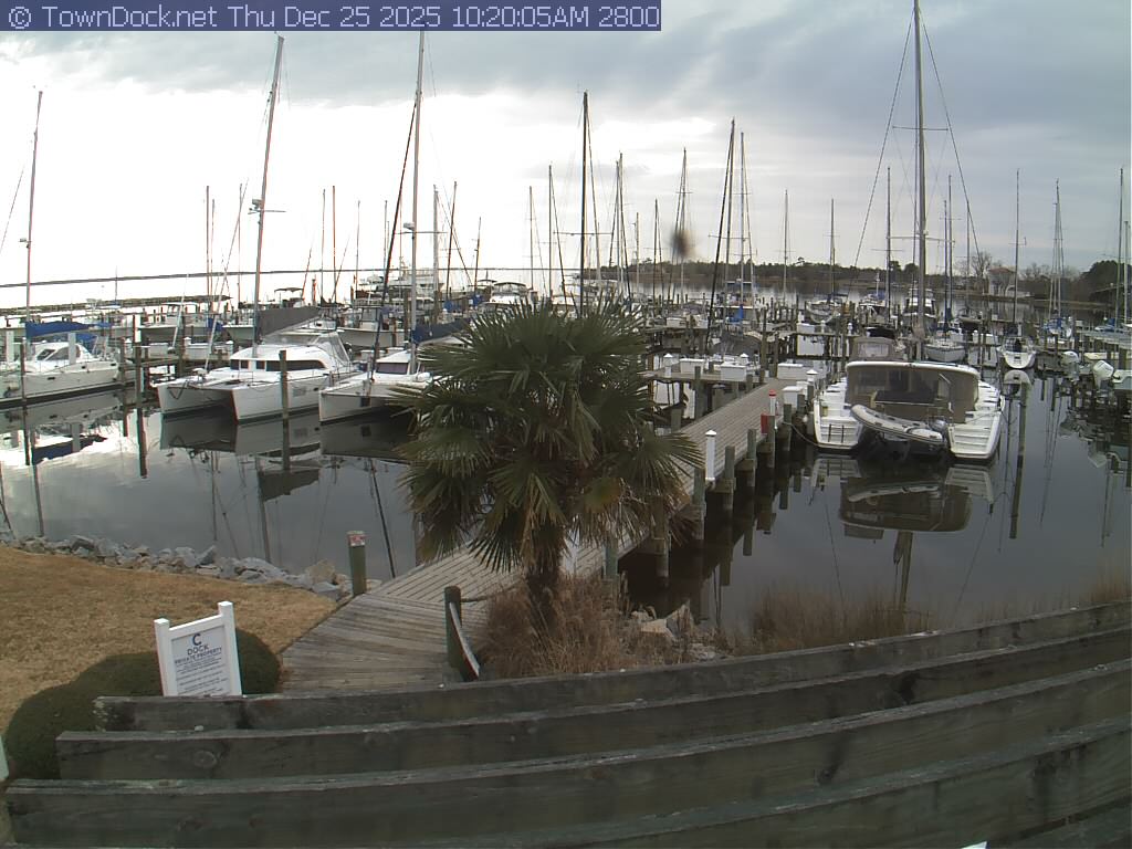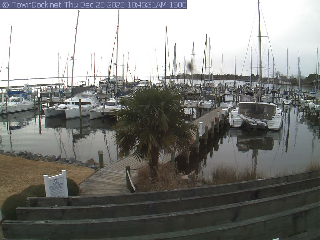 shows Oriental Harbor Village Marina, with the Oriental anchorage & Neuse River in the background. OHVM Cam takes a new picture every five minutes from dawn til just before dusk. Click on the image to see a larger version. Once you see that larger version, you can click (see arrow at right) to go back in time and see recent photos. Harbor Cam currently takes photos from 6:00am to 5:00pm.
