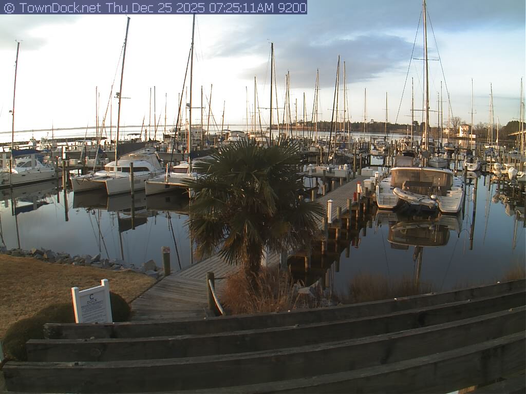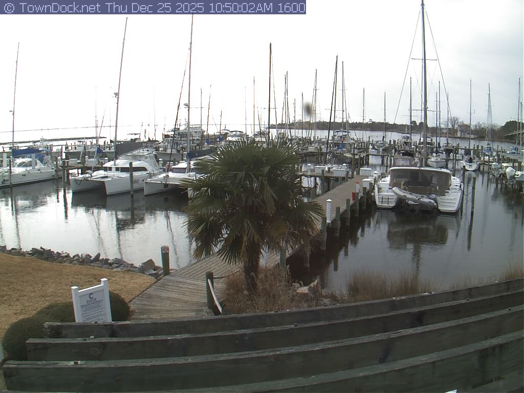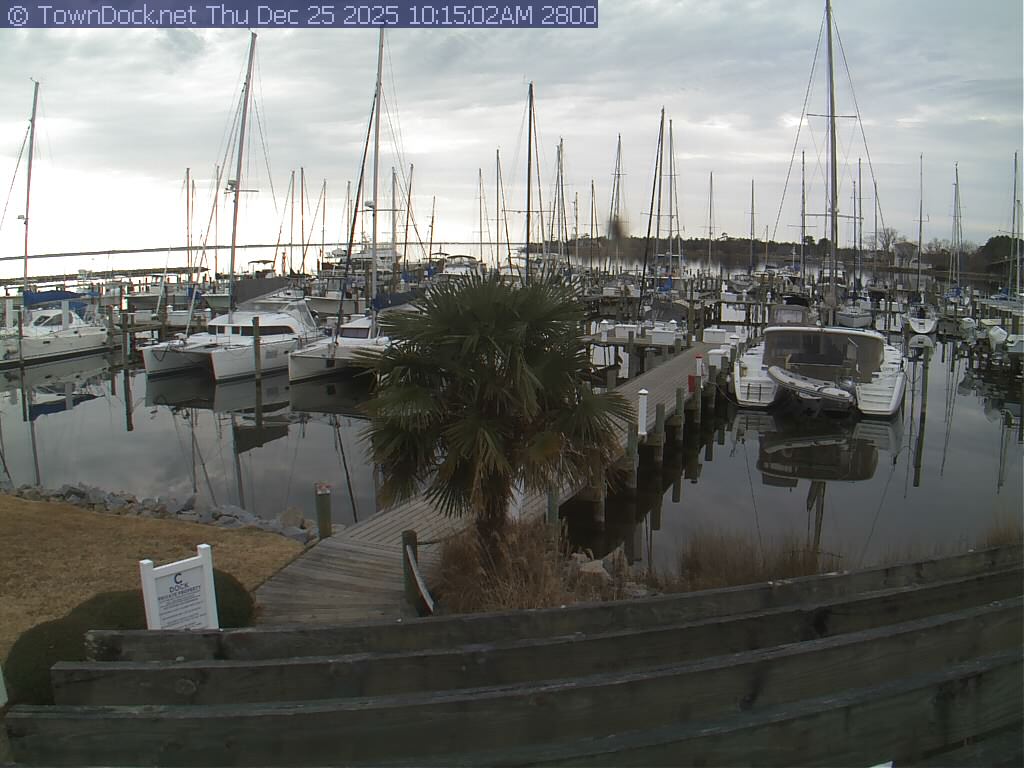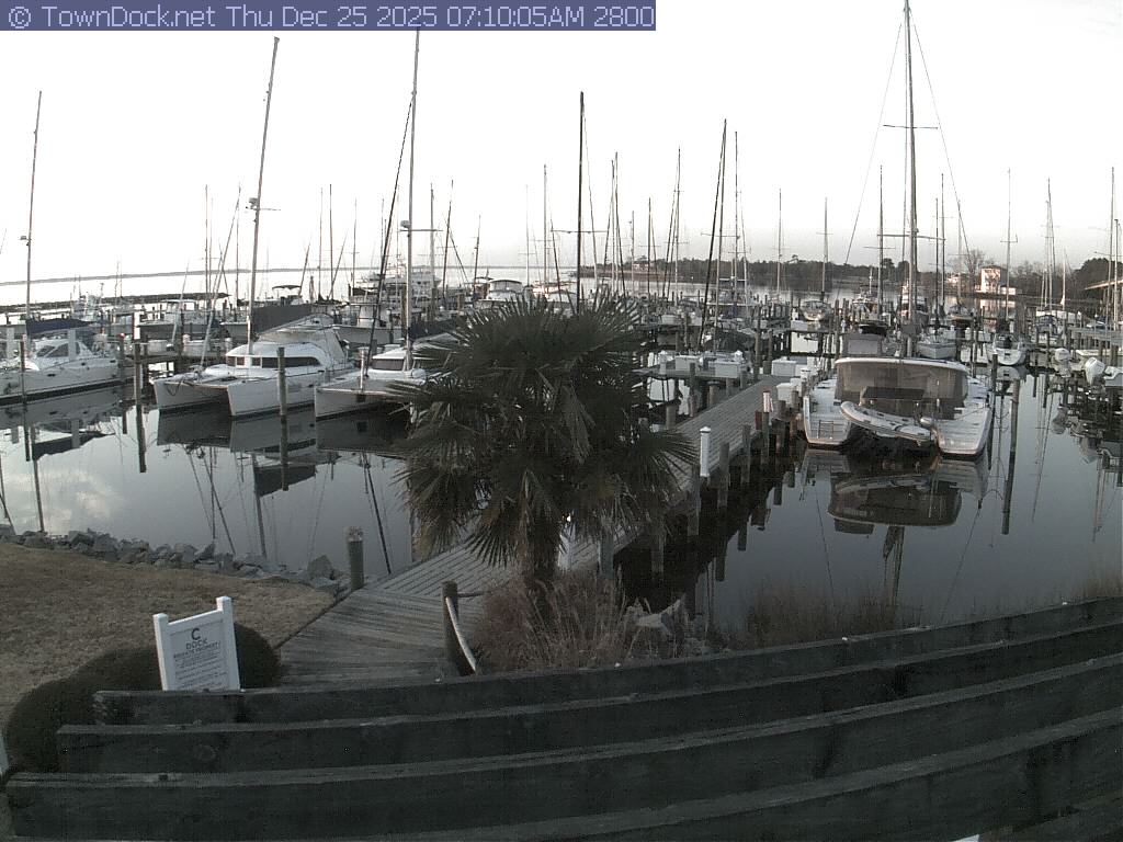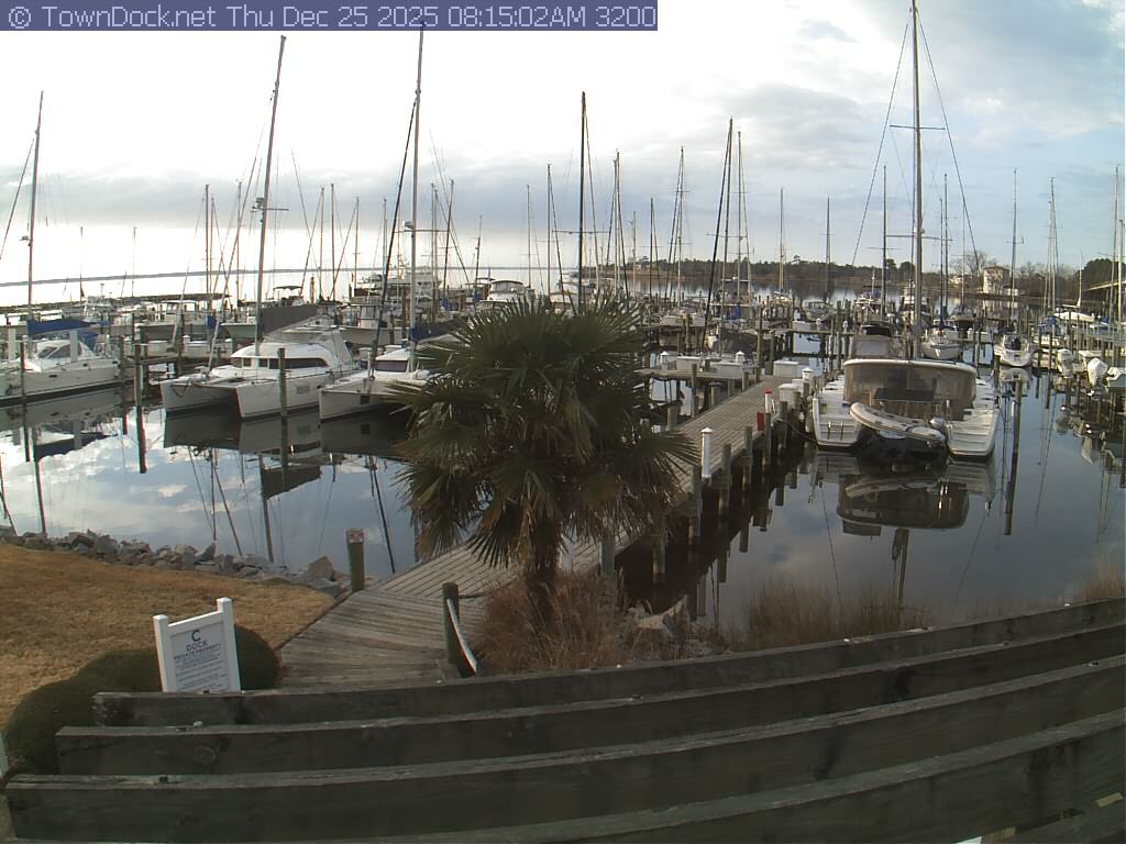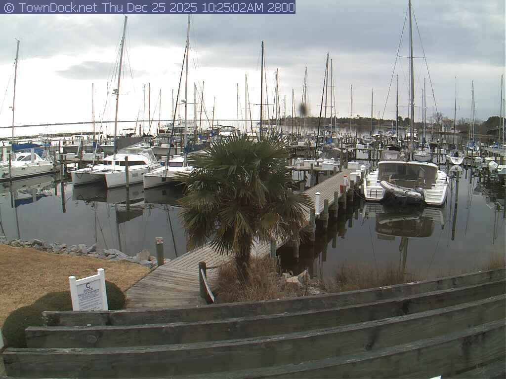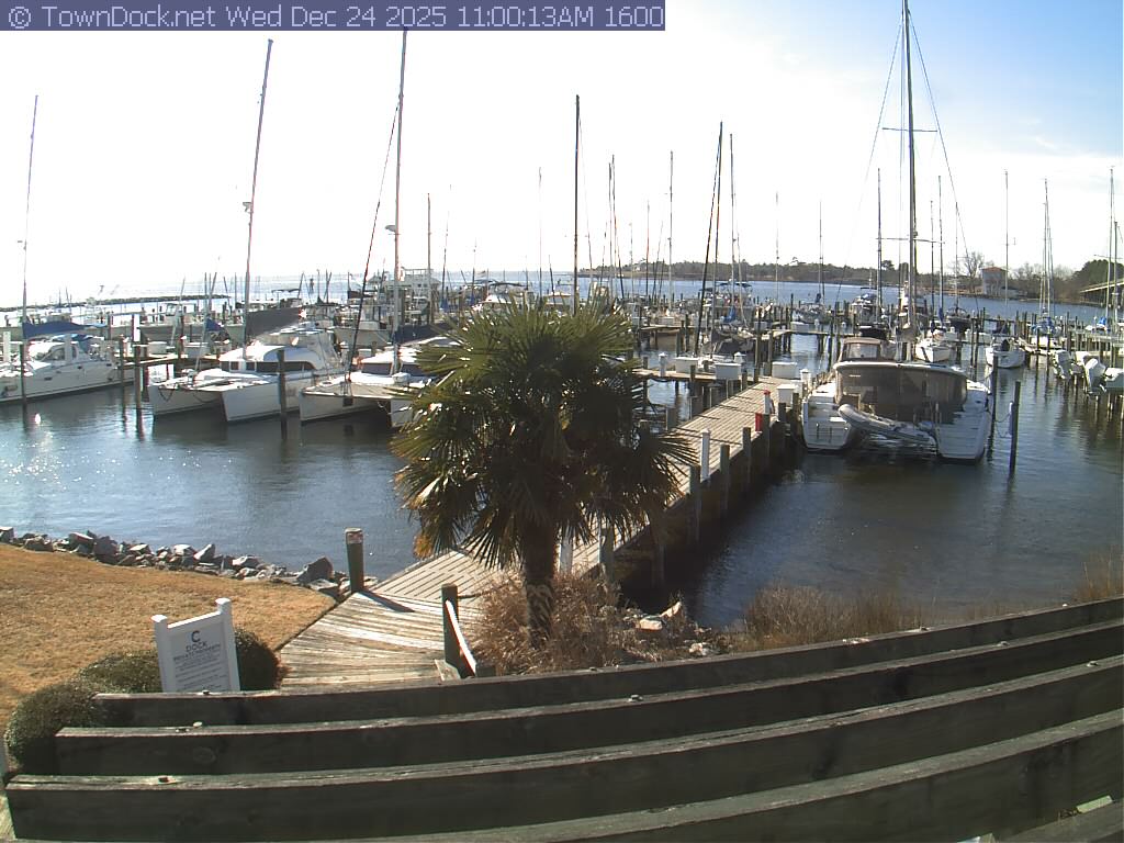 shows Oriental Harbor Village Marina, with the Oriental anchorage & Neuse River in the background. OHVM Cam takes a new picture every five minutes from dawn til just before dusk. Click on the image to see a larger version. Once you see that larger version, you can click (see arrow at right) to go back in time and see recent photos. Harbor Cam currently takes photos from 6:00am to 5:00pm.
