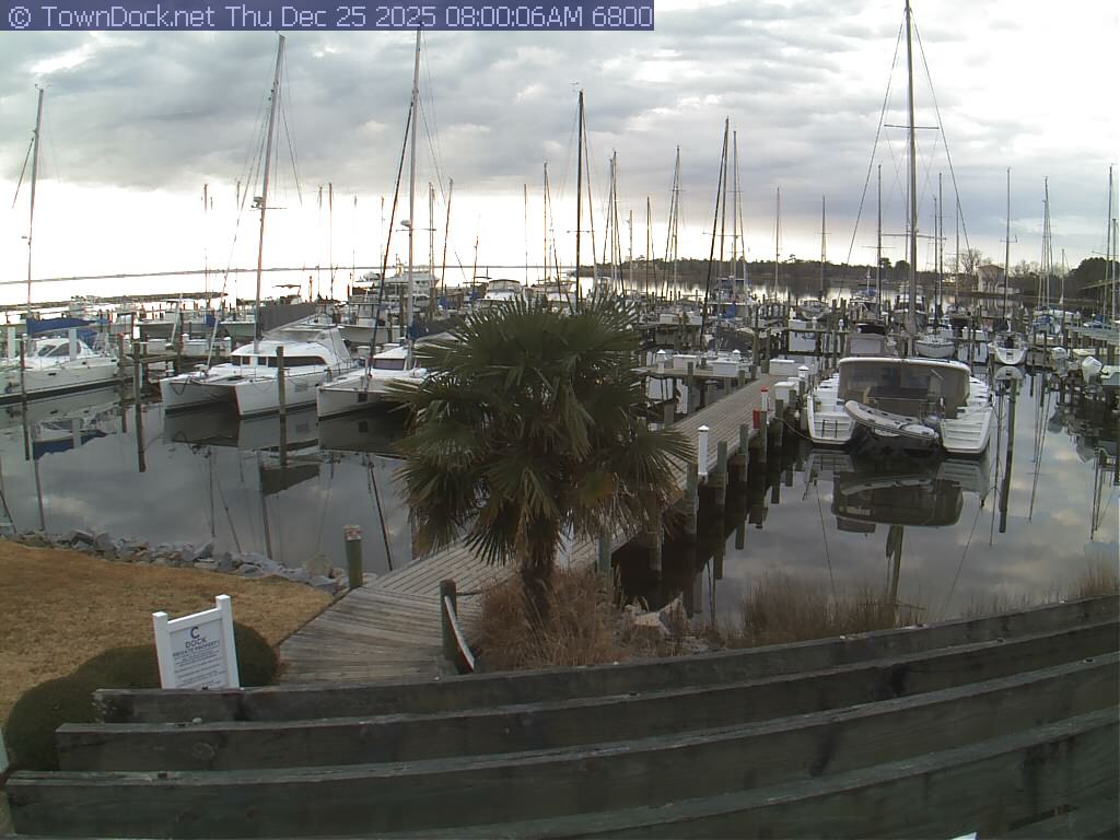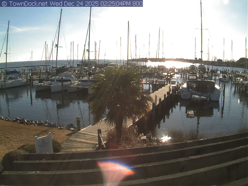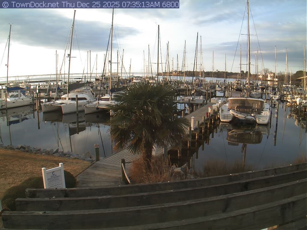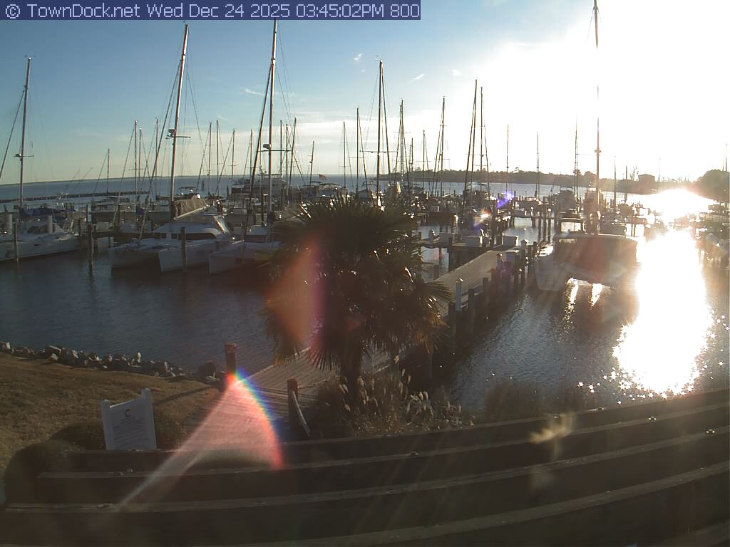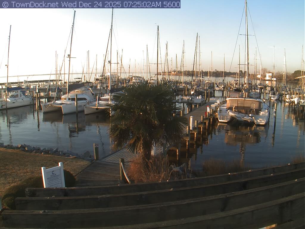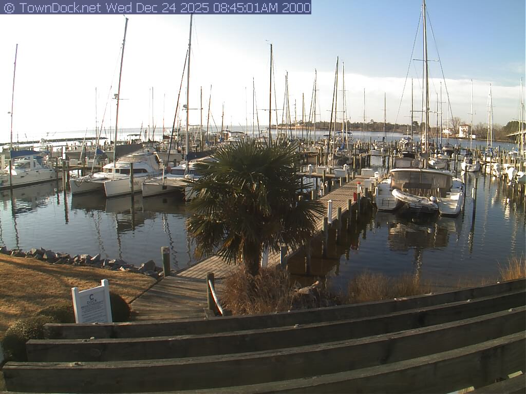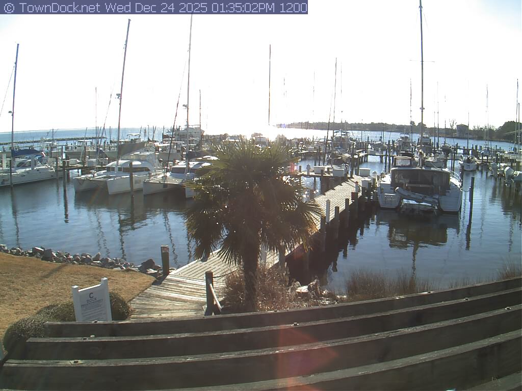 shows Oriental Harbor Village Marina, with the Oriental anchorage & Neuse River in the background. OHVM Cam takes a new picture every five minutes from dawn til just before dusk. Click on the image to see a larger version. Once you see that larger version, you can click (see arrow at right) to go back in time and see recent photos. Harbor Cam currently takes photos from 6:00am to 5:00pm.