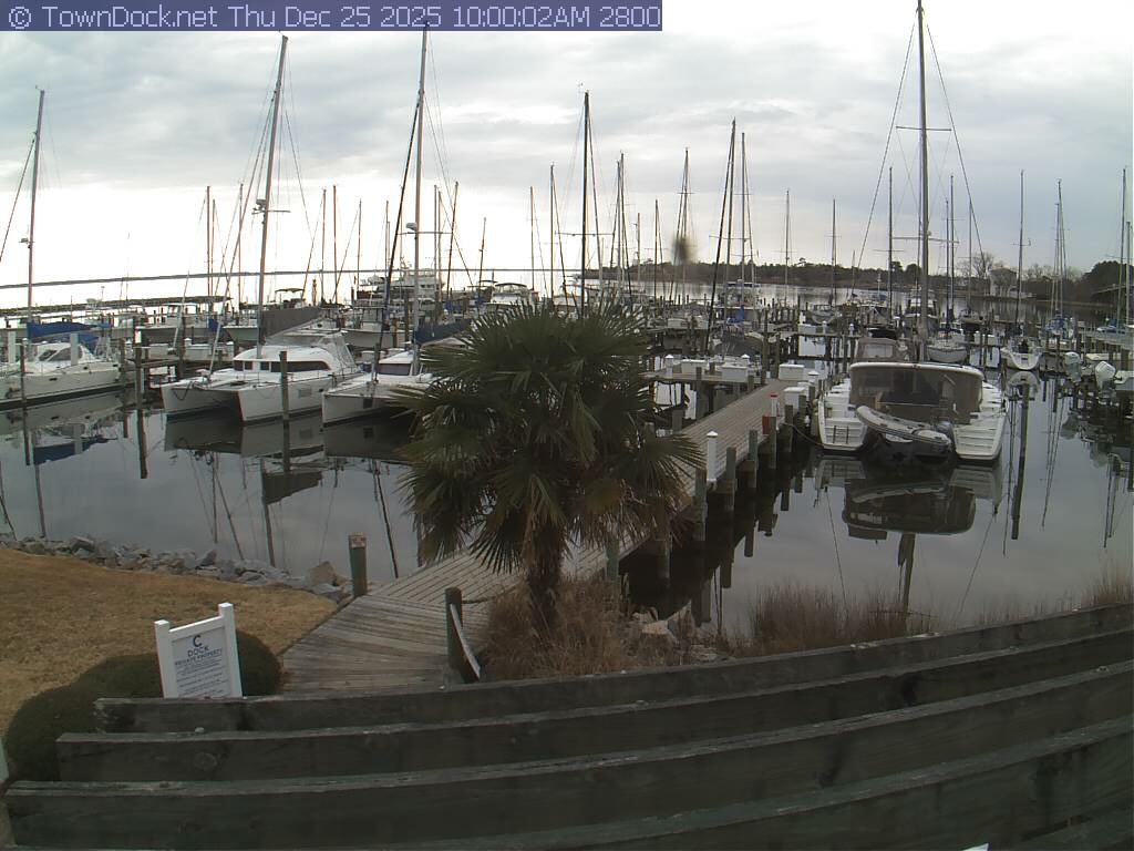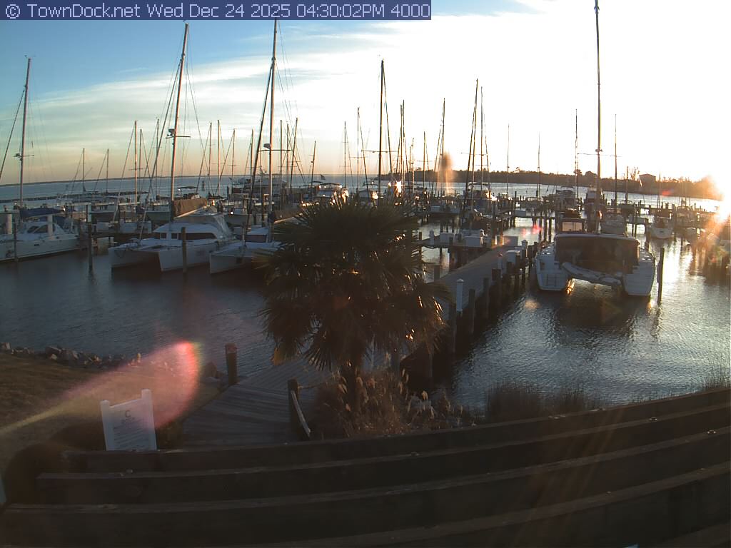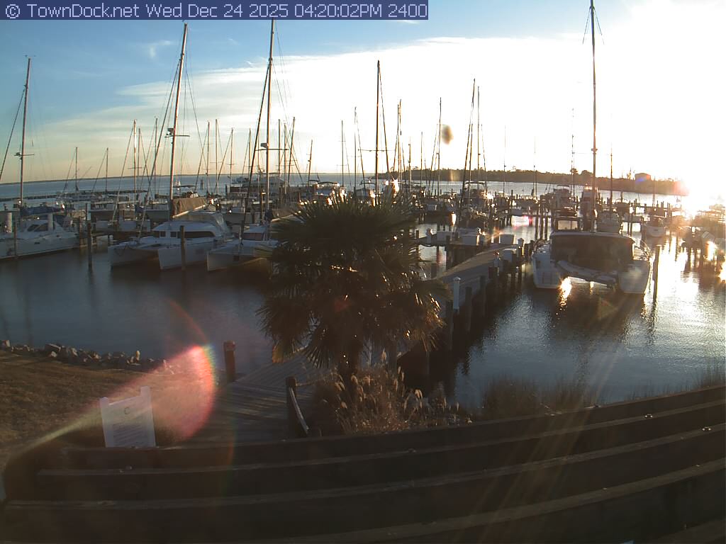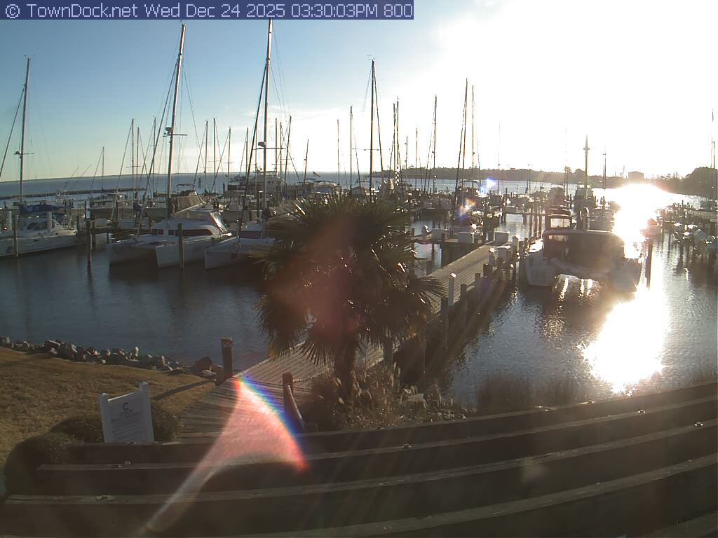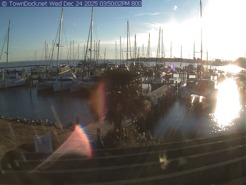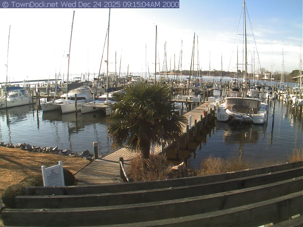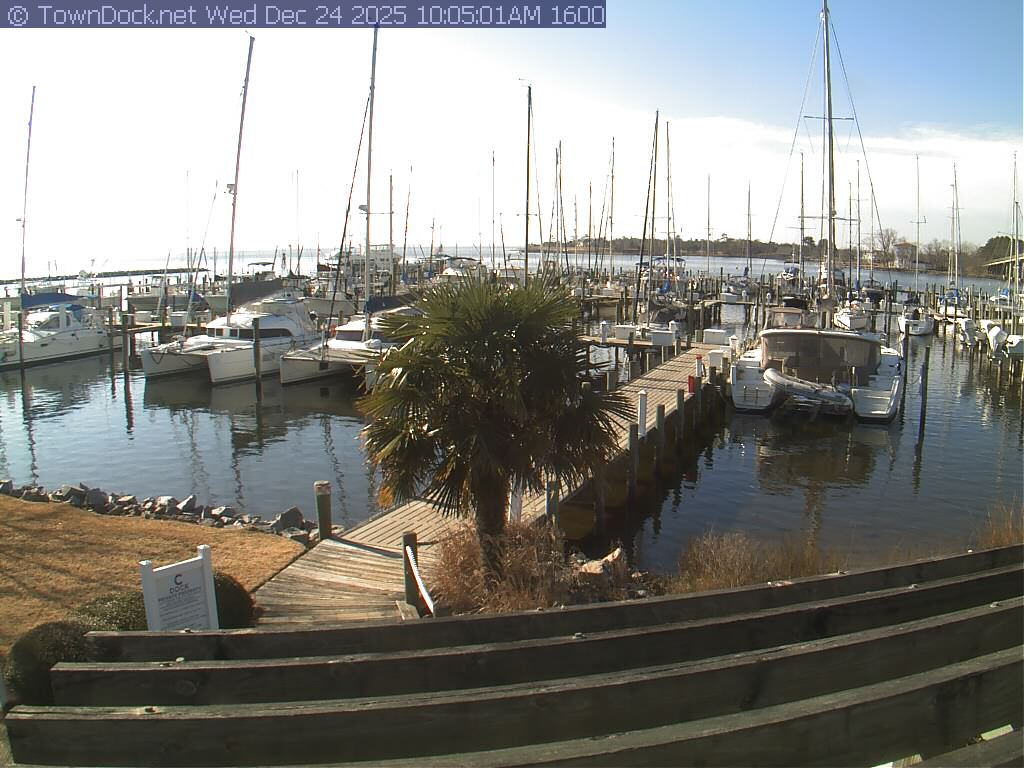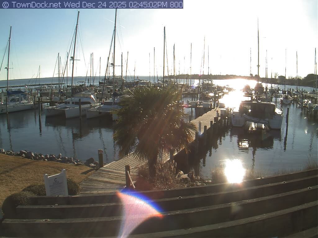 shows Oriental Harbor Village Marina, with the Oriental anchorage & Neuse River in the background. OHVM Cam takes a new picture every five minutes from dawn til just before dusk. Click on the image to see a larger version. Once you see that larger version, you can click (see arrow at right) to go back in time and see recent photos. Harbor Cam currently takes photos from 6:00am to 5:00pm.