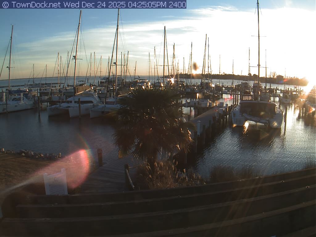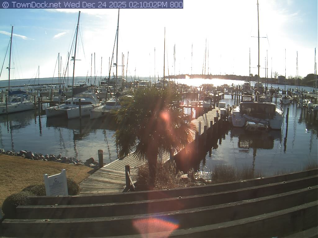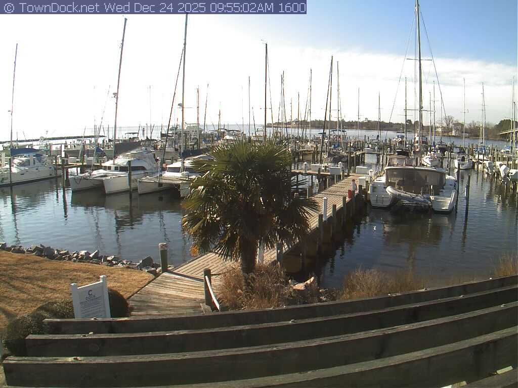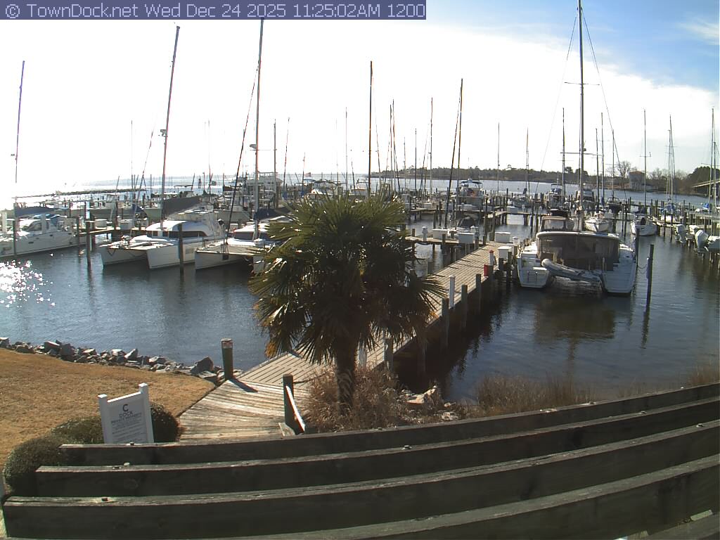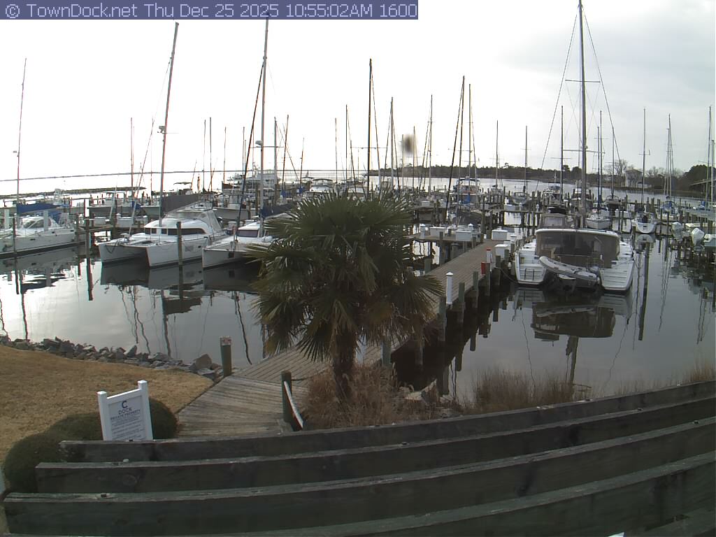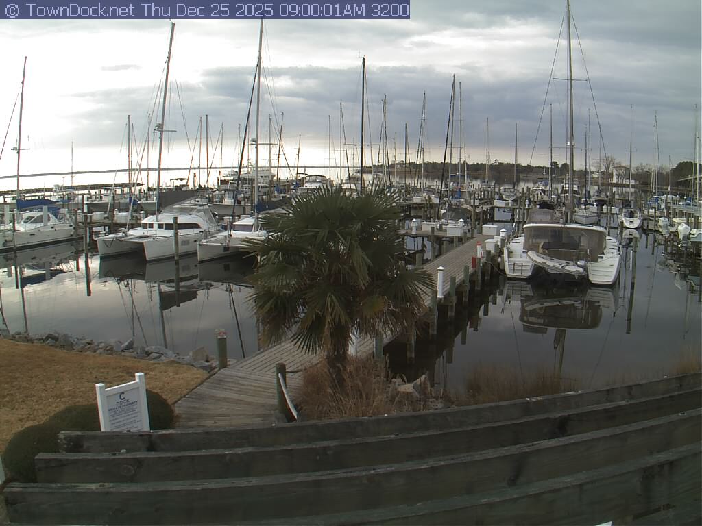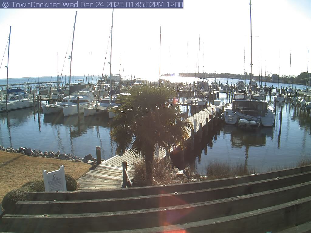 shows Oriental Harbor Village Marina, with the Oriental anchorage & Neuse River in the background. OHVM Cam takes a new picture every five minutes from dawn til just before dusk. Click on the image to see a larger version. Once you see that larger version, you can click (see arrow at right) to go back in time and see recent photos. Harbor Cam currently takes photos from 6:00am to 5:00pm.
