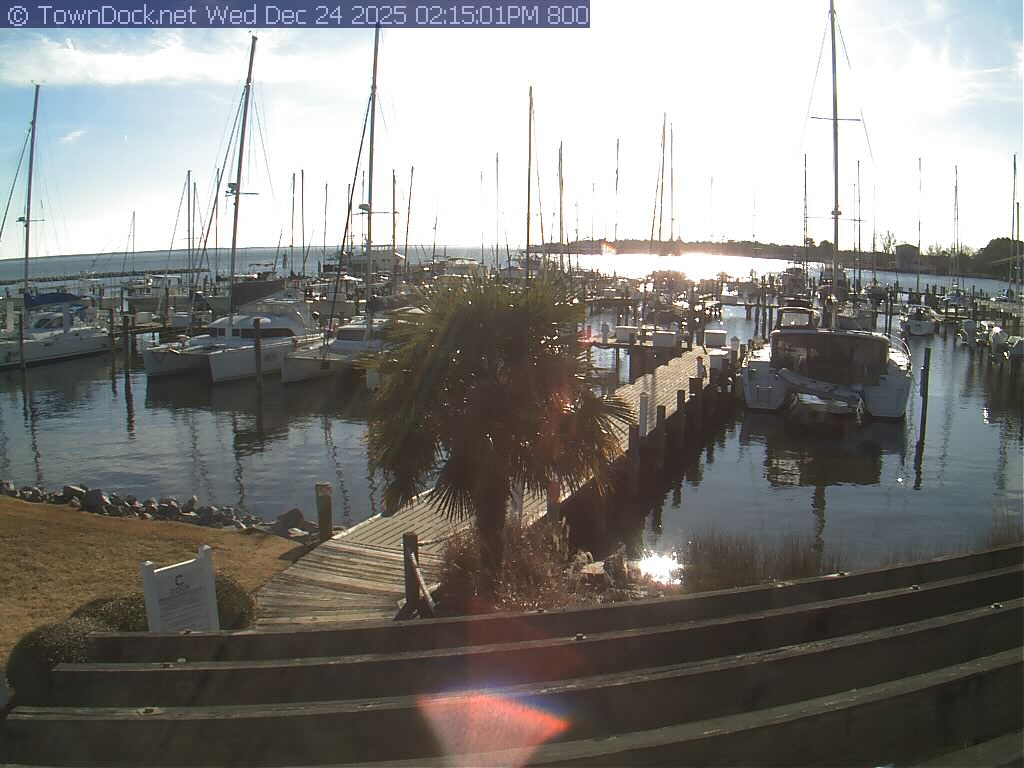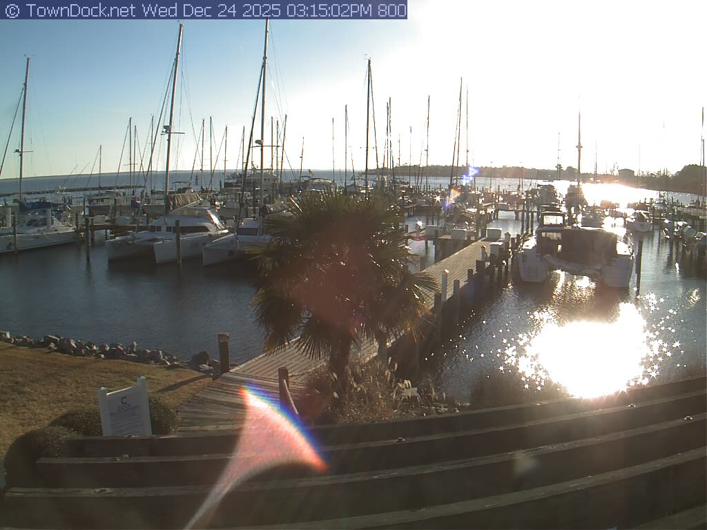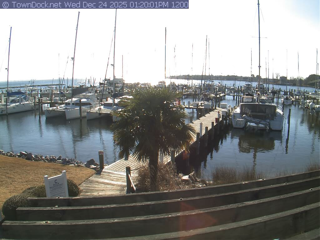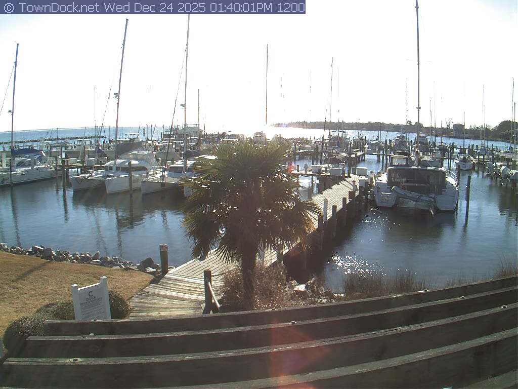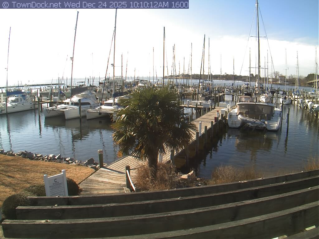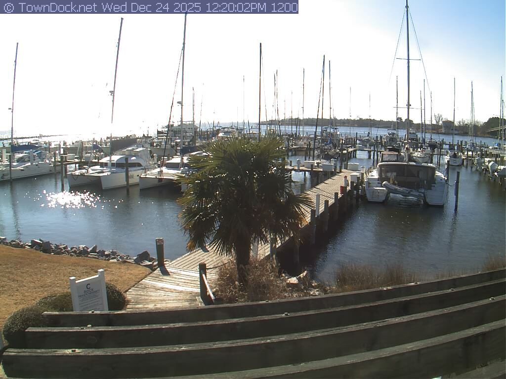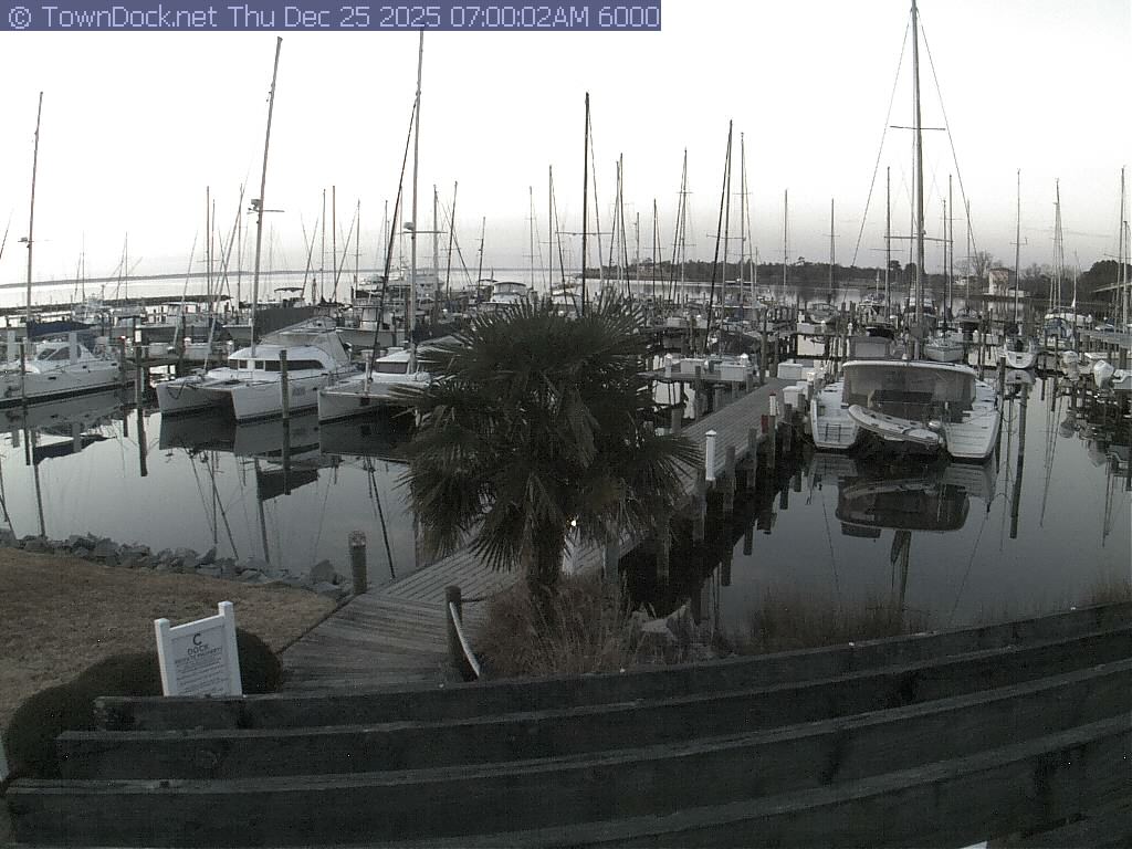 shows Oriental Harbor Village Marina, with the Oriental anchorage & Neuse River in the background. OHVM Cam takes a new picture every five minutes from dawn til just before dusk. Click on the image to see a larger version. Once you see that larger version, you can click (see arrow at right) to go back in time and see recent photos. Harbor Cam currently takes photos from 6:00am to 5:00pm.