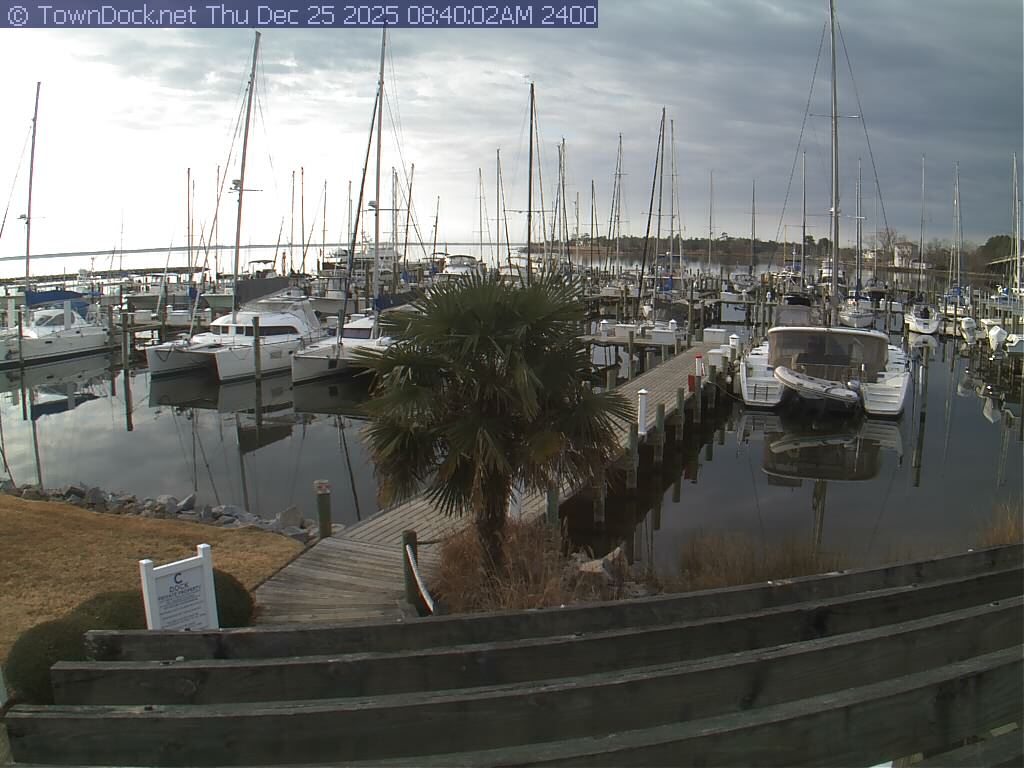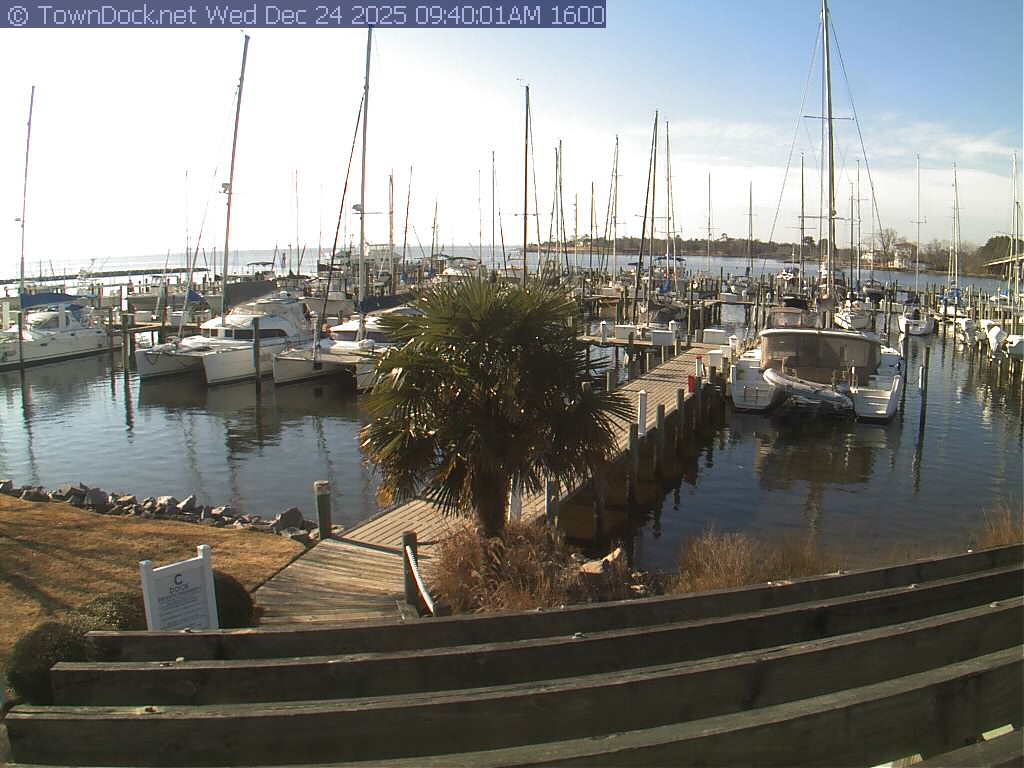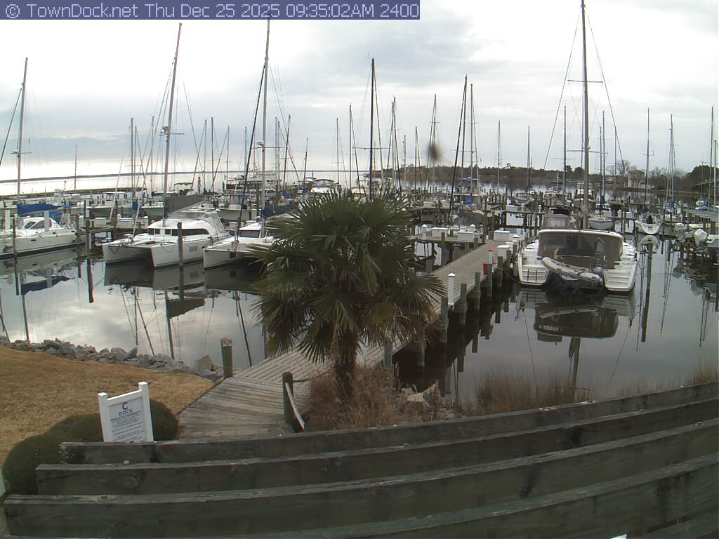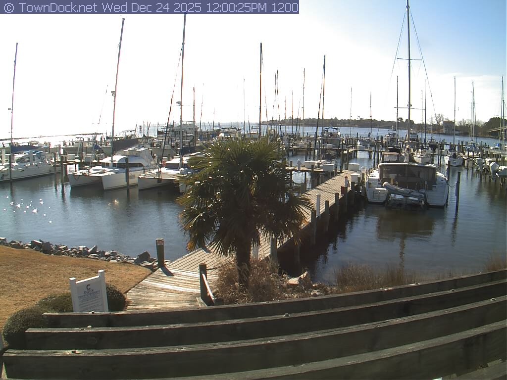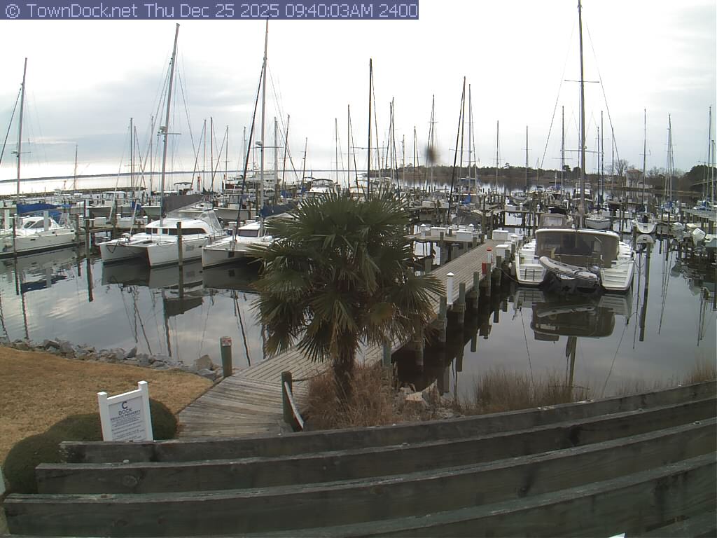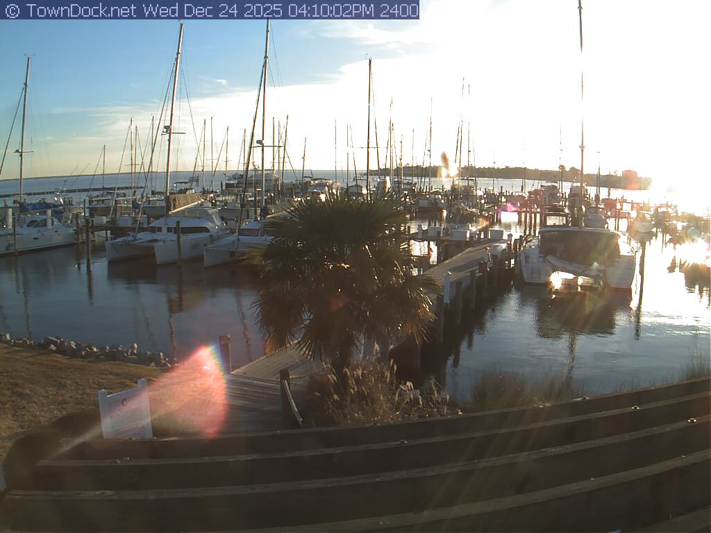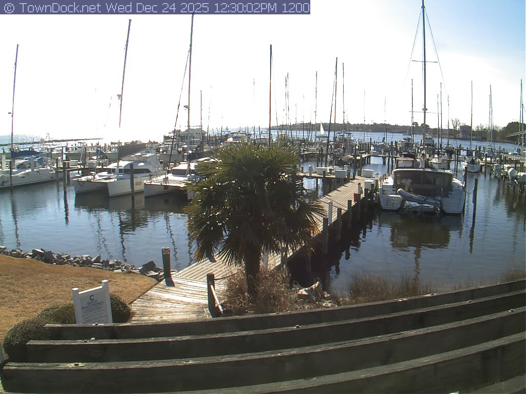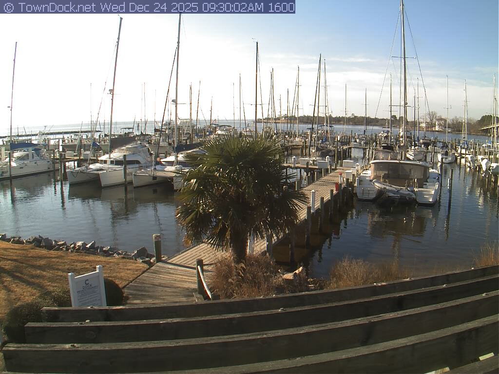 shows Oriental Harbor Village Marina, with the Oriental anchorage & Neuse River in the background. OHVM Cam takes a new picture every five minutes from dawn til just before dusk. Click on the image to see a larger version. Once you see that larger version, you can click (see arrow at right) to go back in time and see recent photos. Harbor Cam currently takes photos from 6:00am to 5:00pm.