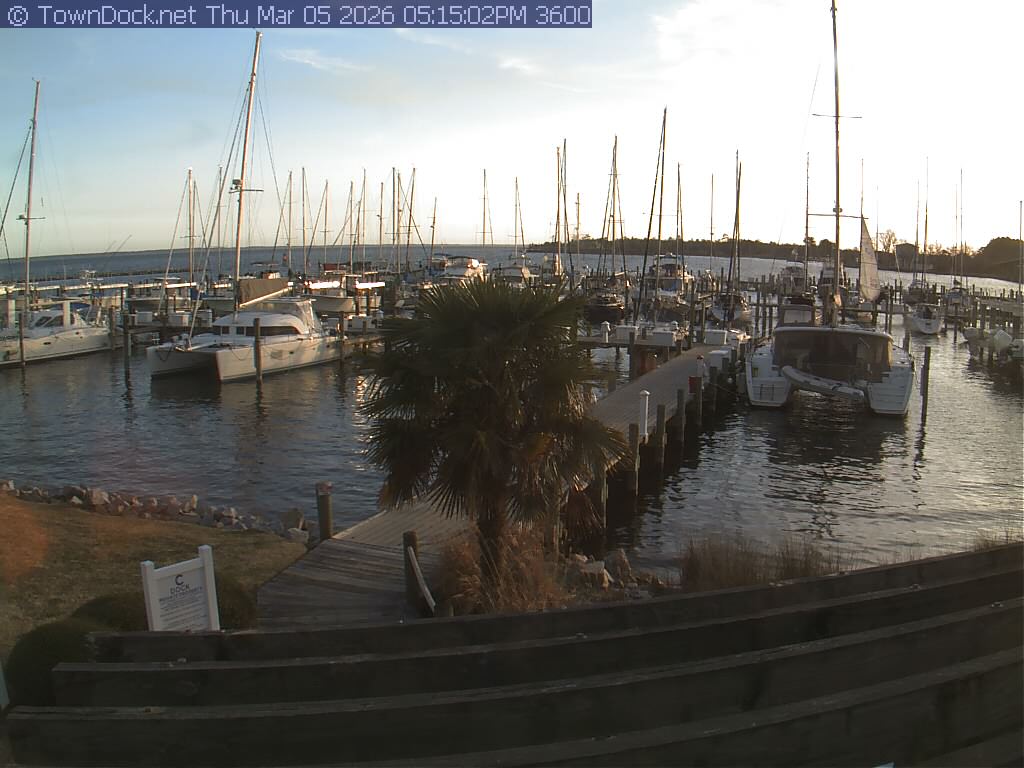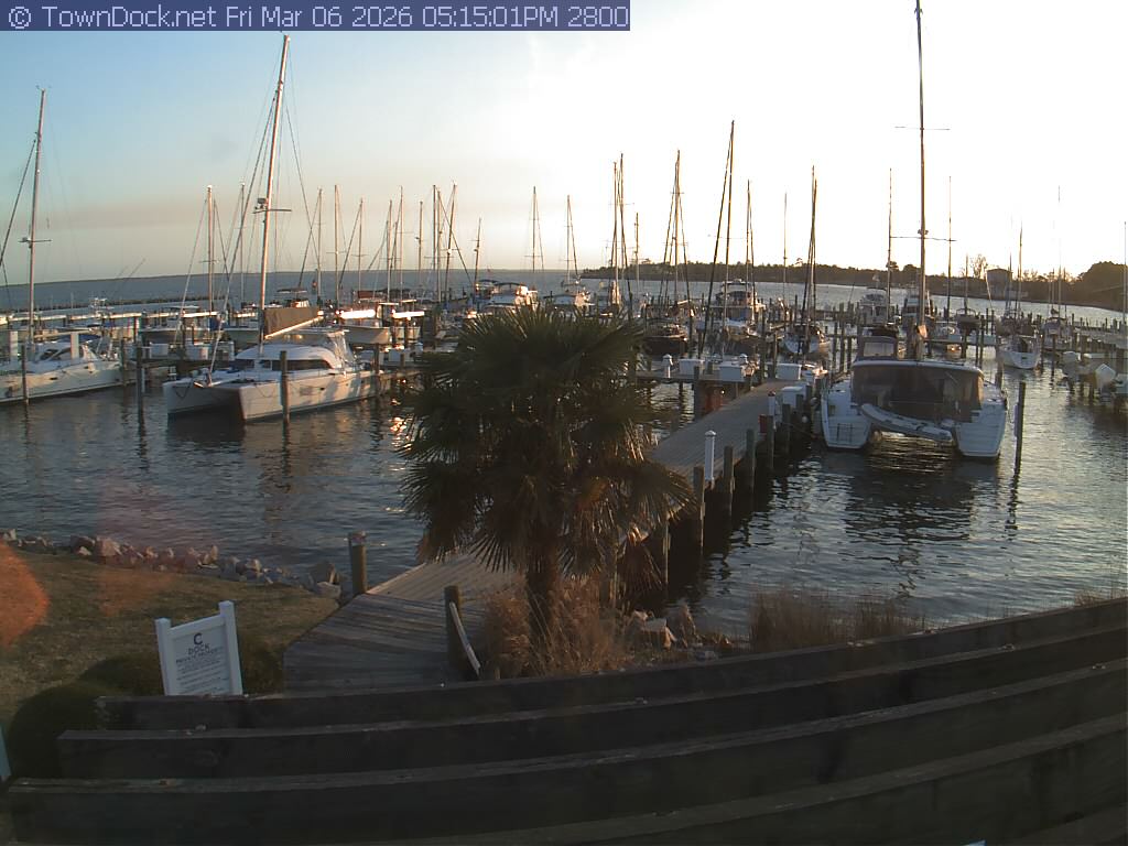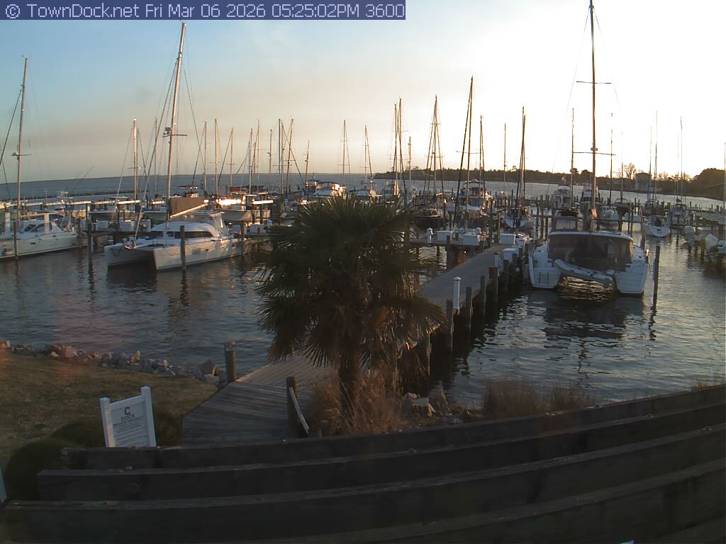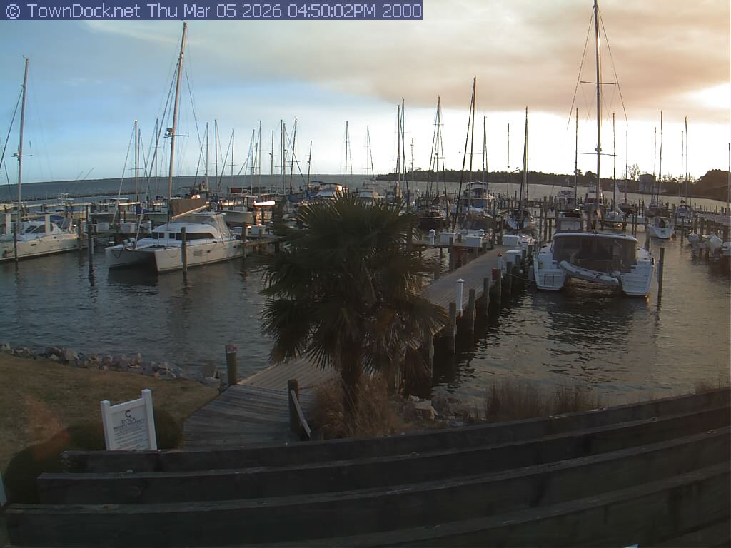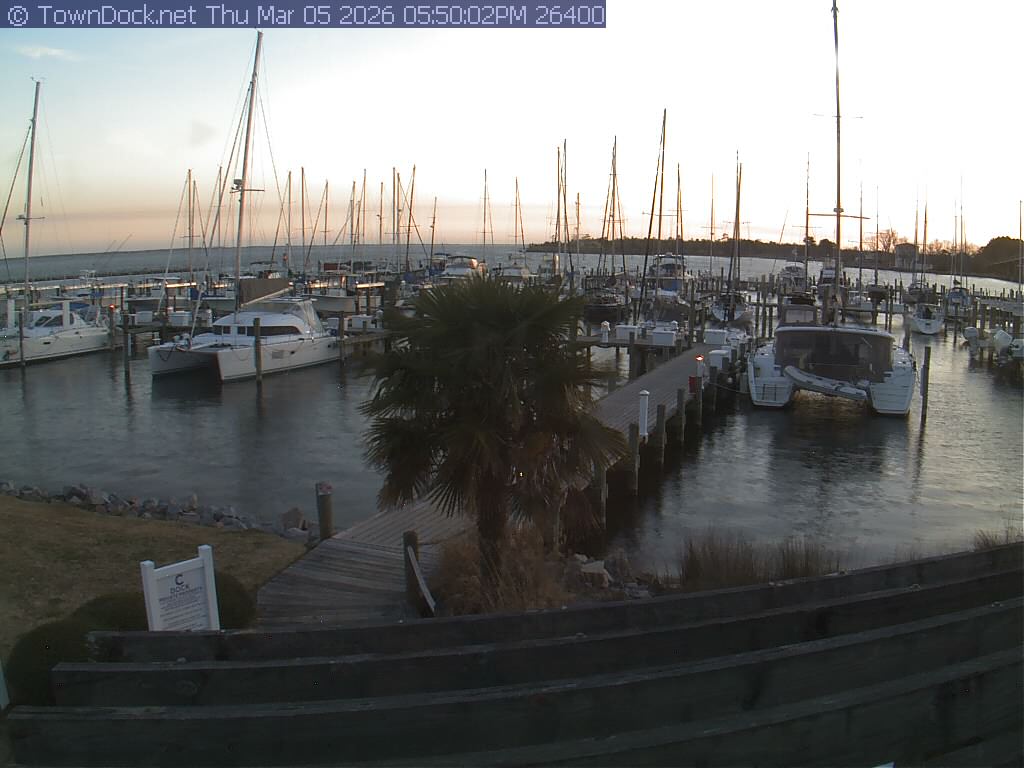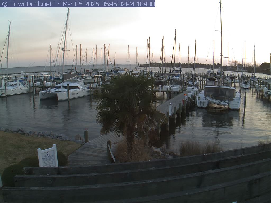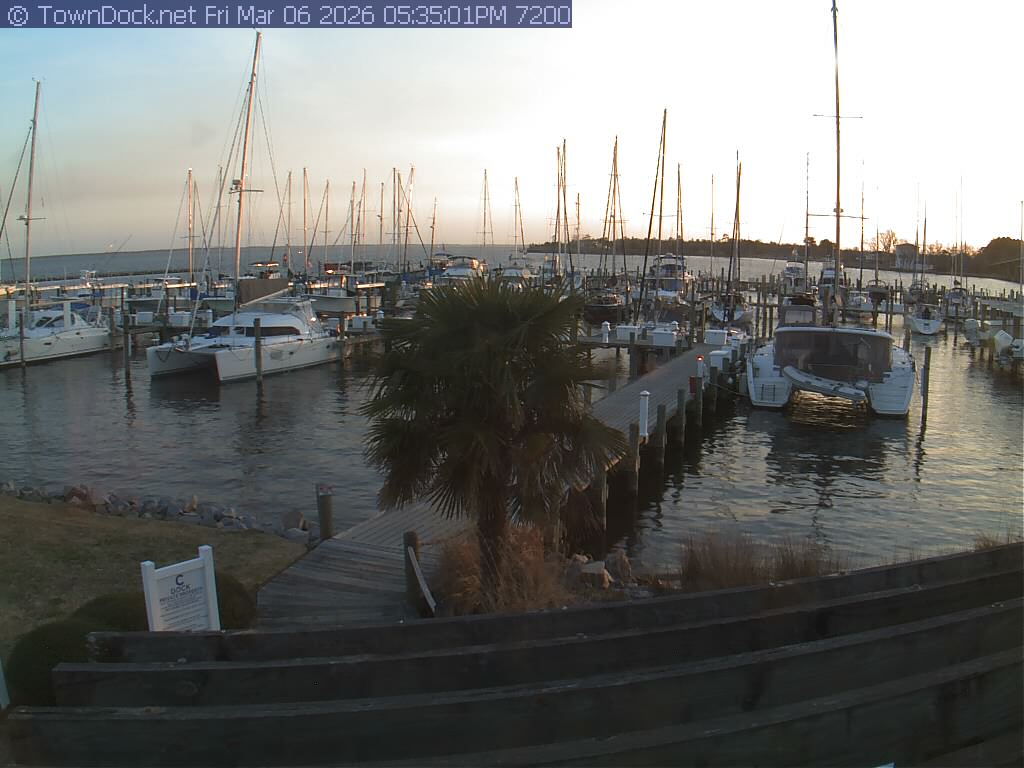 shows Oriental Harbor Village Marina, with the Oriental anchorage & Neuse River in the background. OHVM Cam takes a new picture every five minutes from dawn til just before dusk. Click on the image to see a larger version. Once you see that larger version, you can click (see arrow at right) to go back in time and see recent photos. Harbor Cam currently takes photos from 6:30am to 5:30pm.