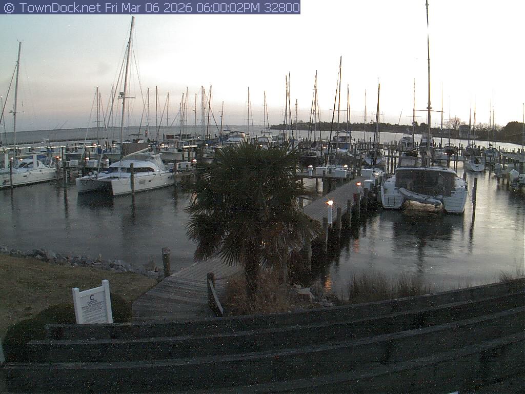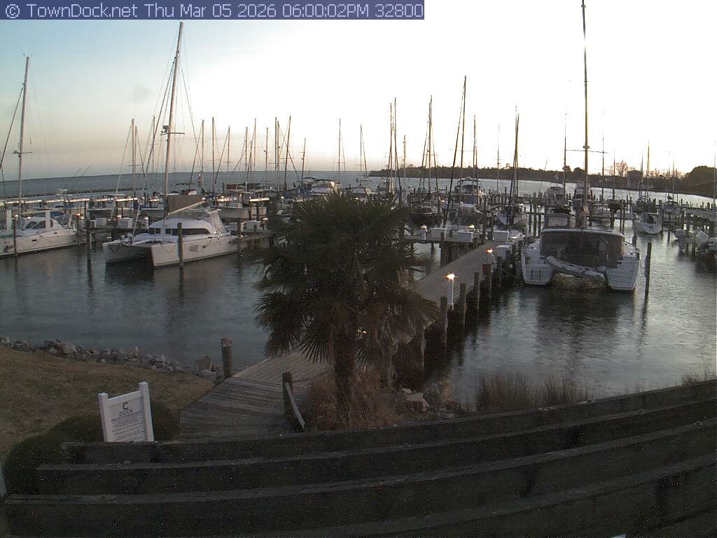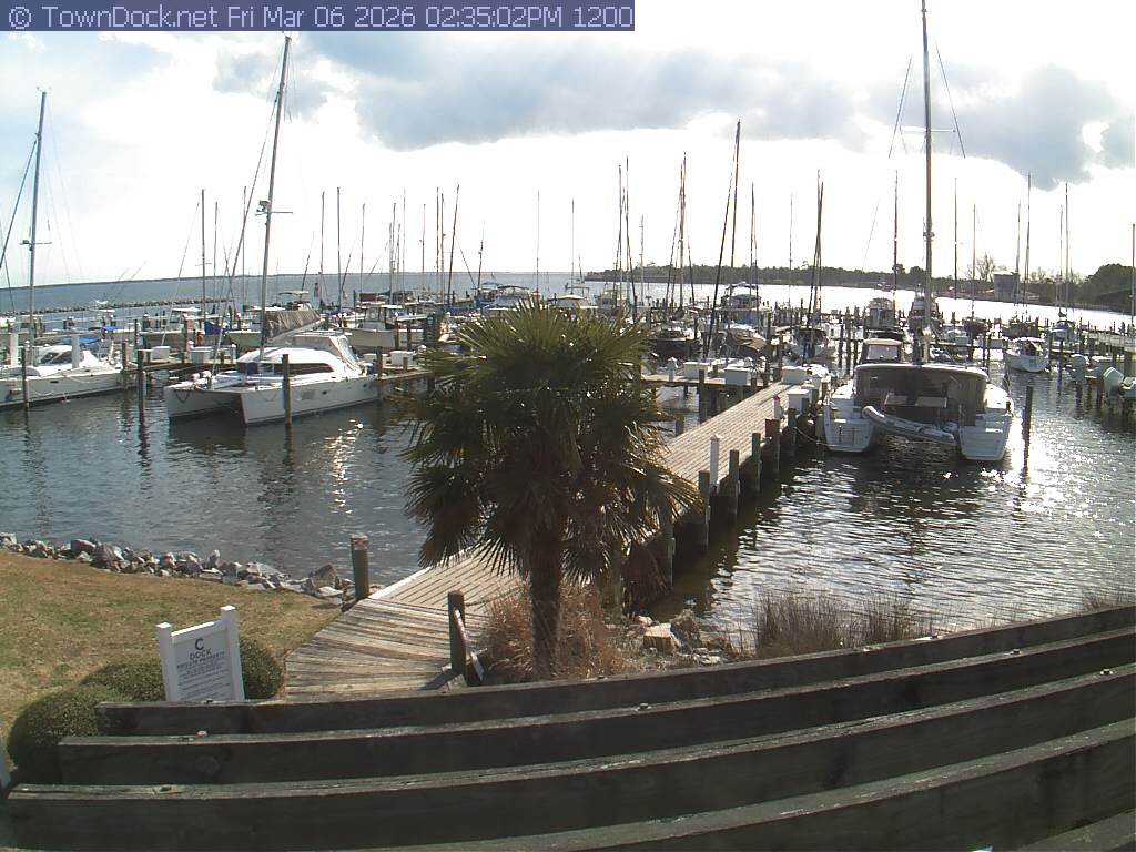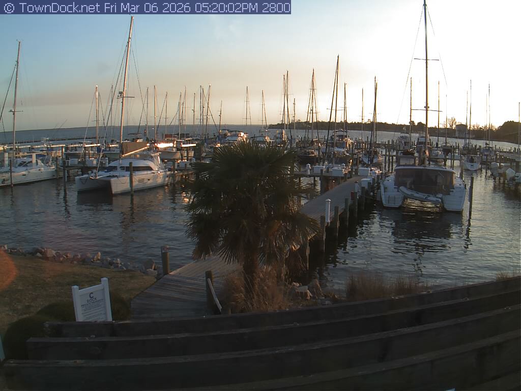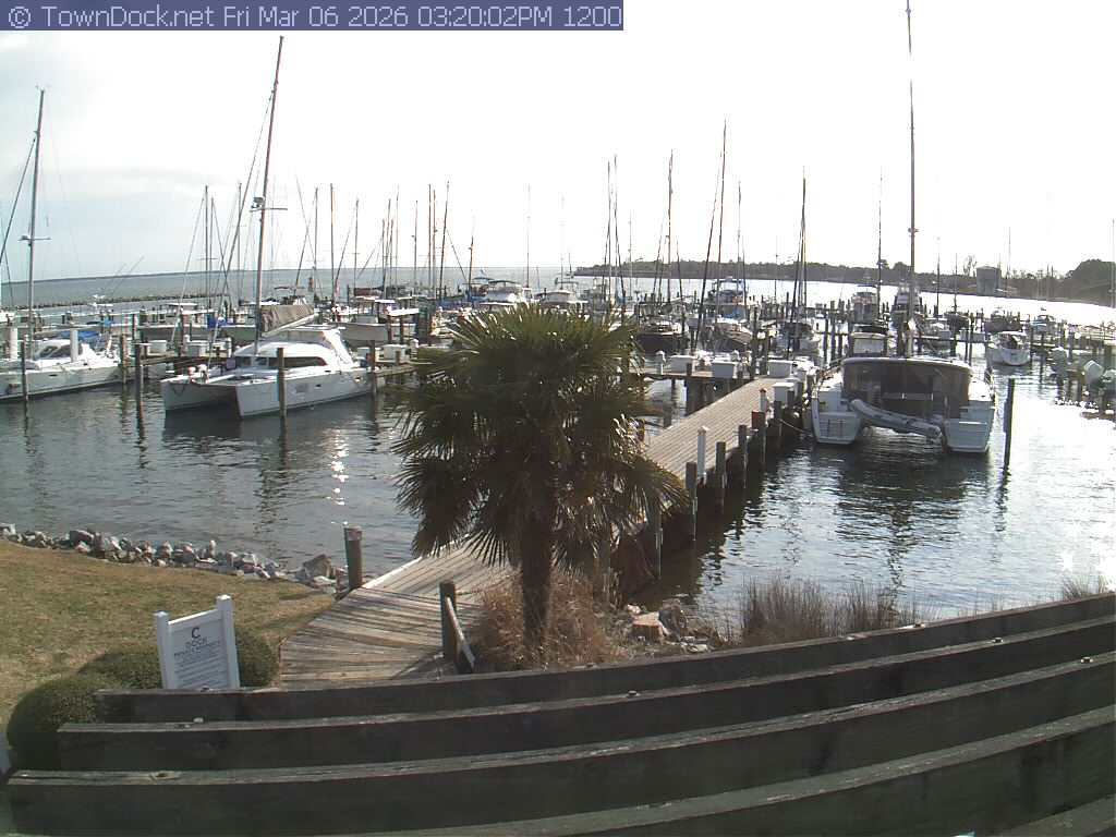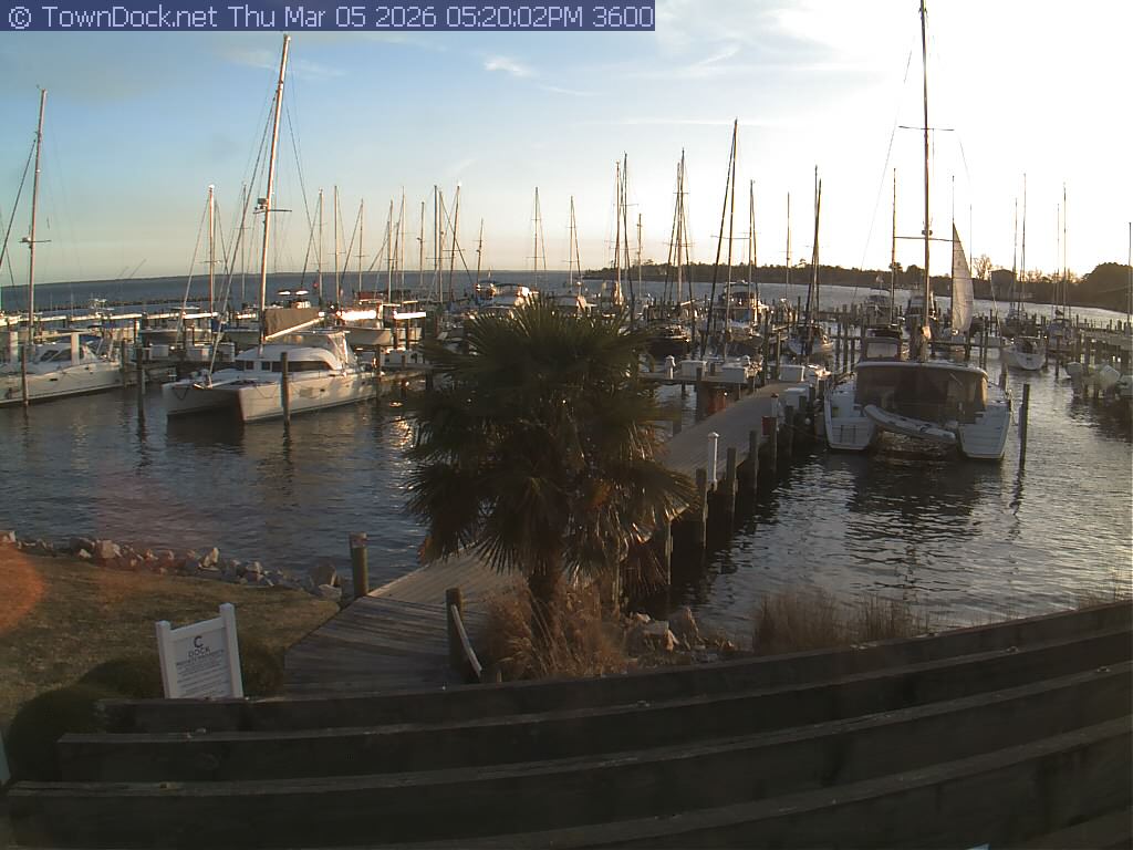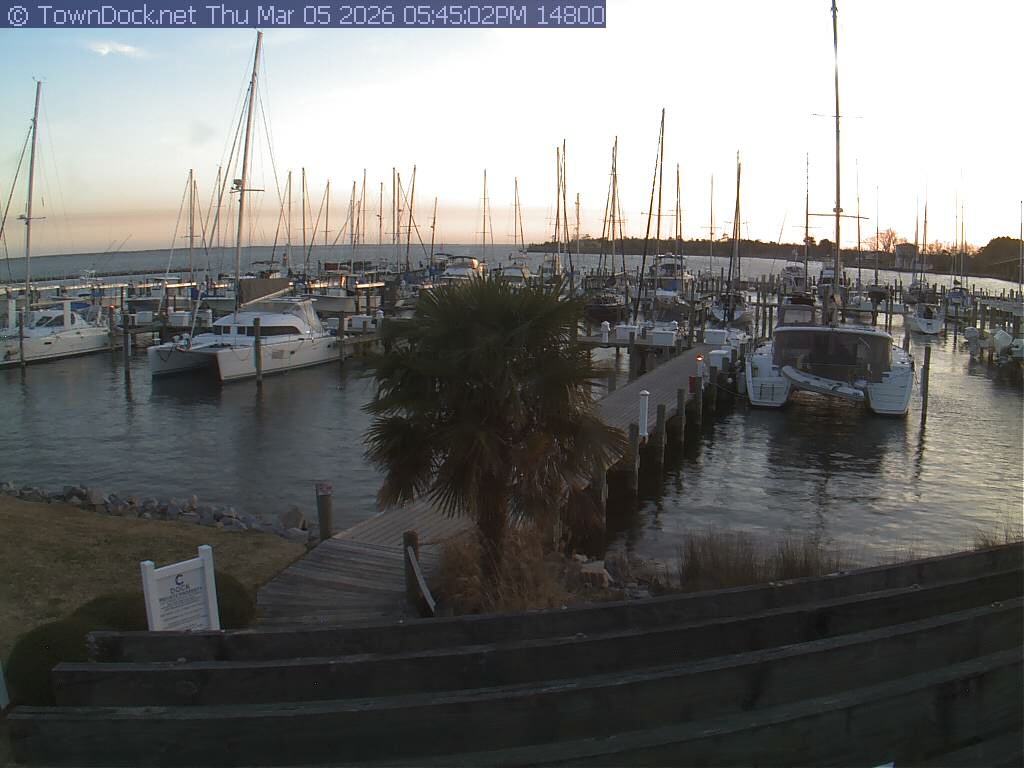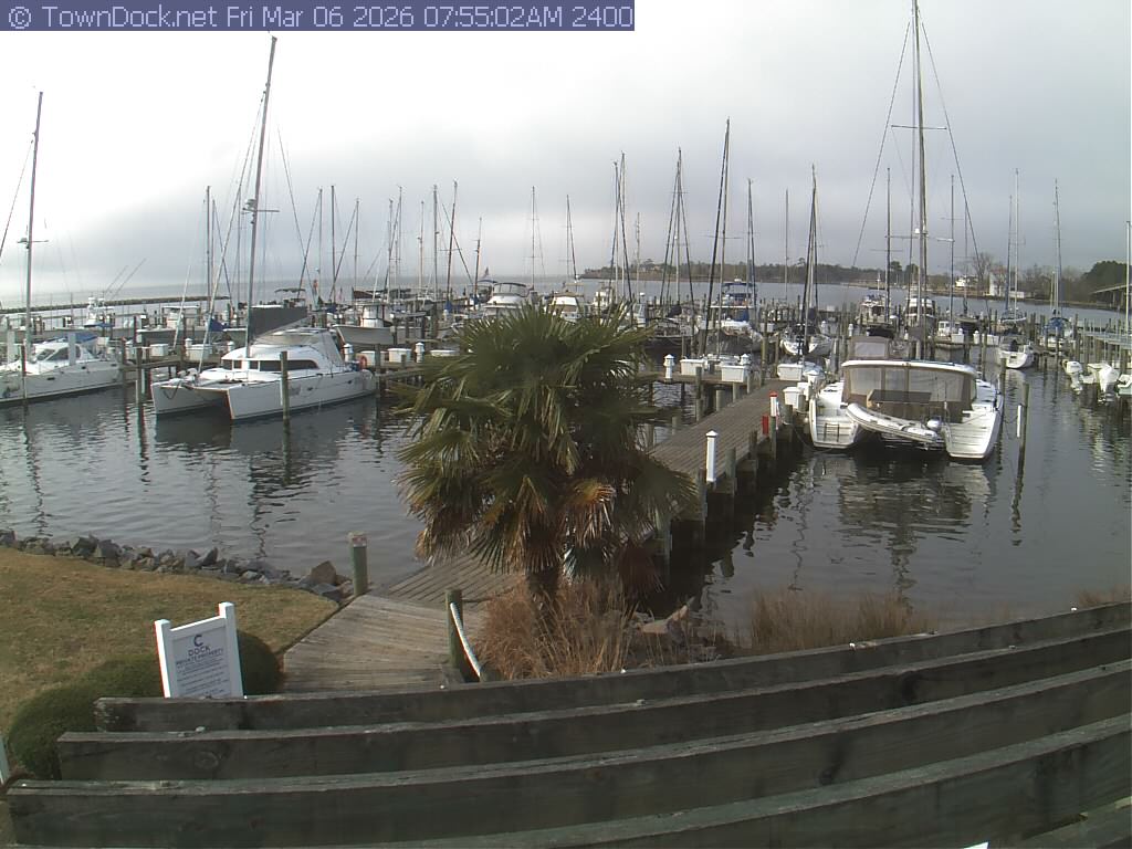 shows Oriental Harbor Village Marina, with the Oriental anchorage & Neuse River in the background. OHVM Cam takes a new picture every five minutes from dawn til just before dusk. Click on the image to see a larger version. Once you see that larger version, you can click (see arrow at right) to go back in time and see recent photos. Harbor Cam currently takes photos from 6:30am to 5:30pm.