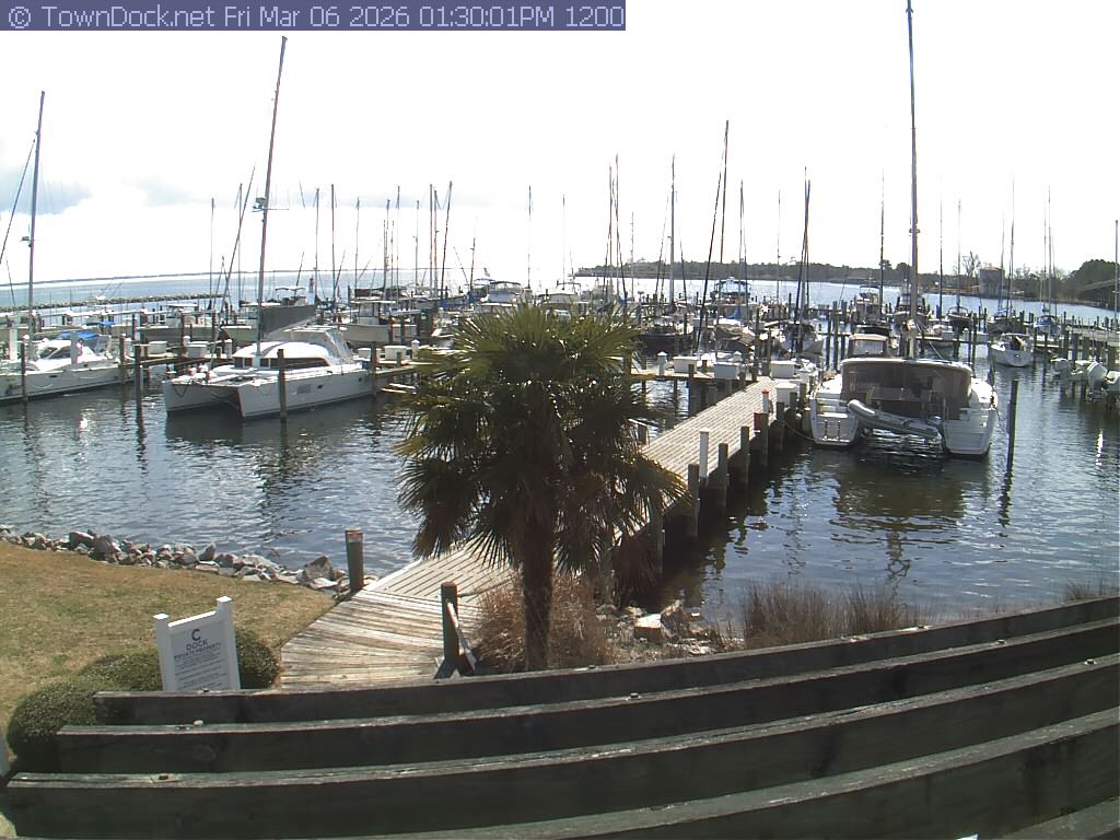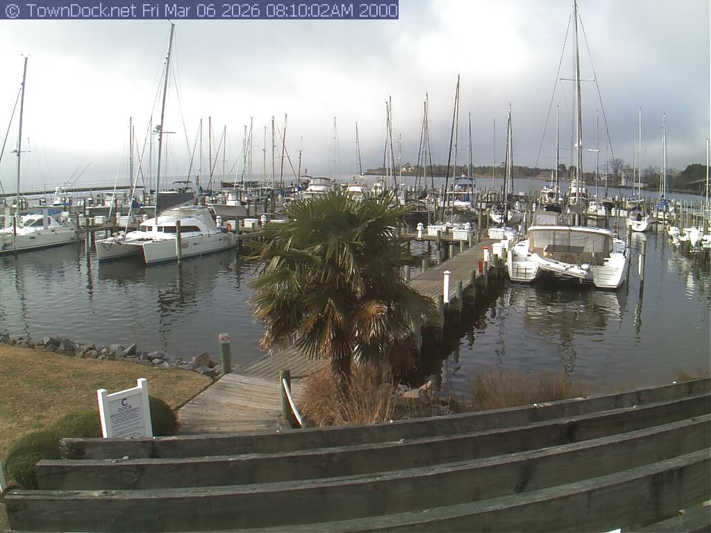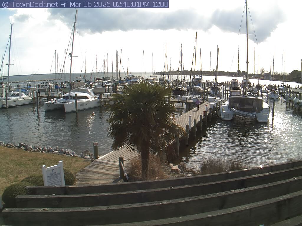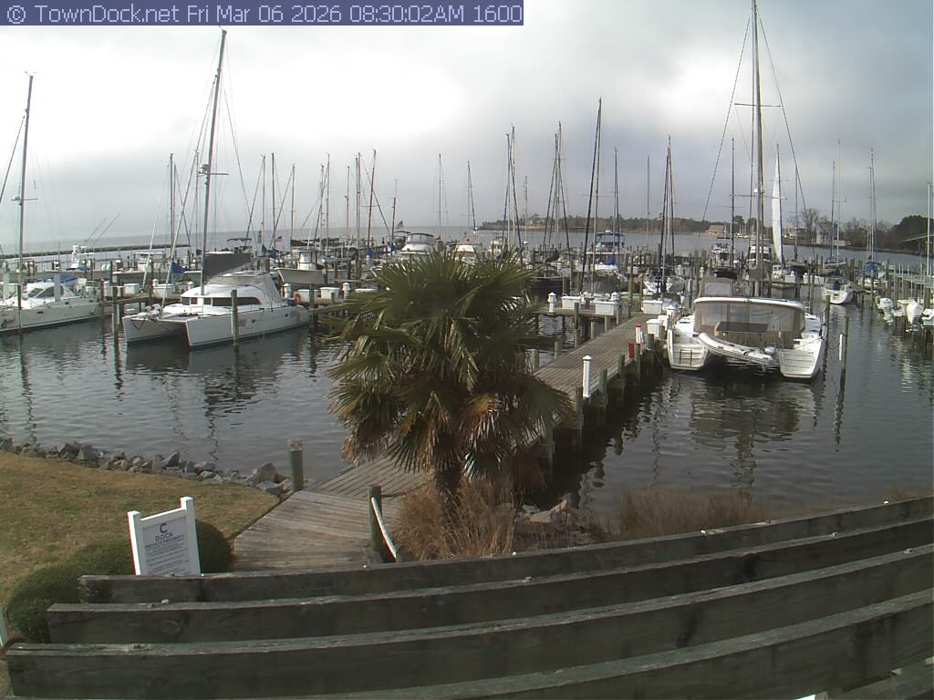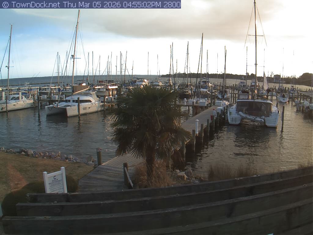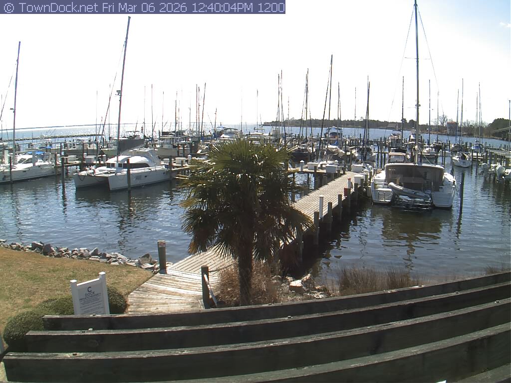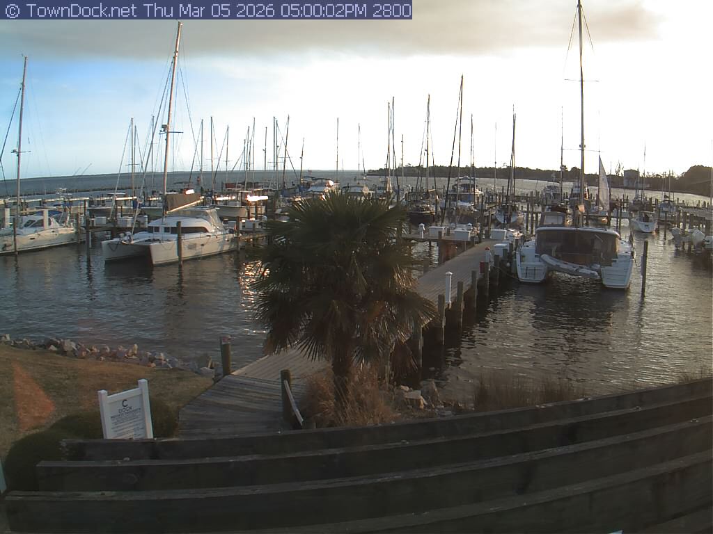 shows Oriental Harbor Village Marina, with the Oriental anchorage & Neuse River in the background. OHVM Cam takes a new picture every five minutes from dawn til just before dusk. Click on the image to see a larger version. Once you see that larger version, you can click (see arrow at right) to go back in time and see recent photos. Harbor Cam currently takes photos from 6:30am to 5:30pm.