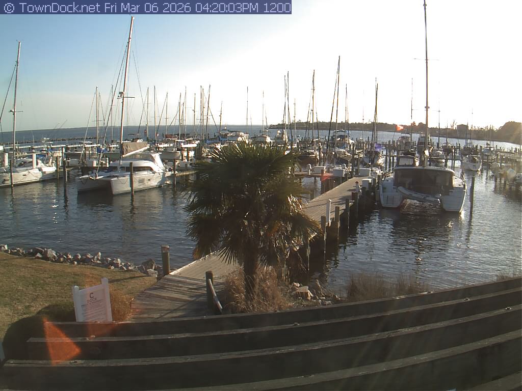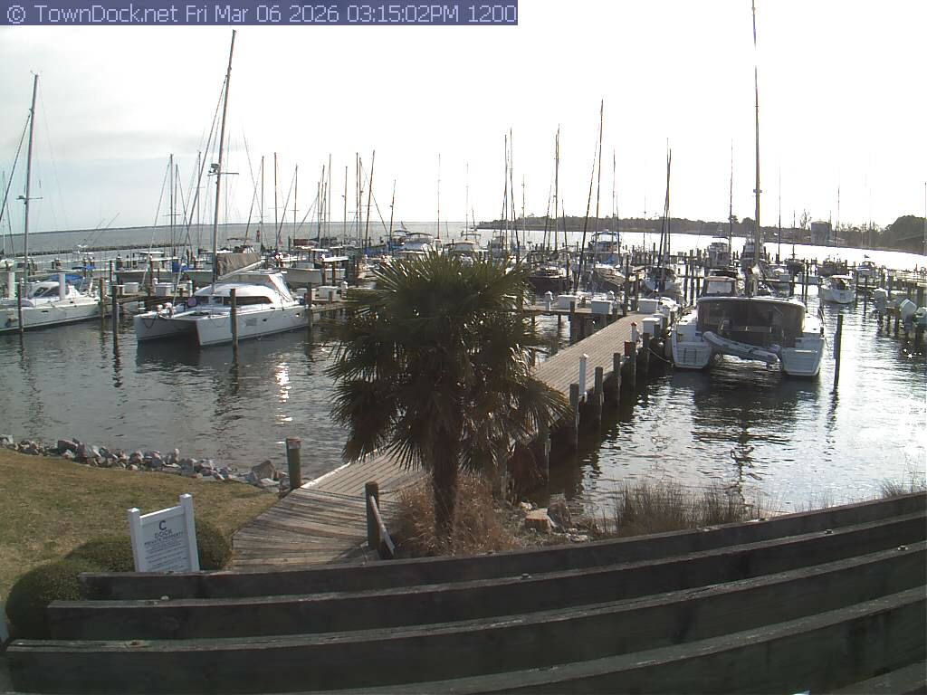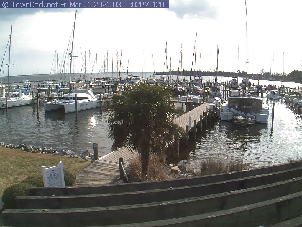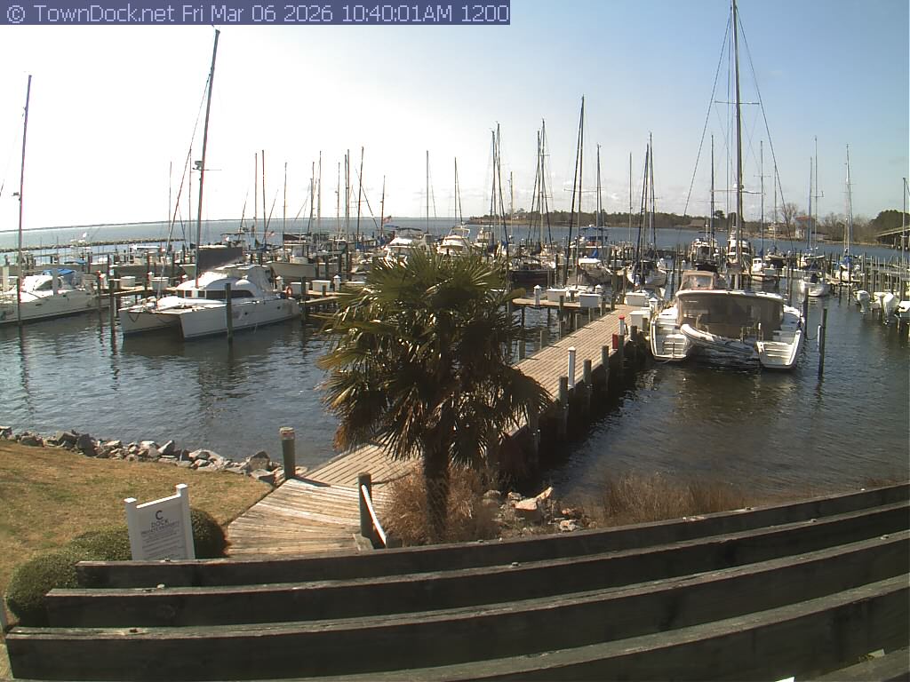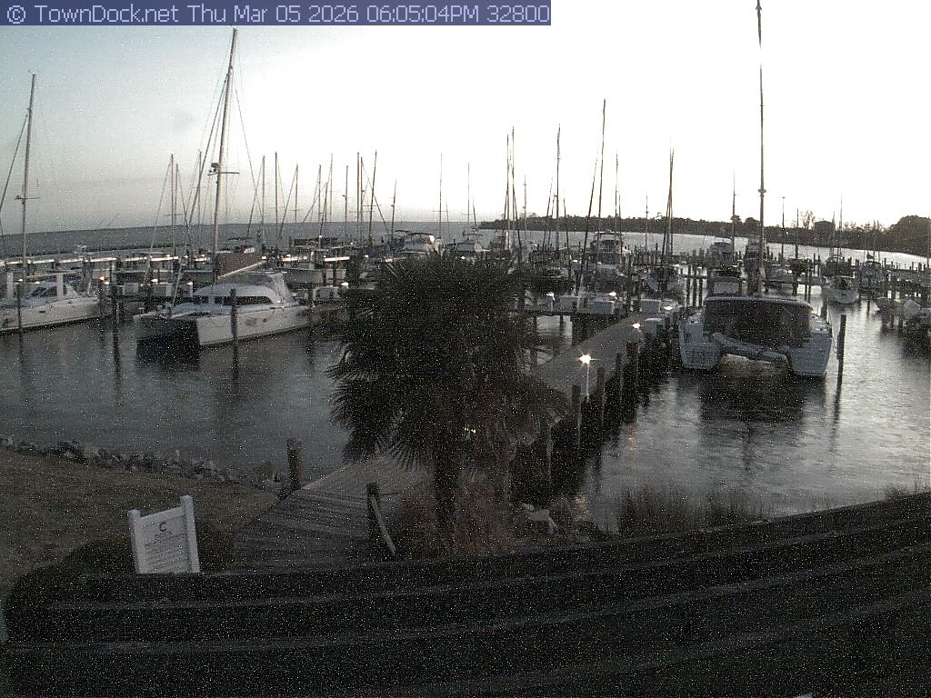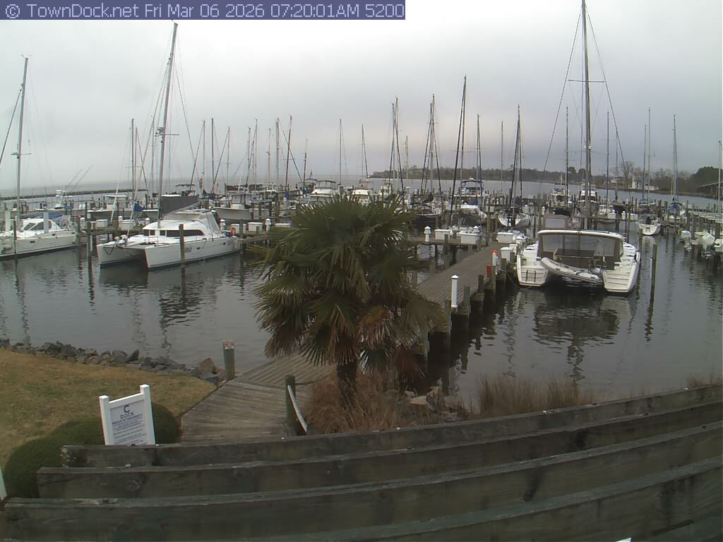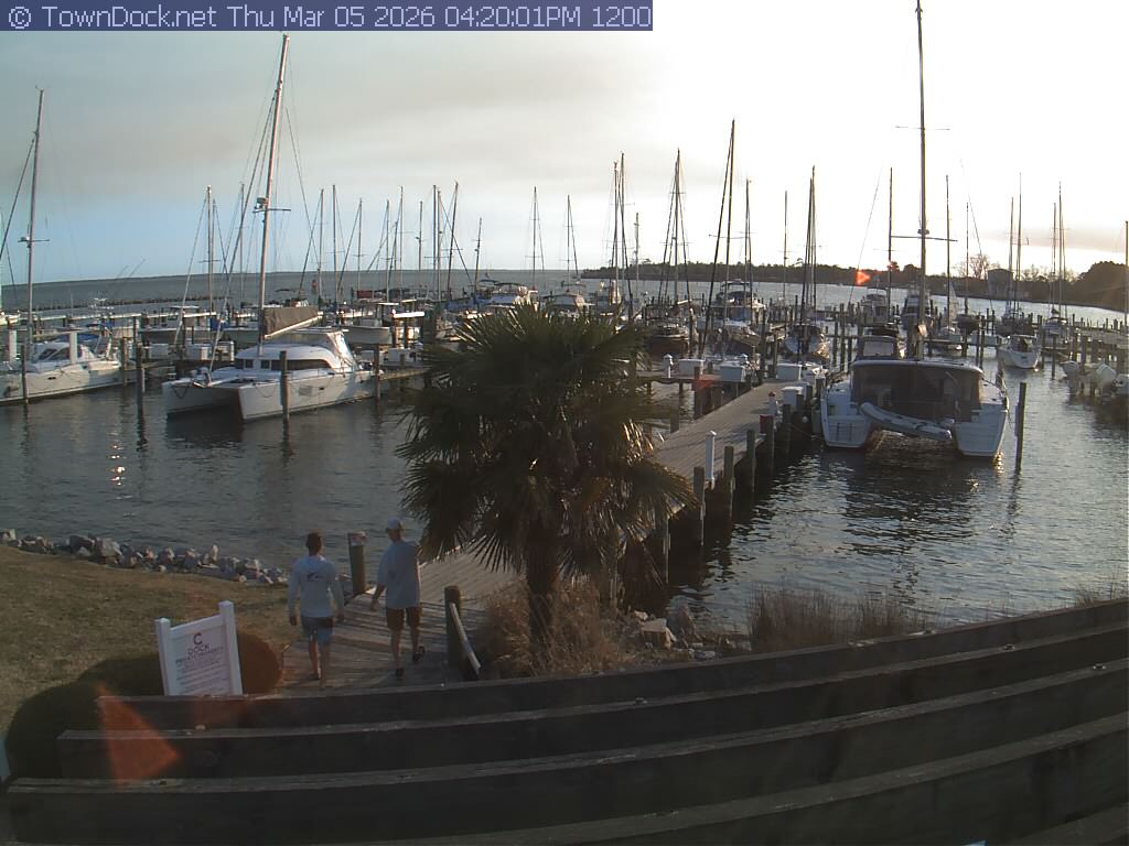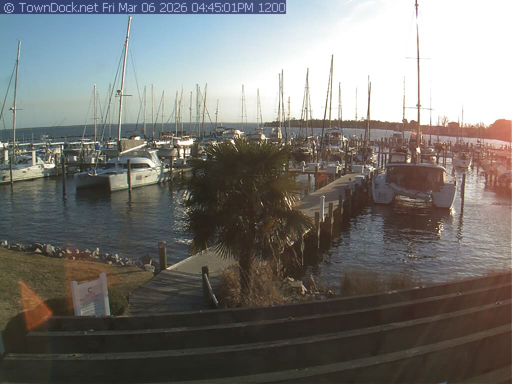 shows Oriental Harbor Village Marina, with the Oriental anchorage & Neuse River in the background. OHVM Cam takes a new picture every five minutes from dawn til just before dusk. Click on the image to see a larger version. Once you see that larger version, you can click (see arrow at right) to go back in time and see recent photos. Harbor Cam currently takes photos from 6:30am to 5:30pm.