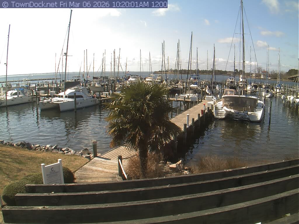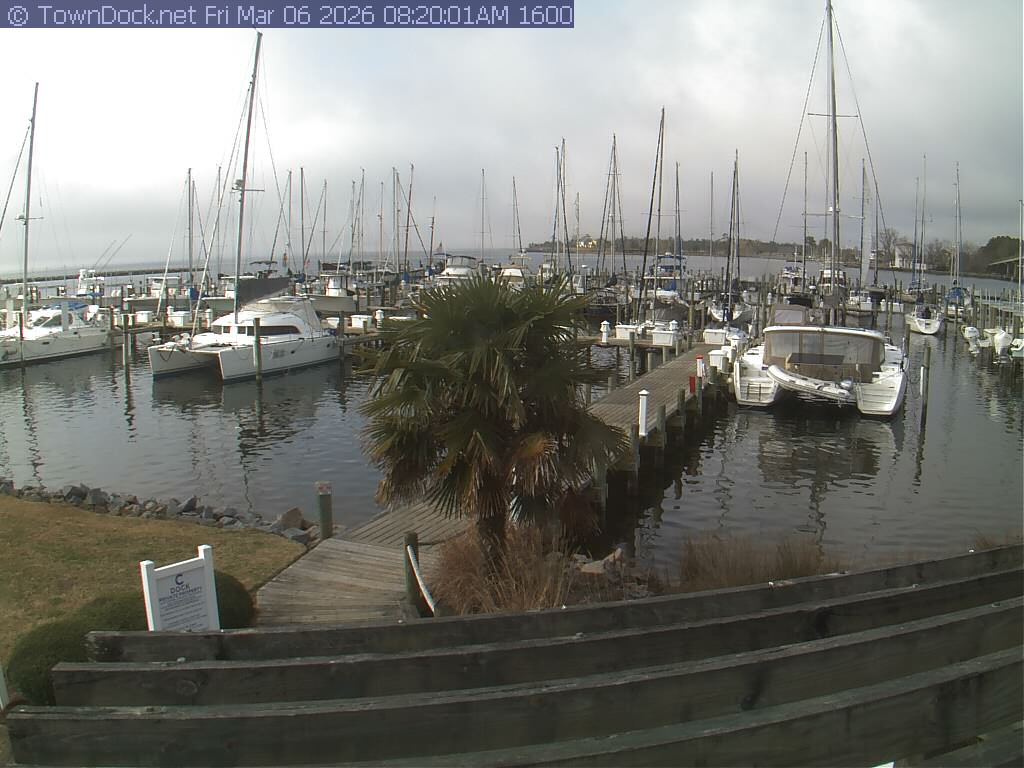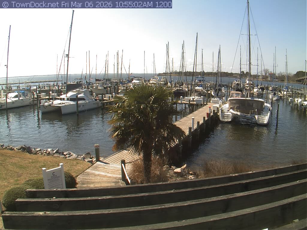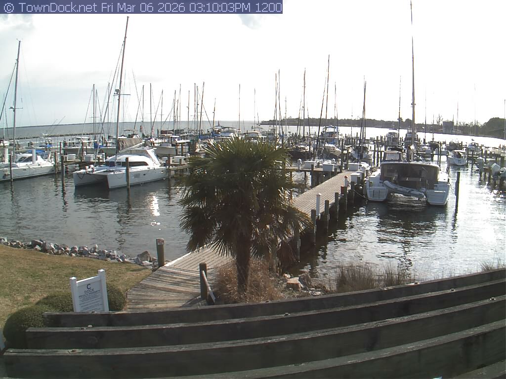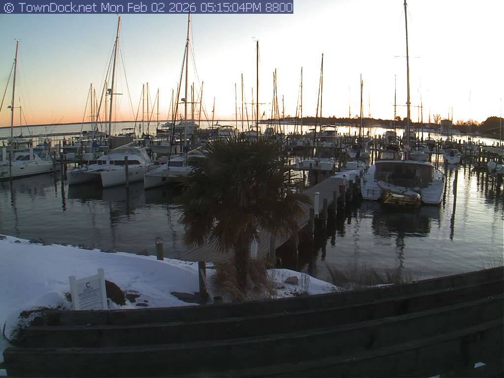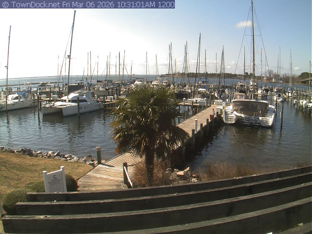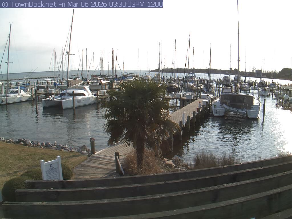 shows Oriental Harbor Village Marina, with the Oriental anchorage & Neuse River in the background. OHVM Cam takes a new picture every five minutes from dawn til just before dusk. Click on the image to see a larger version. Once you see that larger version, you can click (see arrow at right) to go back in time and see recent photos. Harbor Cam currently takes photos from 6:30am to 5:30pm.