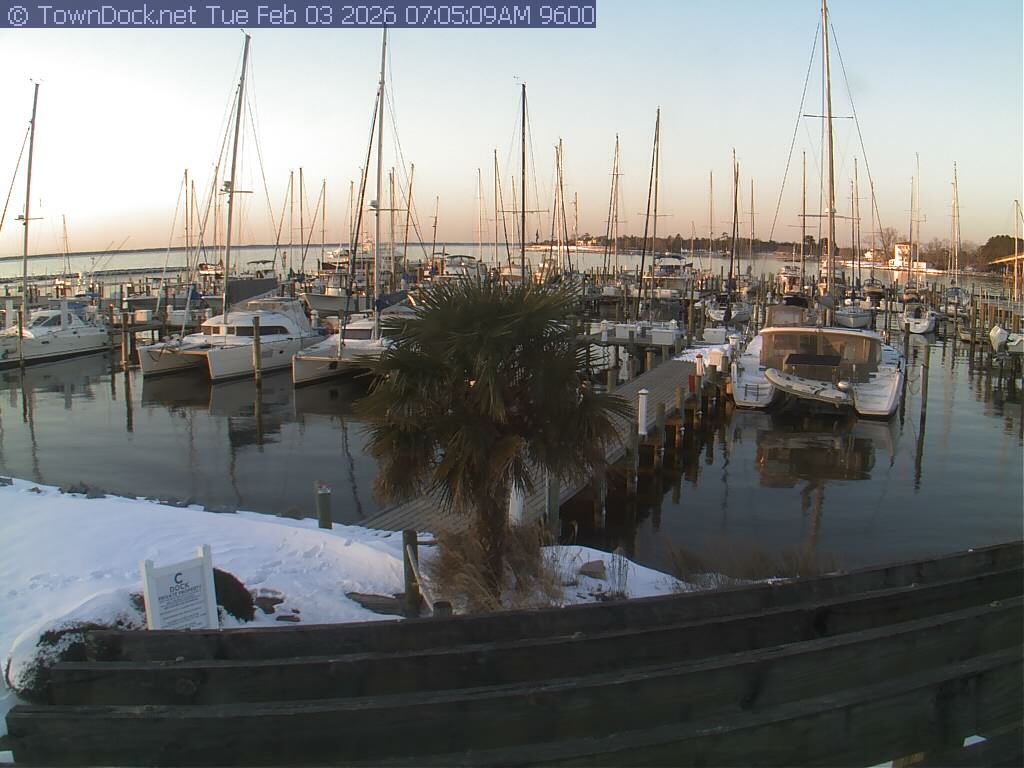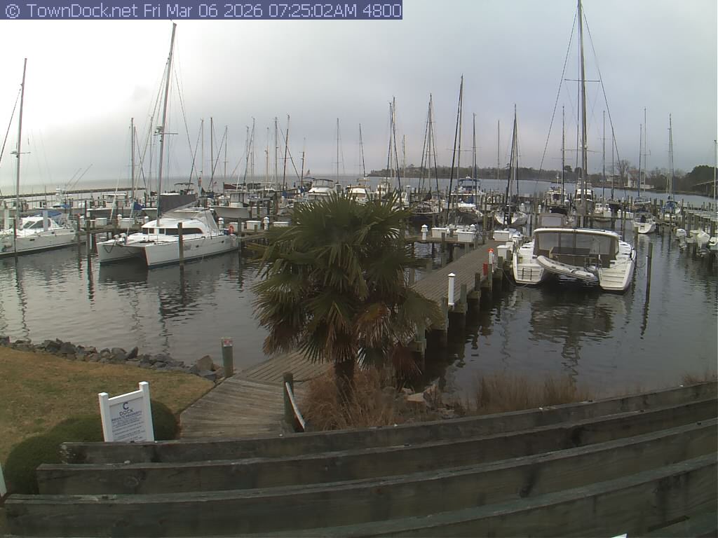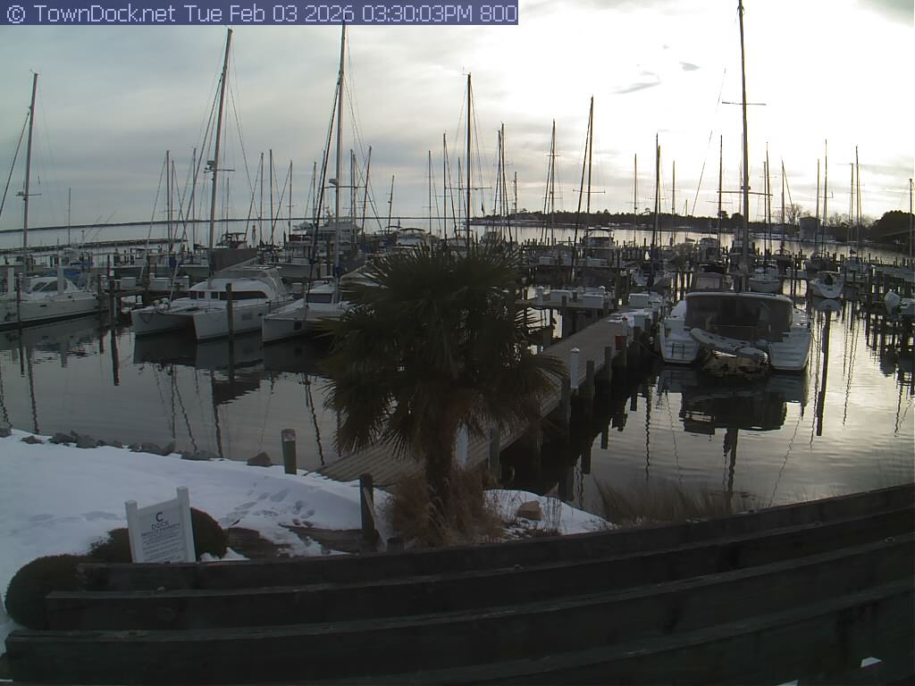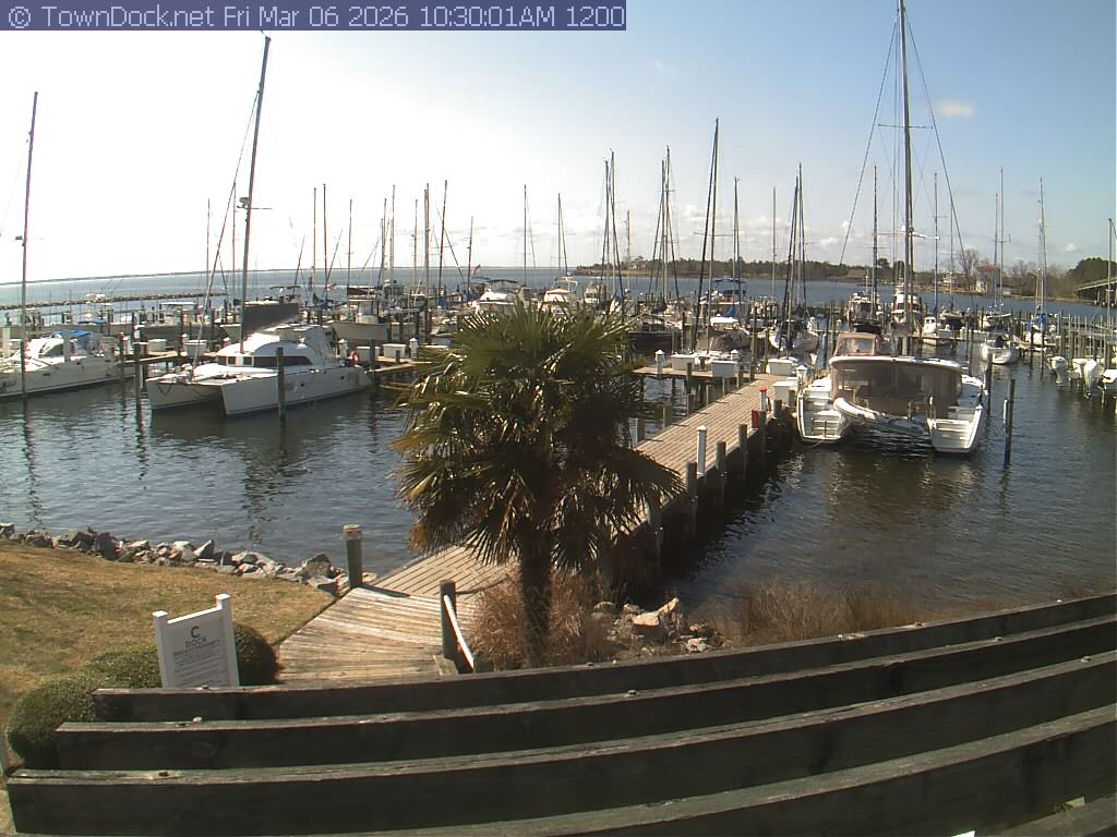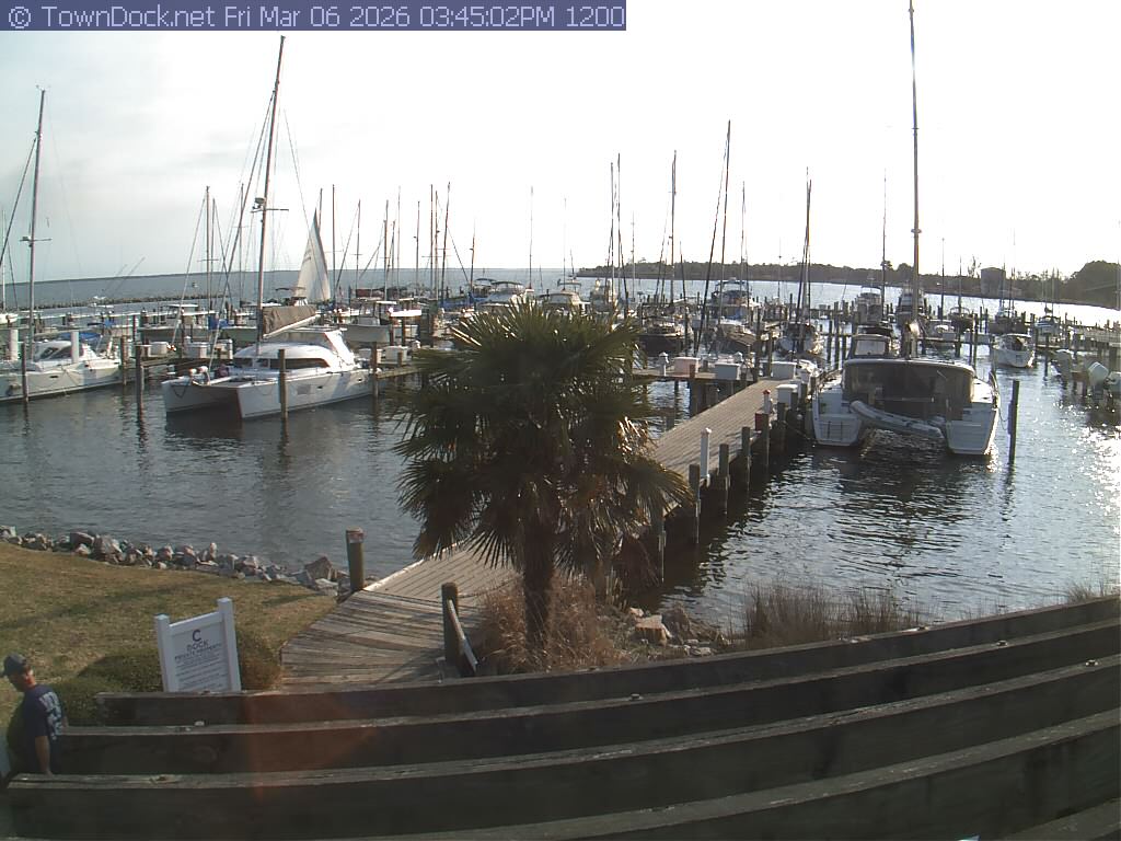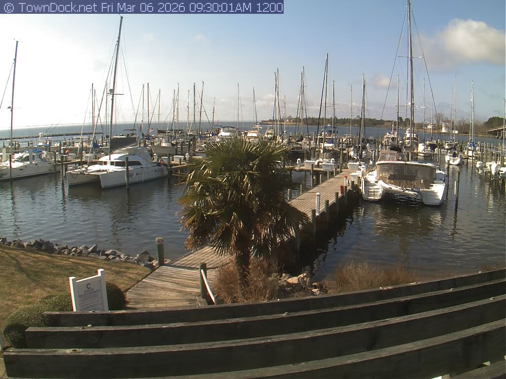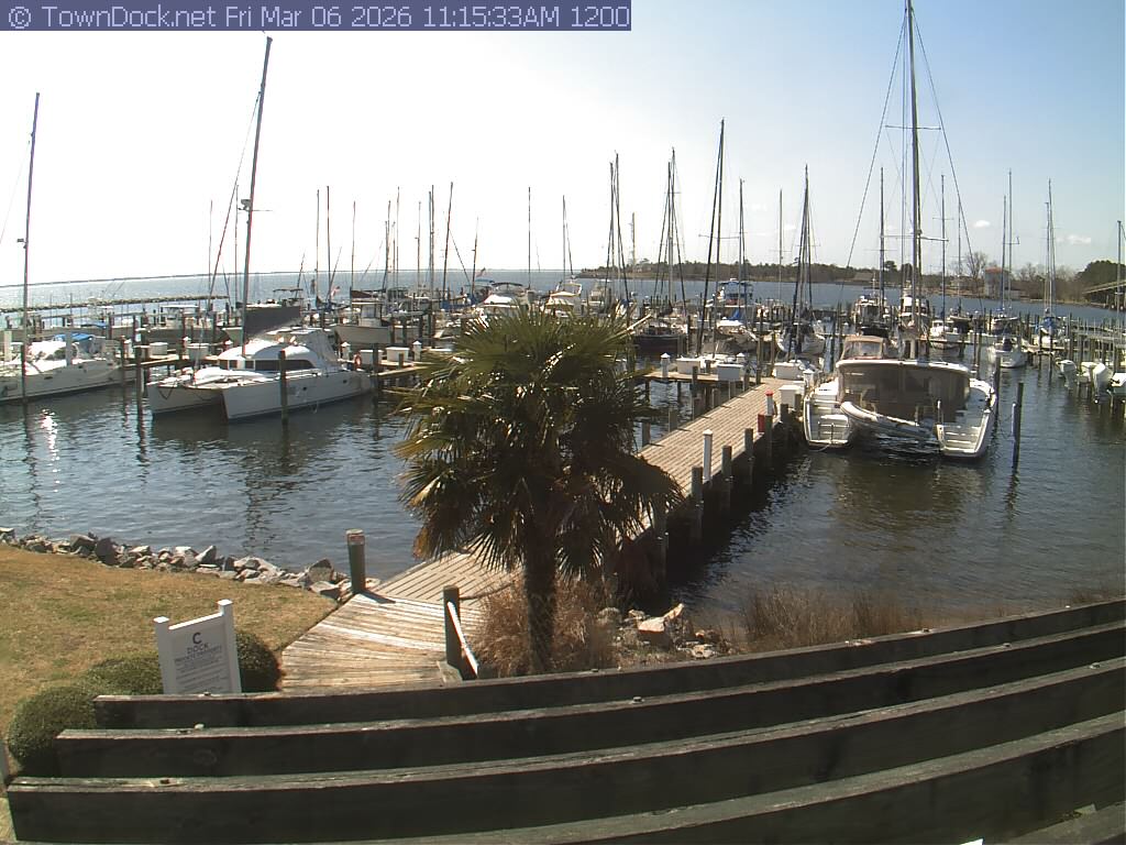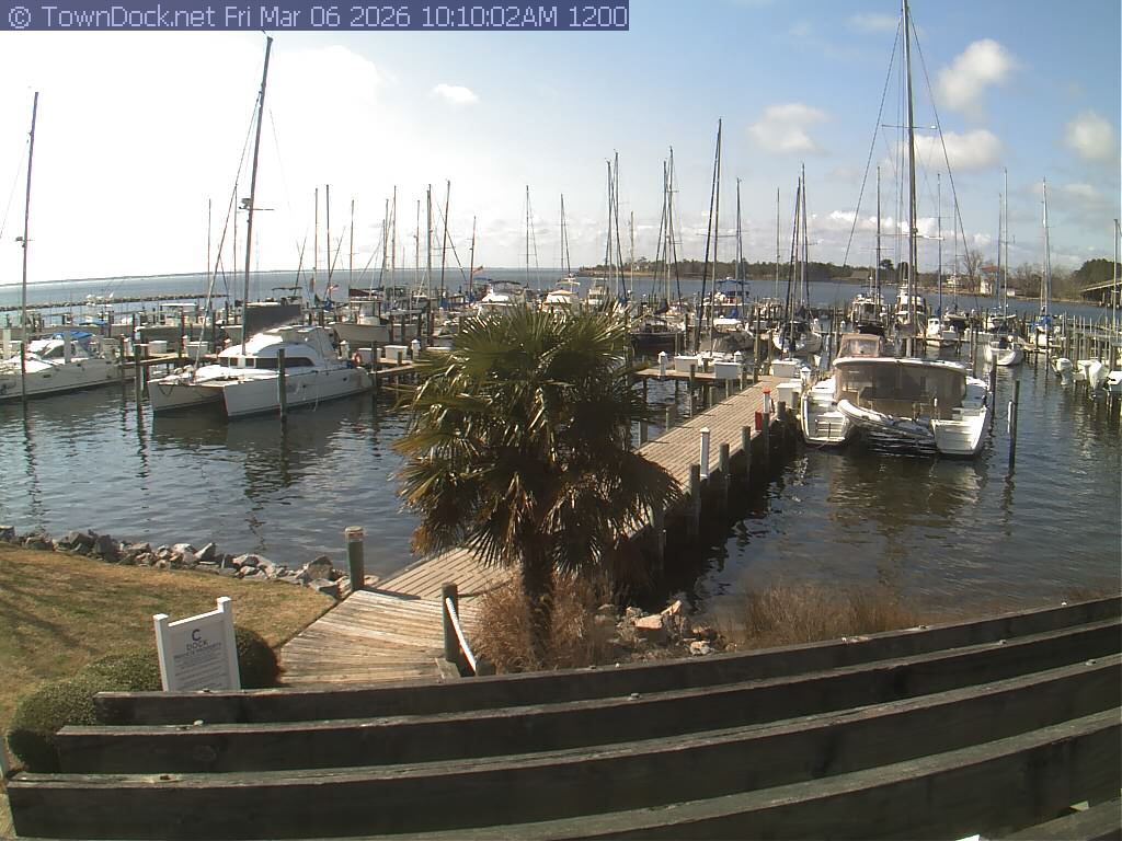 shows Oriental Harbor Village Marina, with the Oriental anchorage & Neuse River in the background. OHVM Cam takes a new picture every five minutes from dawn til just before dusk. Click on the image to see a larger version. Once you see that larger version, you can click (see arrow at right) to go back in time and see recent photos. Harbor Cam currently takes photos from 6:30am to 5:30pm.