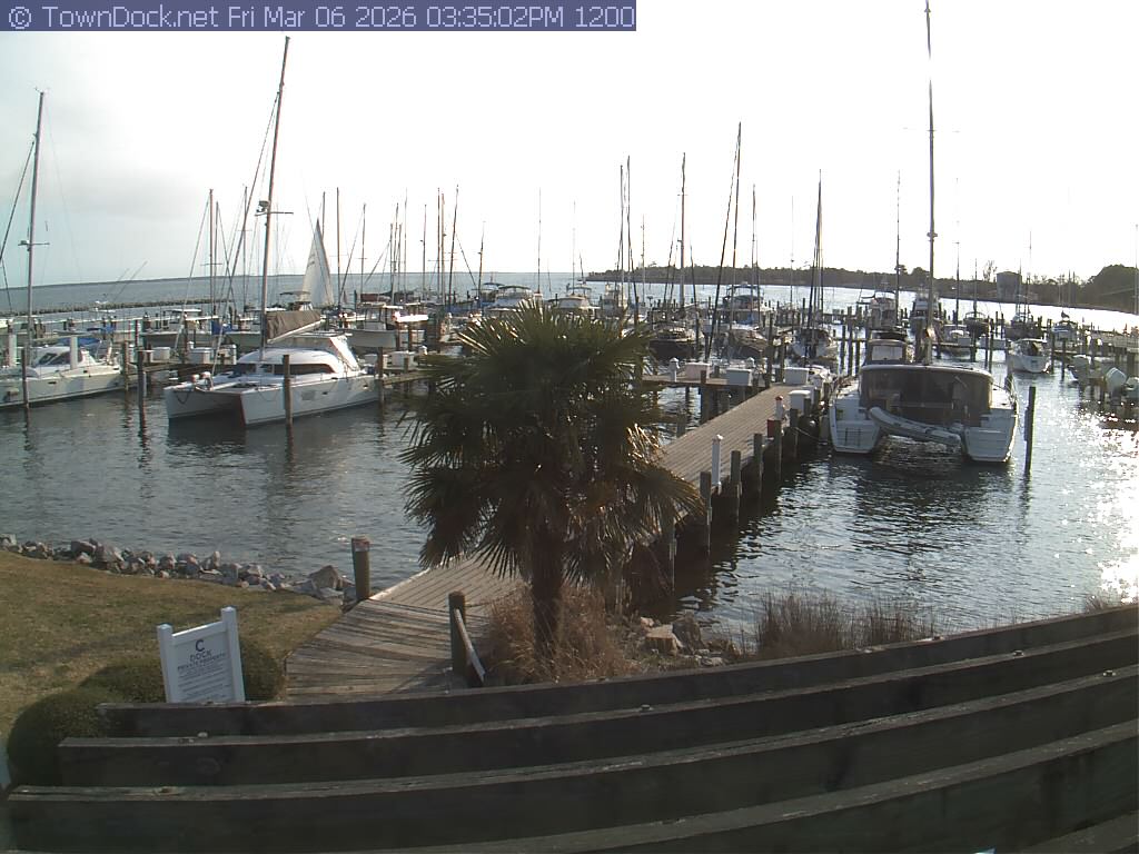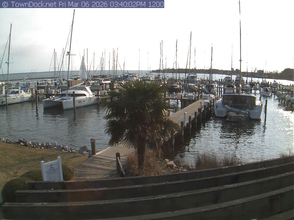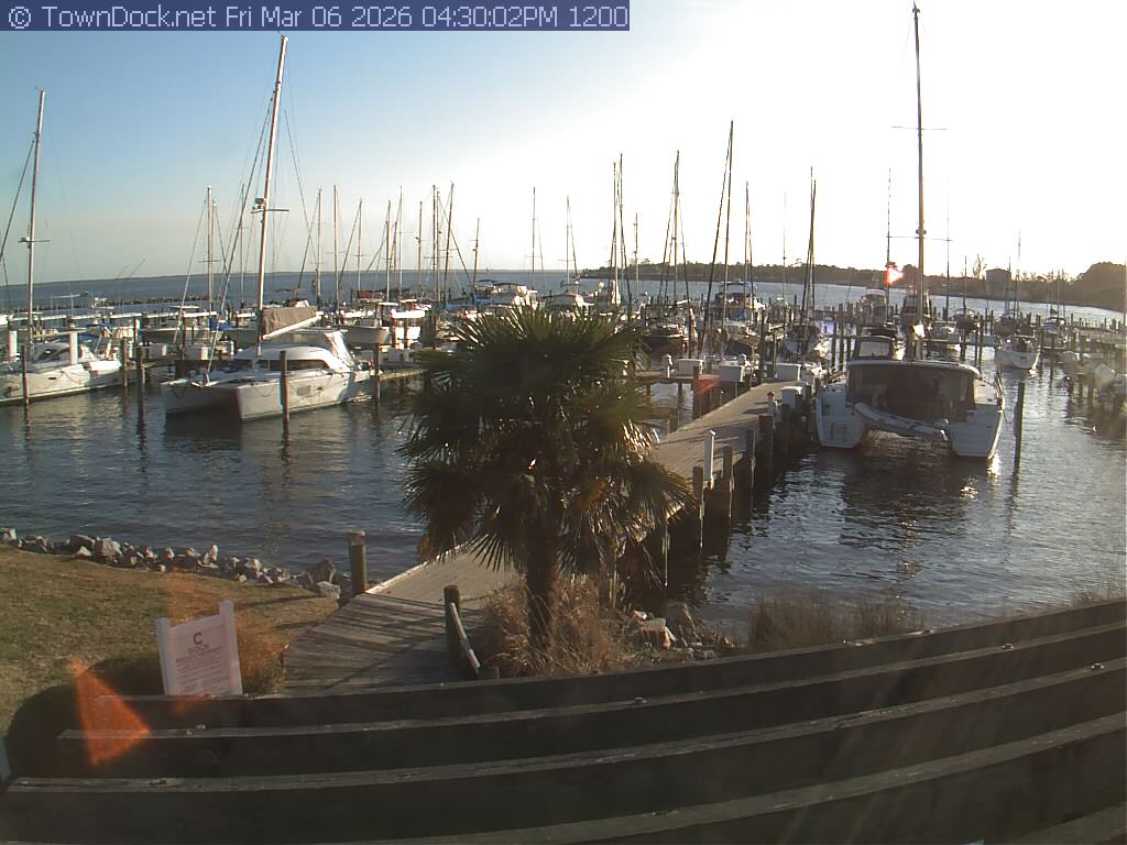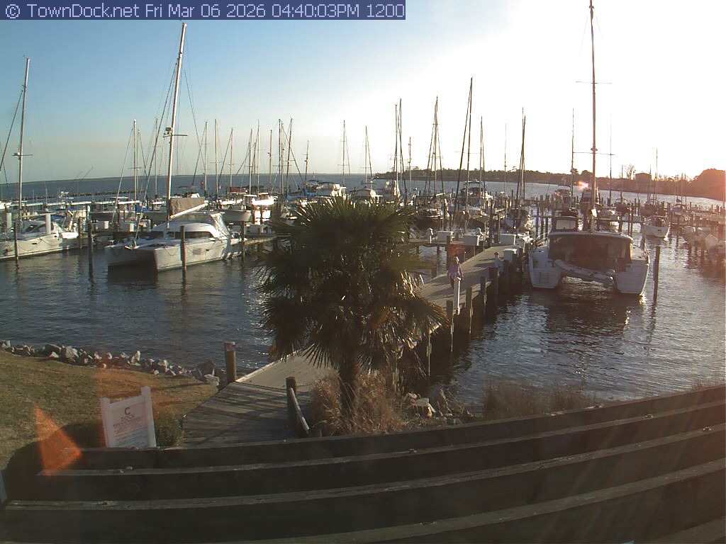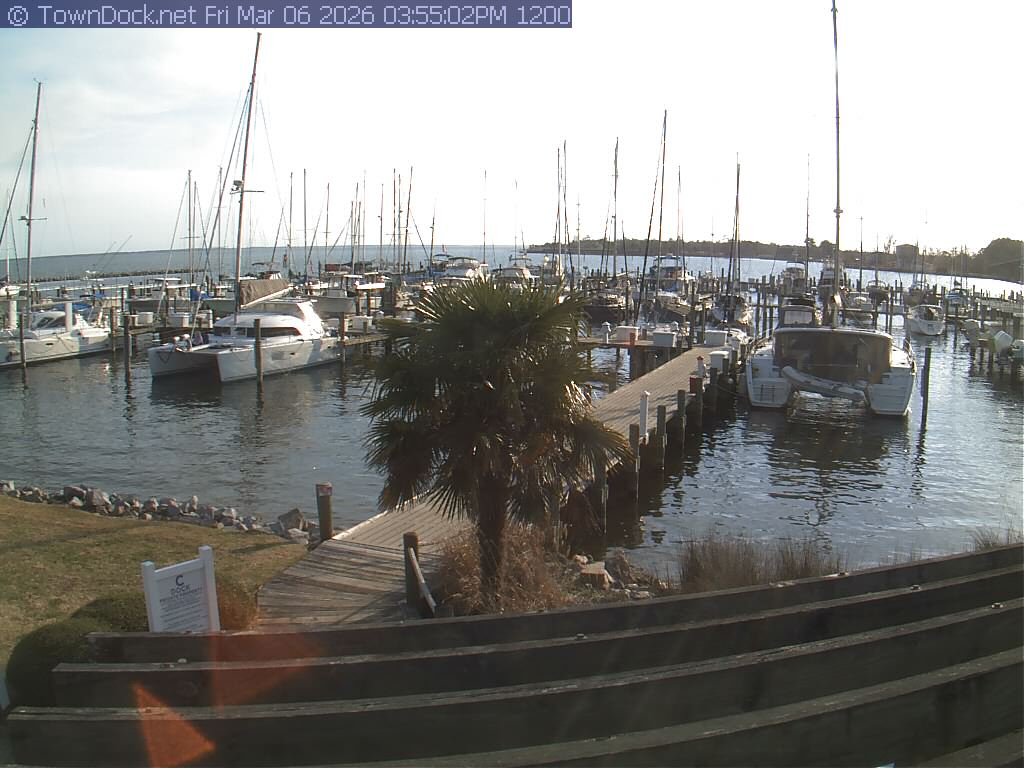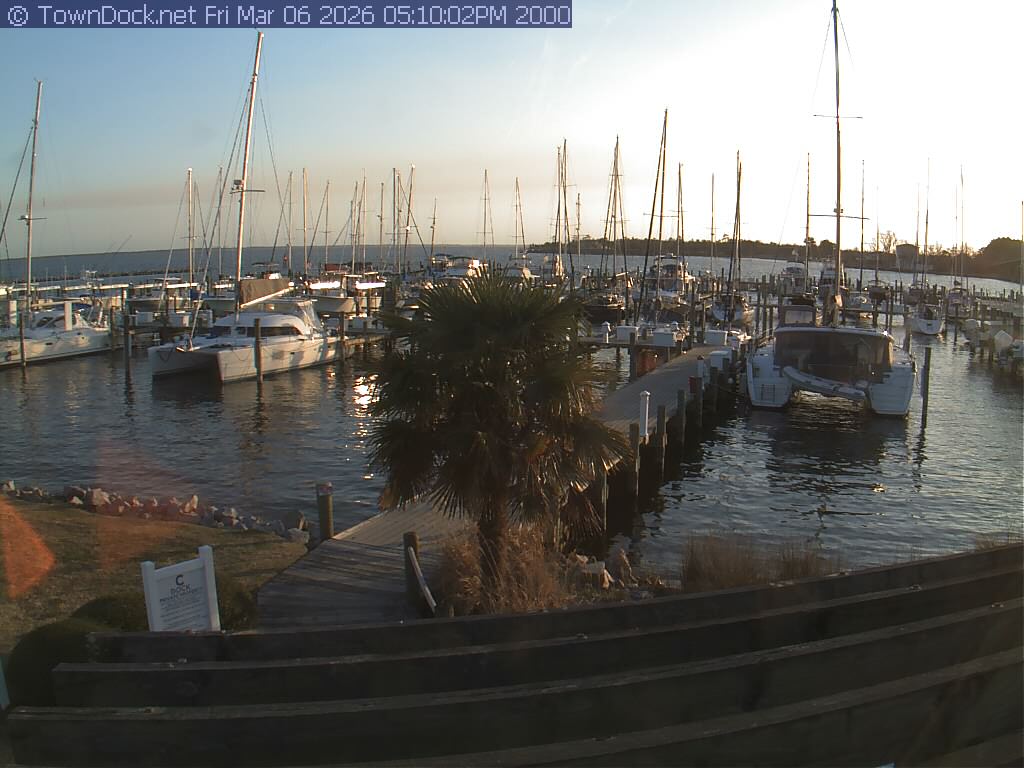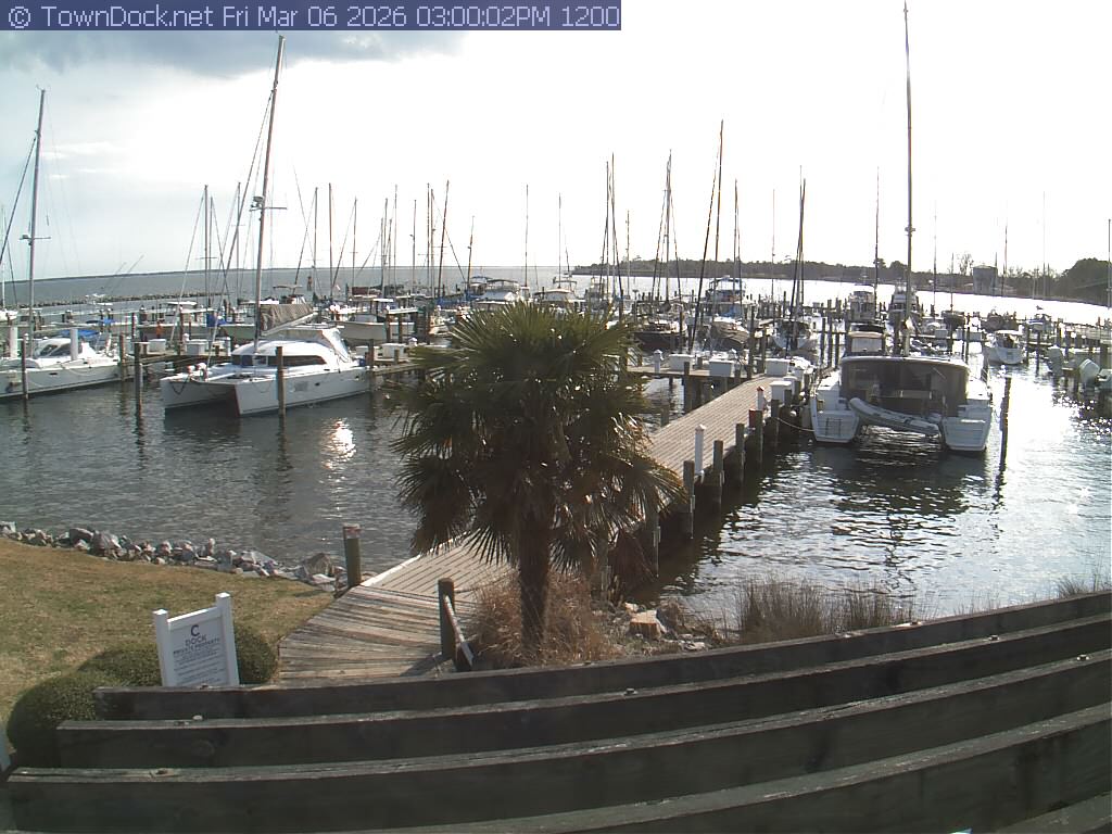 shows Oriental Harbor Village Marina, with the Oriental anchorage & Neuse River in the background. OHVM Cam takes a new picture every five minutes from dawn til just before dusk. Click on the image to see a larger version. Once you see that larger version, you can click (see arrow at right) to go back in time and see recent photos. Harbor Cam currently takes photos from 6:30am to 5:30pm.