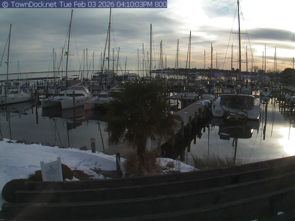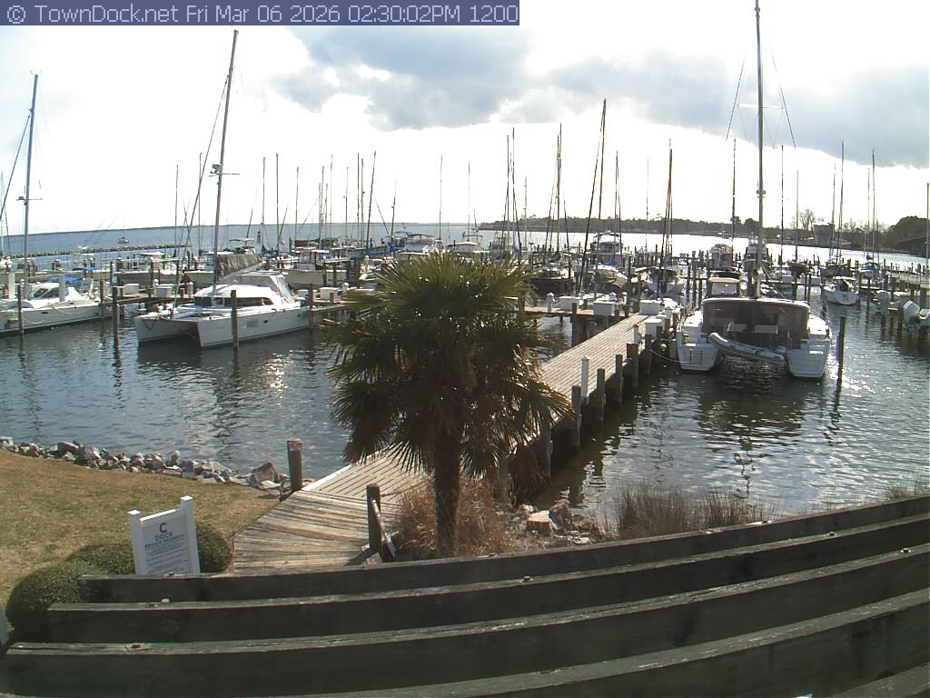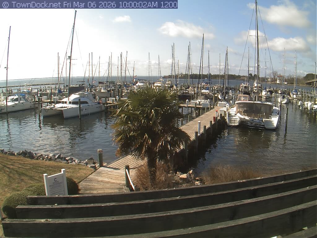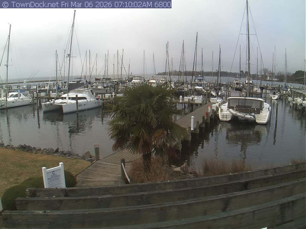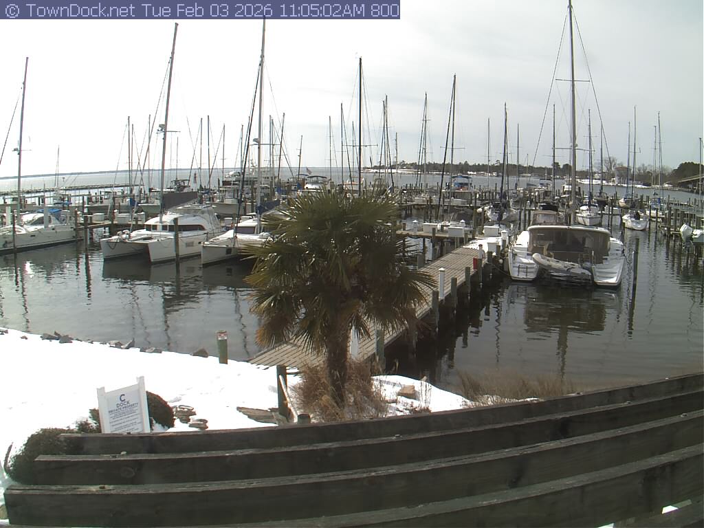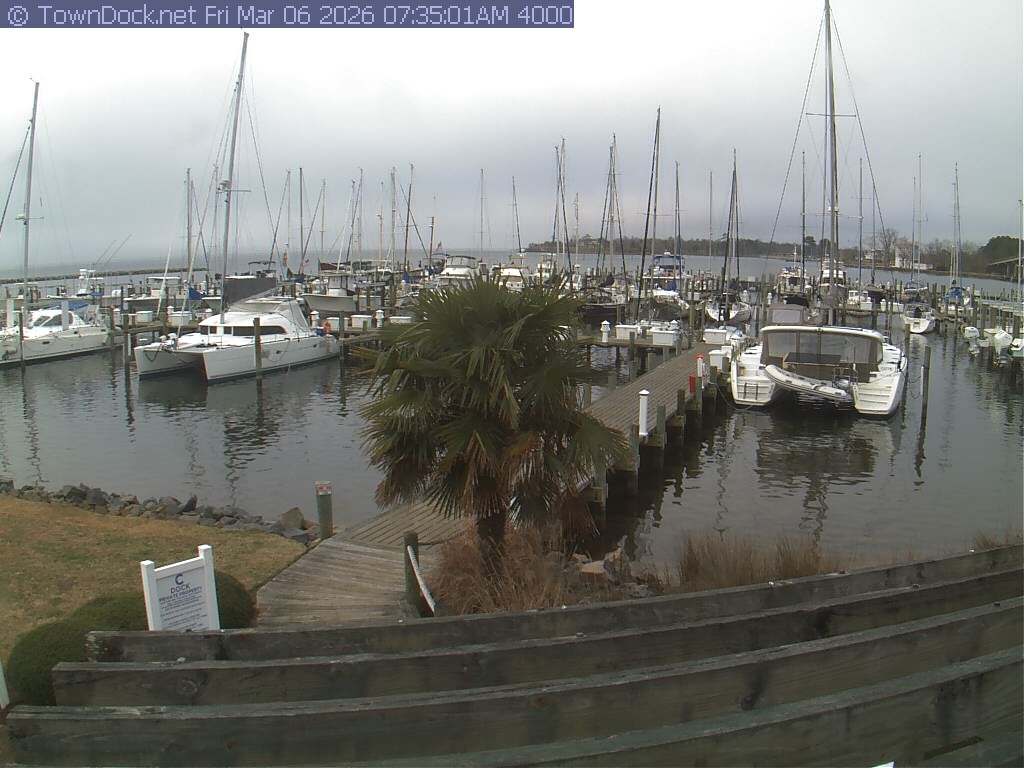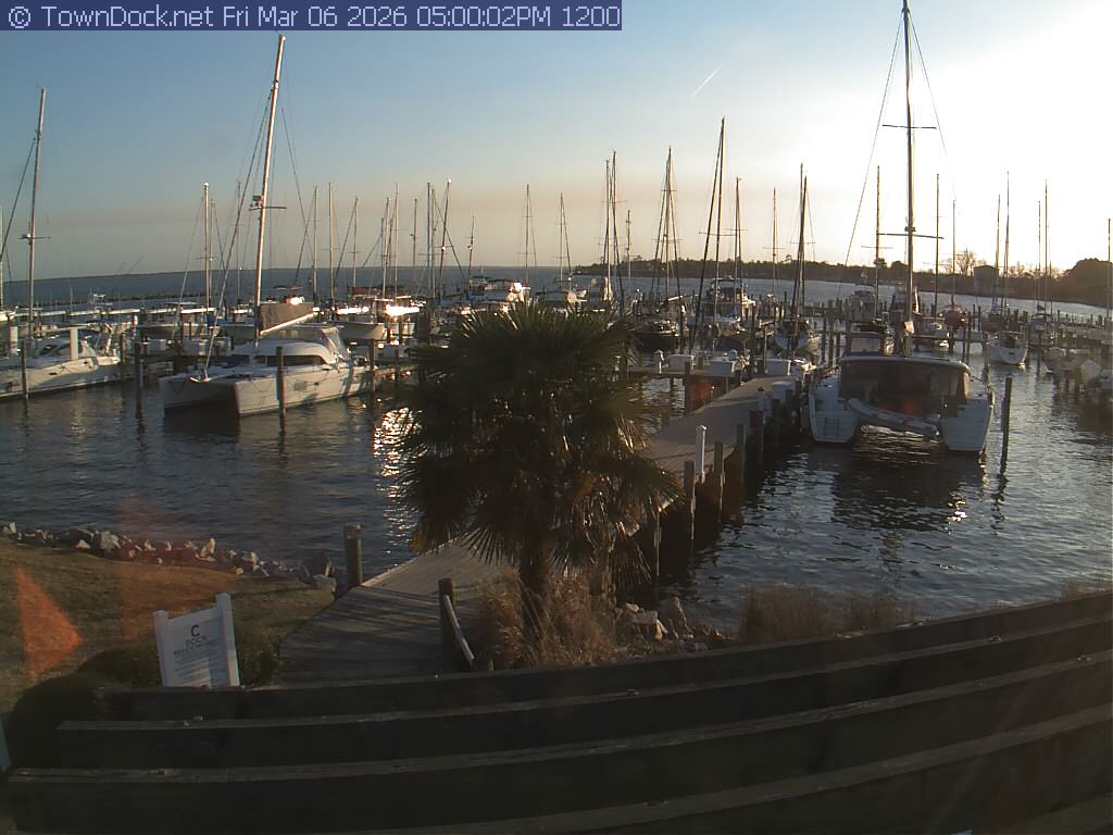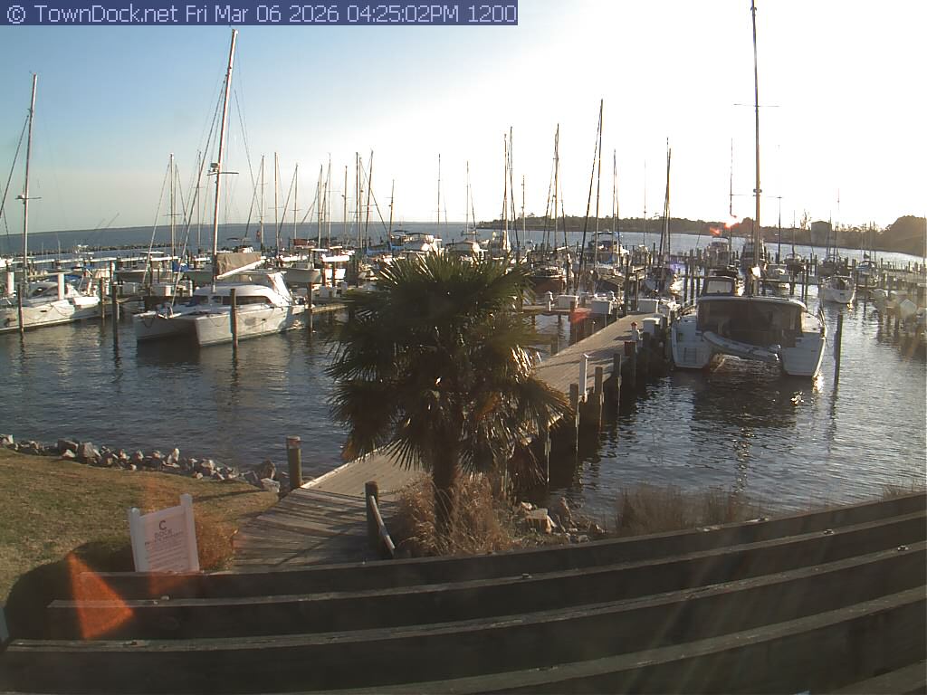 shows Oriental Harbor Village Marina, with the Oriental anchorage & Neuse River in the background. OHVM Cam takes a new picture every five minutes from dawn til just before dusk. Click on the image to see a larger version. Once you see that larger version, you can click (see arrow at right) to go back in time and see recent photos. Harbor Cam currently takes photos from 6:30am to 5:30pm.