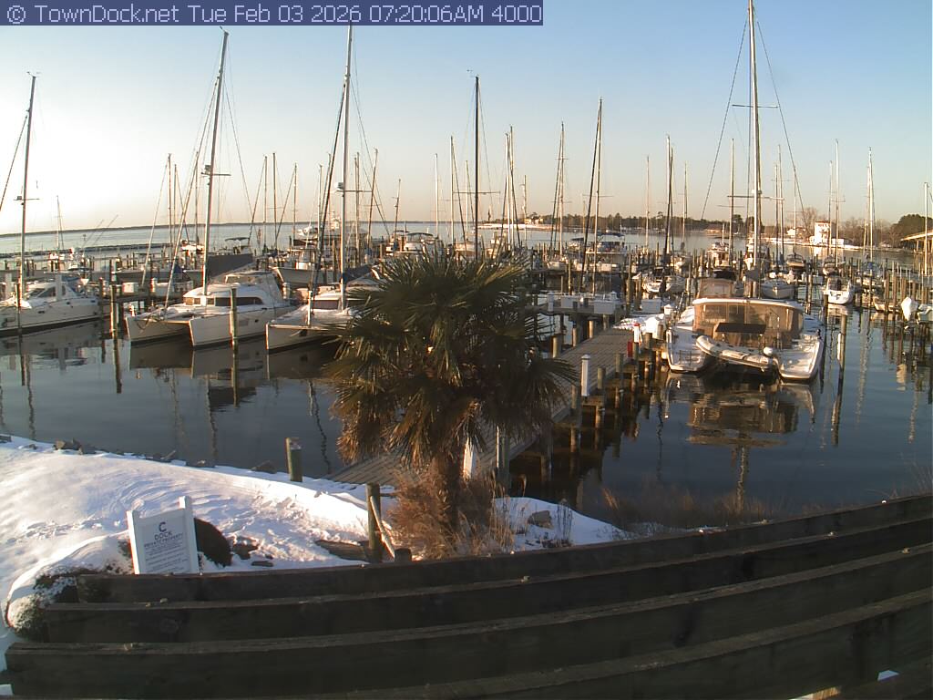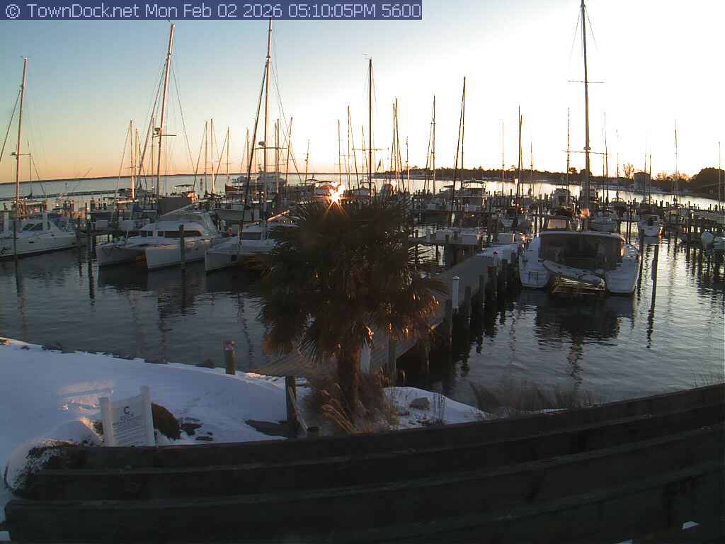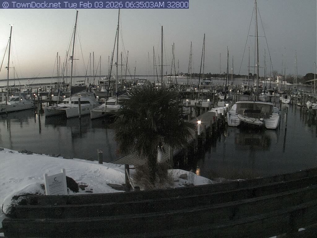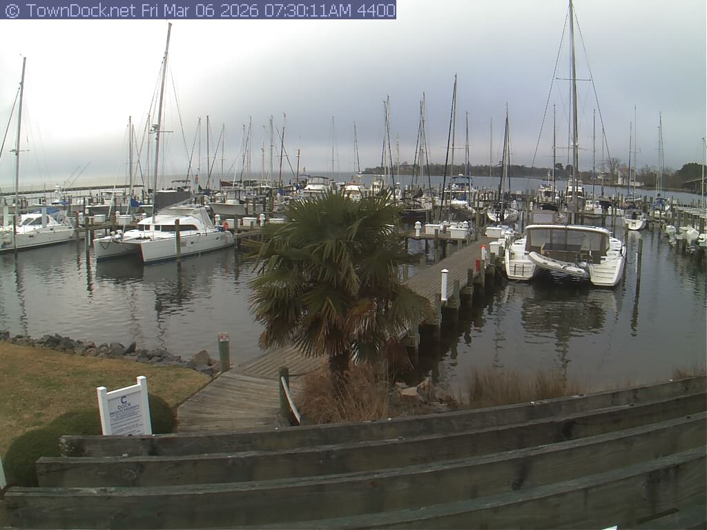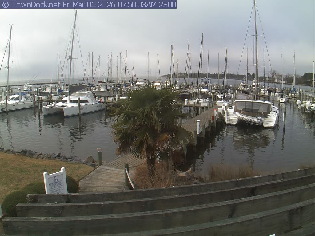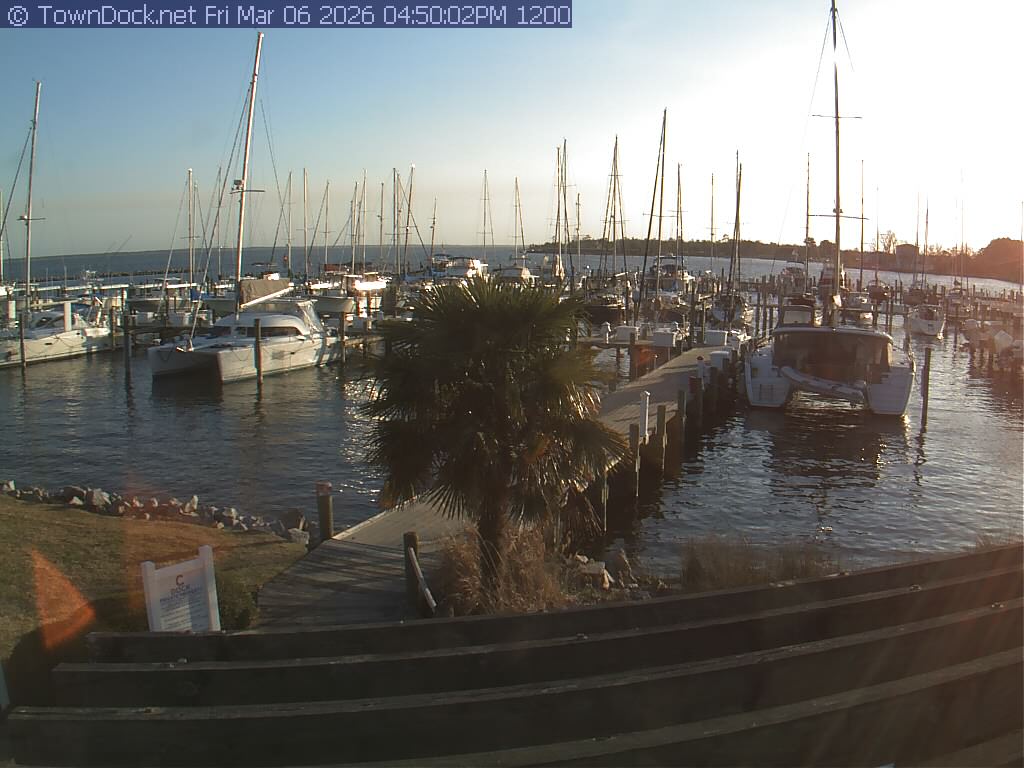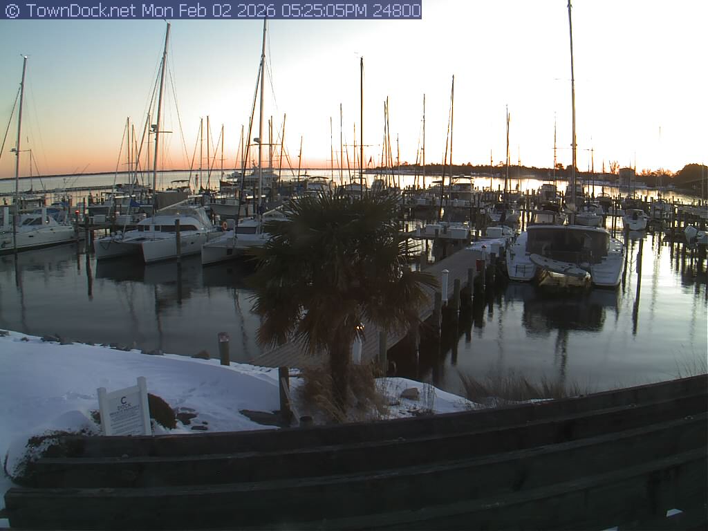 shows Oriental Harbor Village Marina, with the Oriental anchorage & Neuse River in the background. OHVM Cam takes a new picture every five minutes from dawn til just before dusk. Click on the image to see a larger version. Once you see that larger version, you can click (see arrow at right) to go back in time and see recent photos. Harbor Cam currently takes photos from 6:30am to 5:30pm.